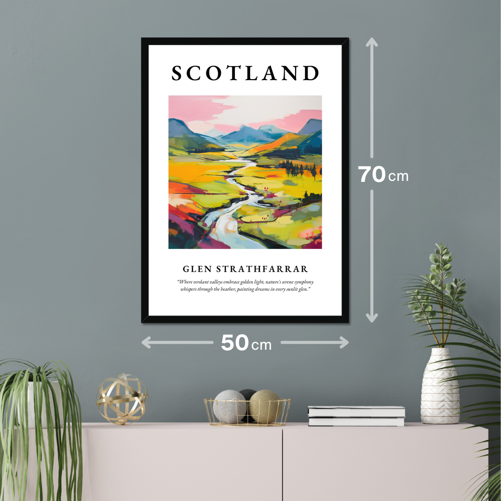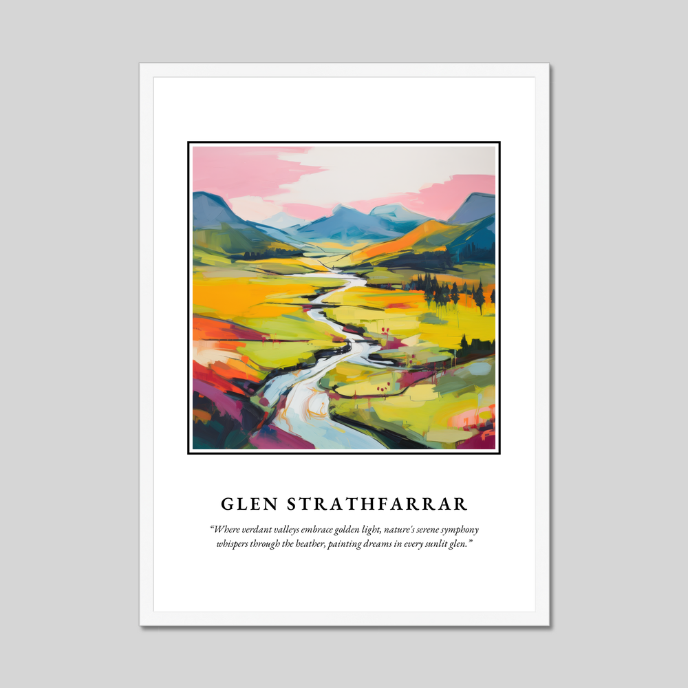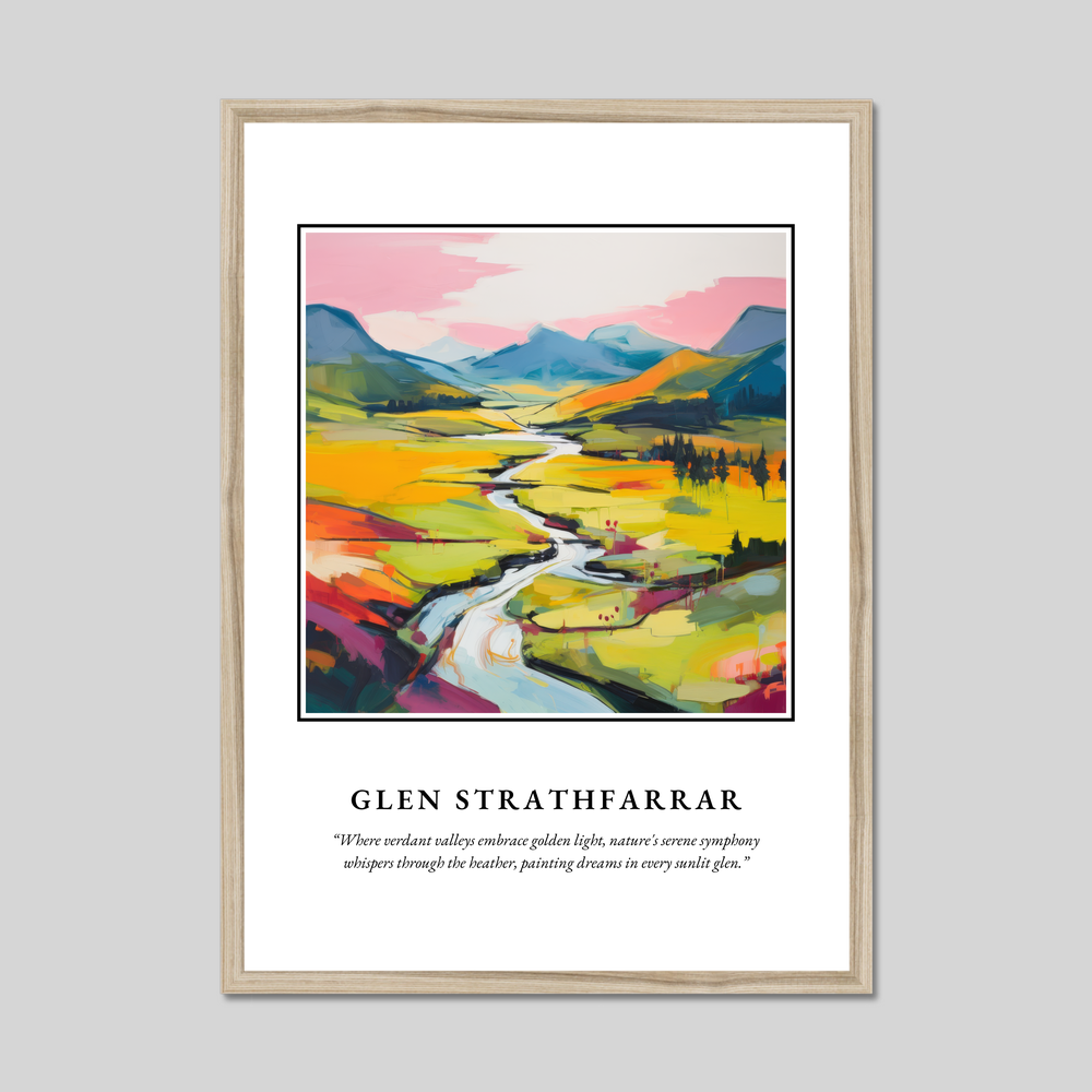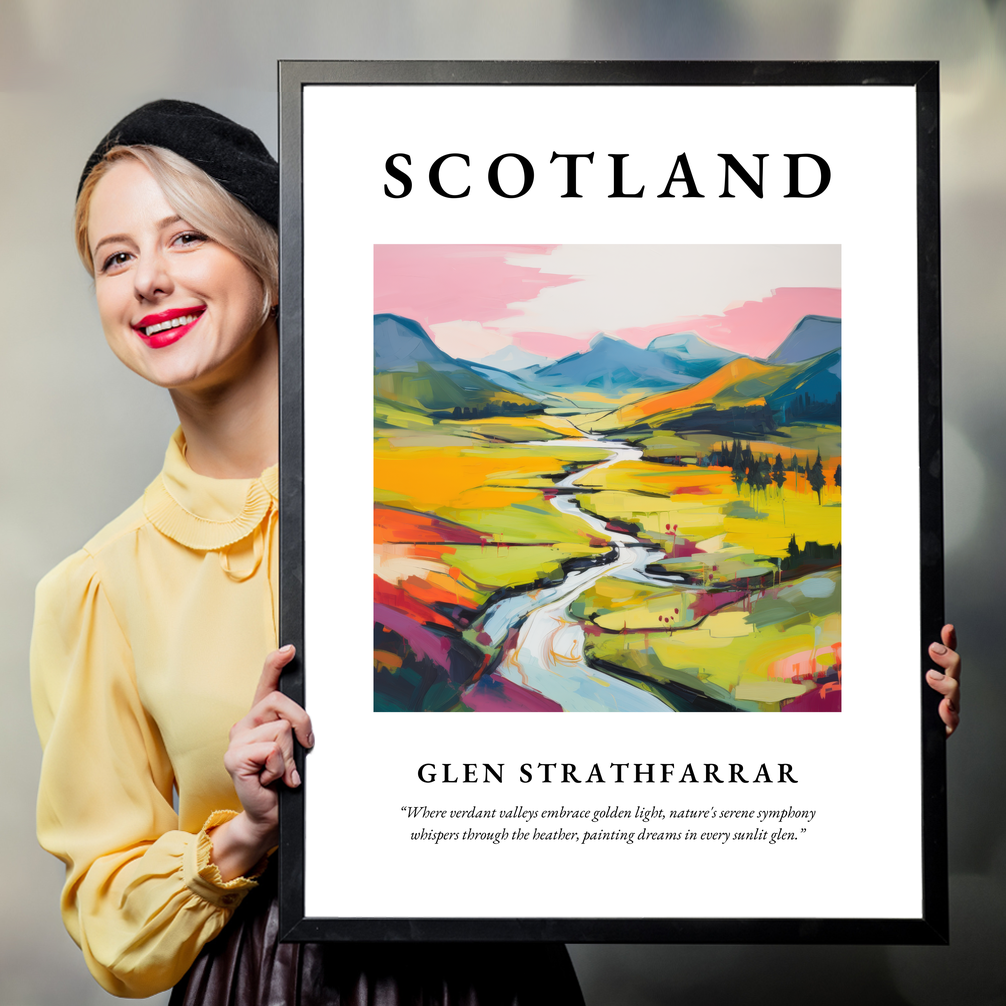 Transform your living space with this striking 50cm x 70cm framed poster print from our “Scotland in Summer” collection. Available in chic black, pristine white, or a natural wood-effect frame, this piece encapsulates the splendour of Scottish landscapes while introducing a vibrant artistic flair to any room. Featuring the majestic Glen Strathfarrar in a mesmerising abstract style, the poster highlights the word “SCOTLAND” boldly at the top, underlining your connection to this beautiful country. Beneath the artwork, the words “Where verdant valleys embrace golden light, nature's serene symphony whispers through the heather, painting dreams in every sunlit glen” add an emotional depth that resonates with admirers of both art and nature.