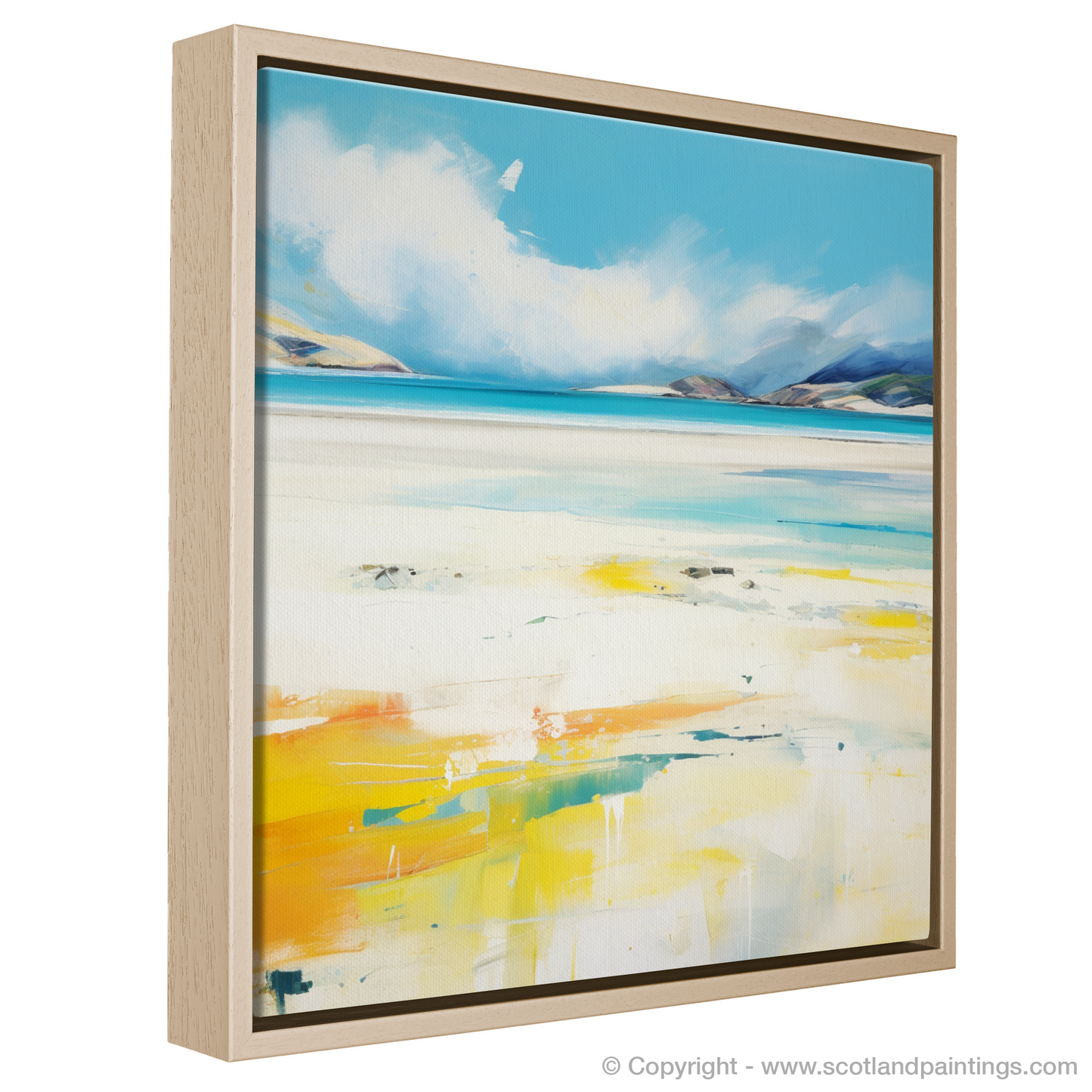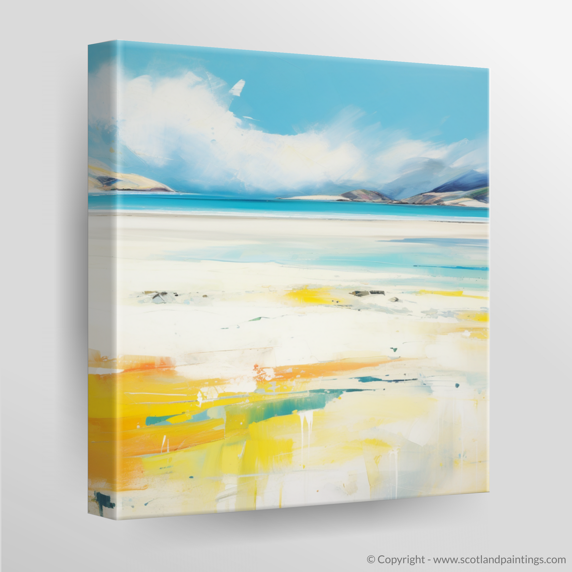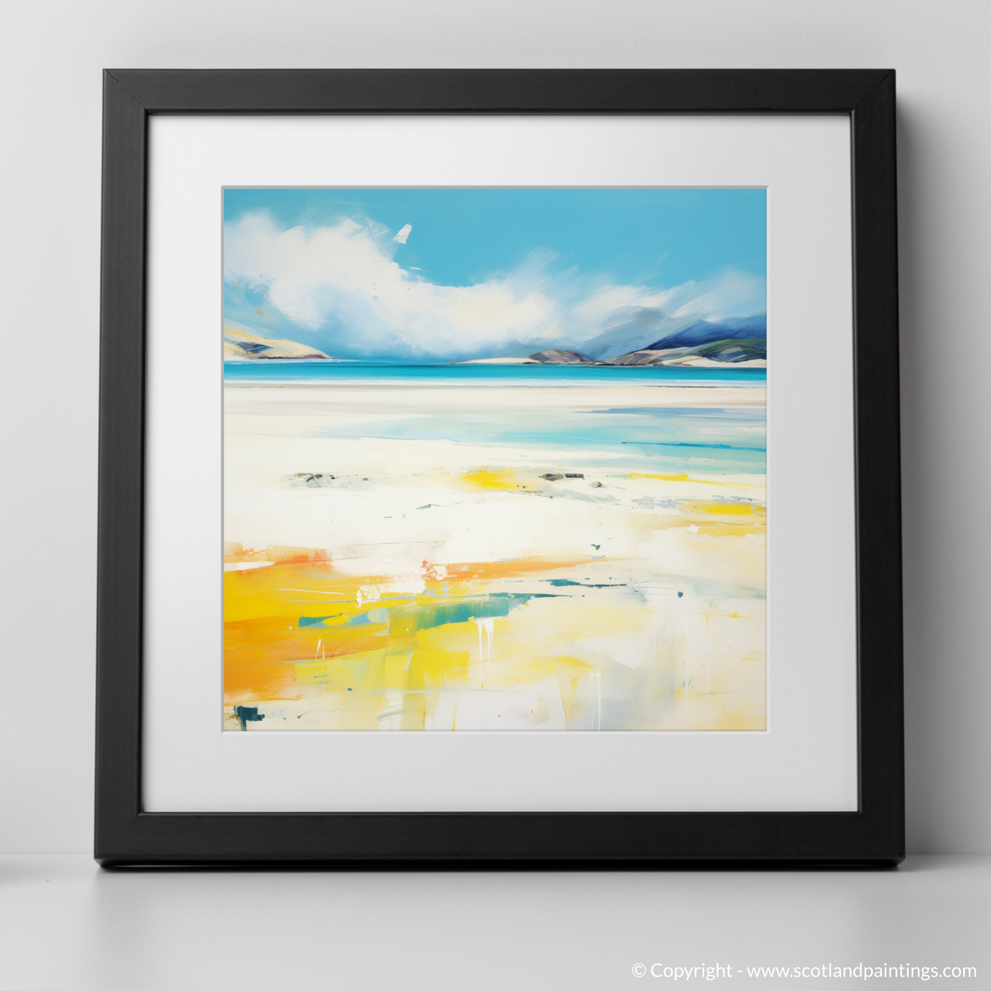 Capturing the essence of summer on the Isle of Harris, this abstract print presents a vivid interpretation of Luskentyre Beach's expansive beauty. The artwork boasts a palette of serene blues and bright whites, representing the clear sky and pristine sands, fragmenting into a kaleidoscope of yellow and cream hues, reminiscent of the warm sunlight dancing across the shoreline.