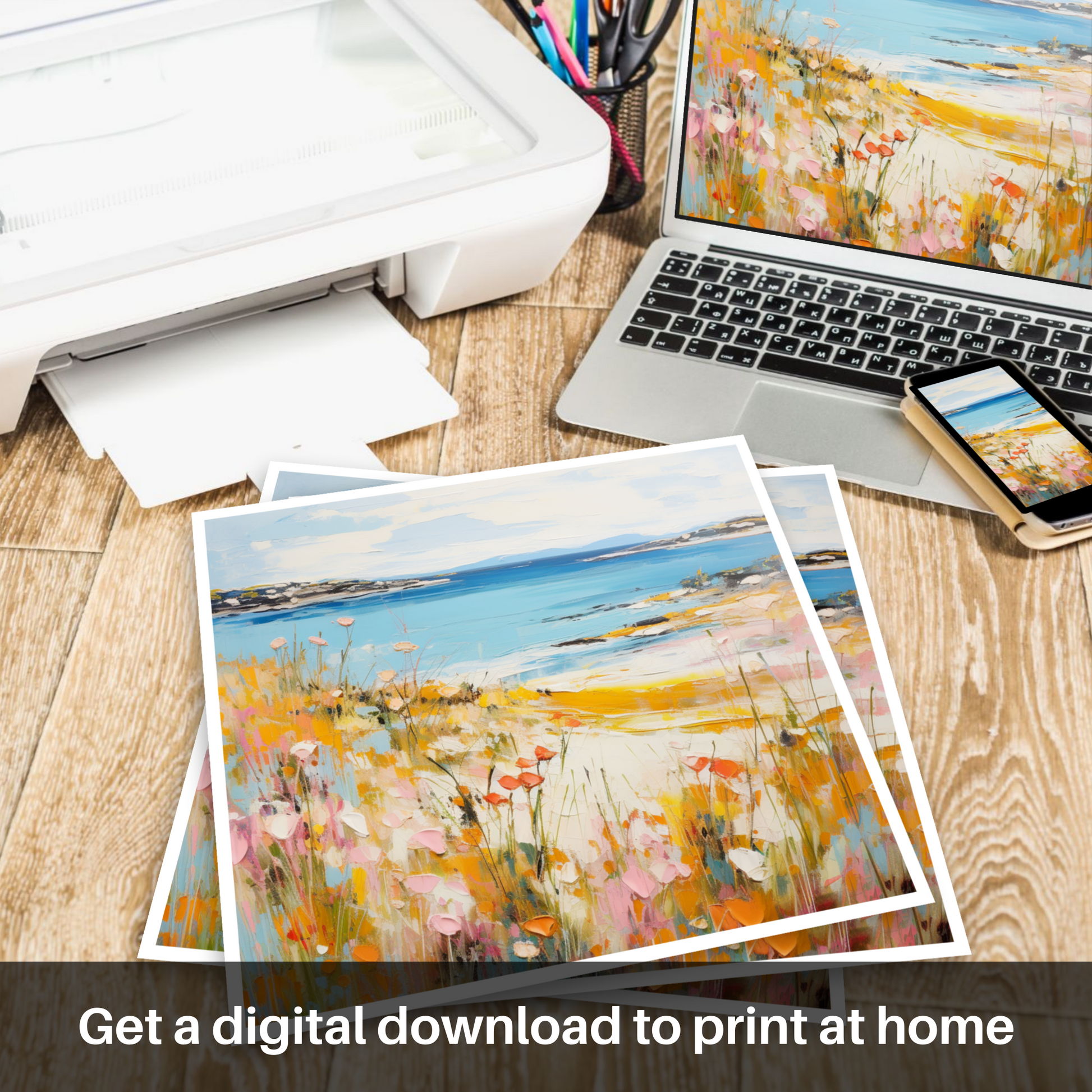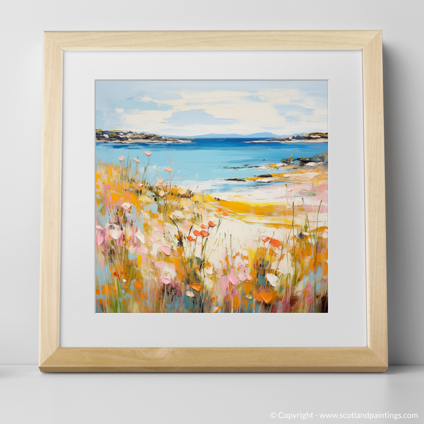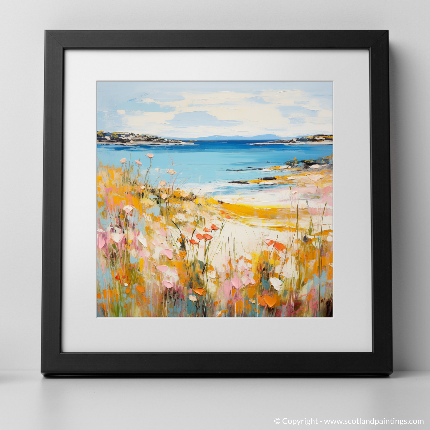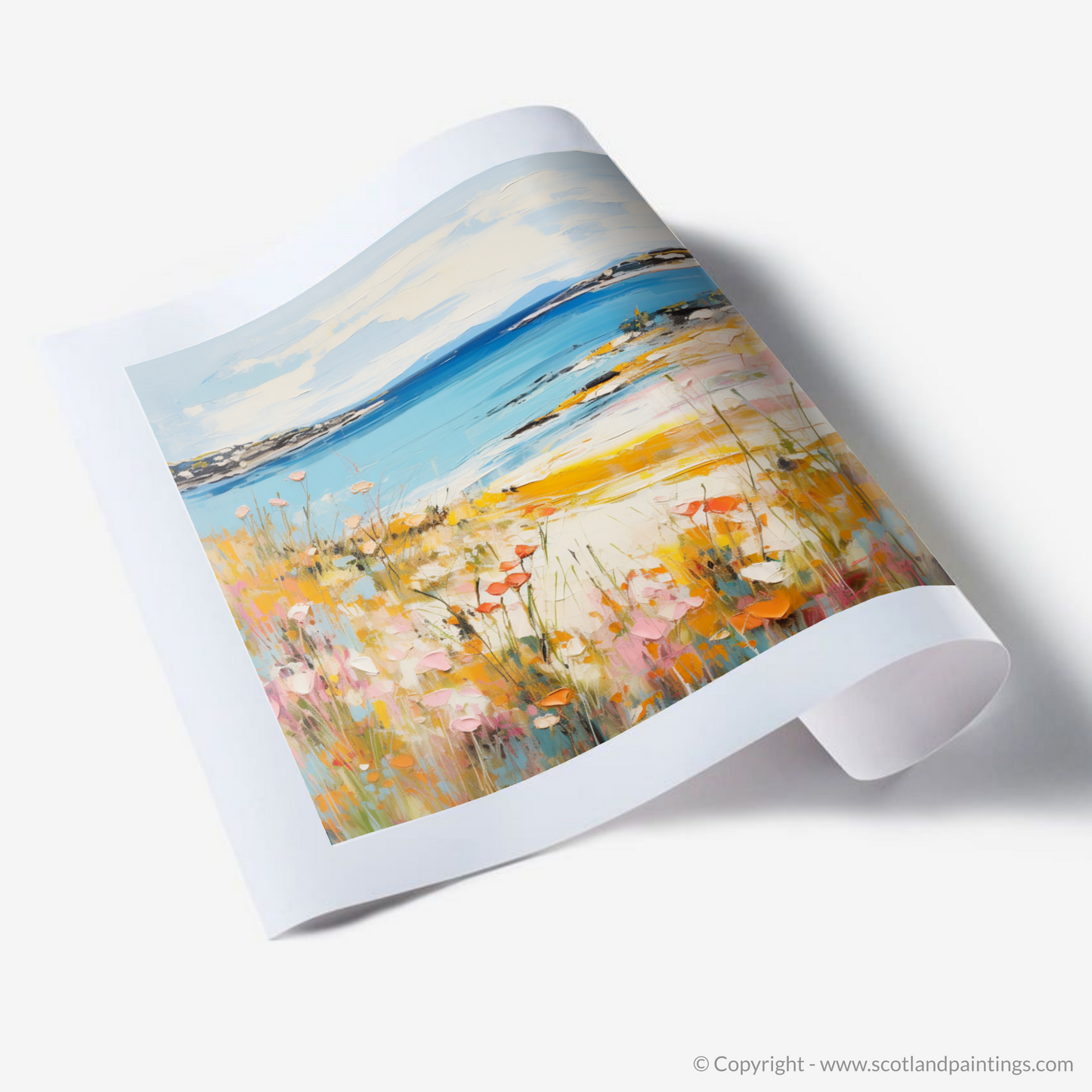 Capturing the essence of summer on the Isle of Gigha, this evocative print draws the viewer into a vibrant tableau of natural beauty. The foreground is a celebration of wild flora, with paint daubs conjuring an array of blossoming flowers in hues of pink, red, and orange, peppered with delicate touches of white. These rich, warm colours stand in vivid contrast with the cool blues of the sea, suggesting a gentle breeze moving through the air.