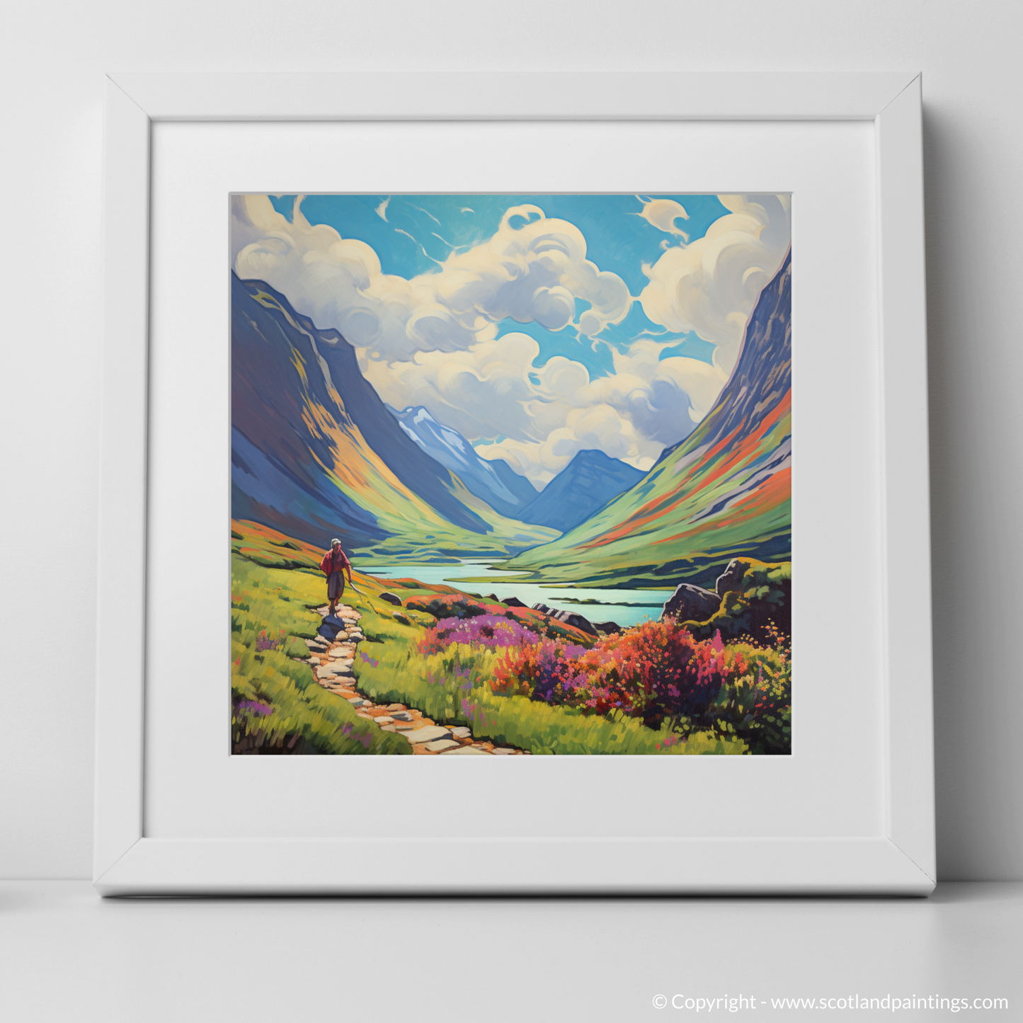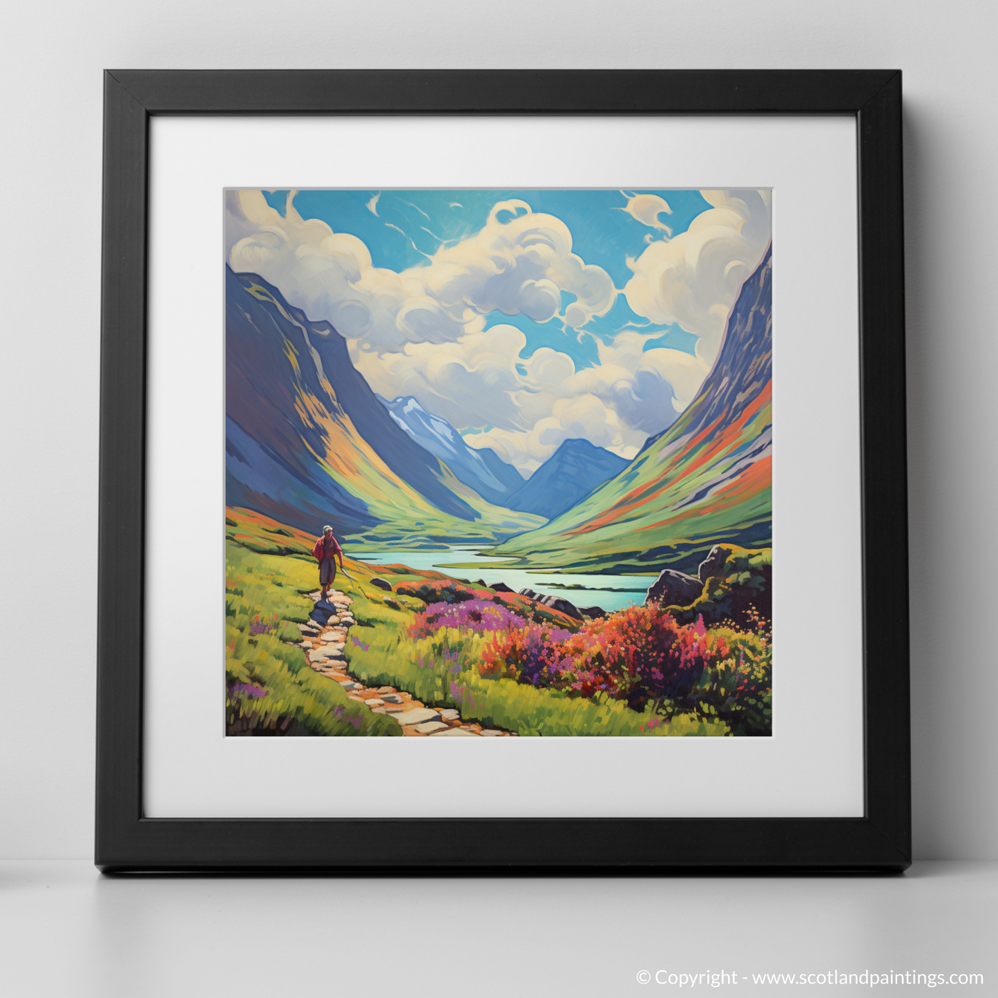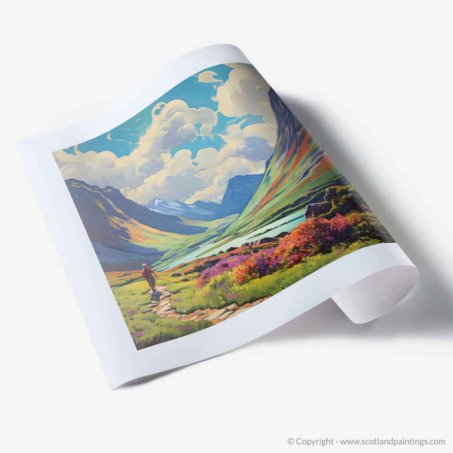 Capture the serene beauty of Scotland's sublime landscapes with this evocative print. The artwork transports viewers to Glencoe, where summer unfurls in a symphony of colour and light. A lone hiker takes a sojourn through this majestic valley, their presence a harmonious note in the vastness of nature's splendour.