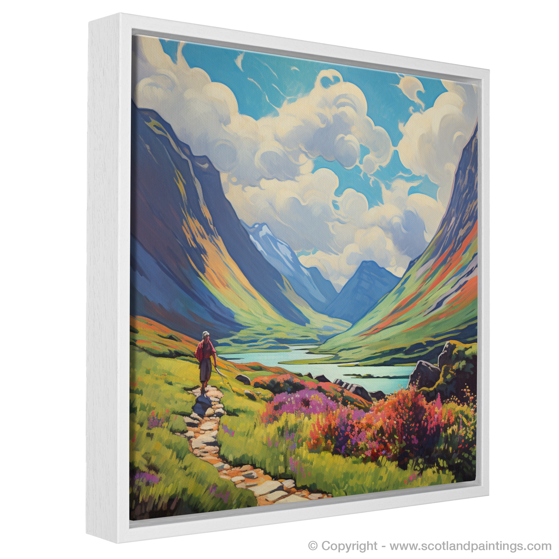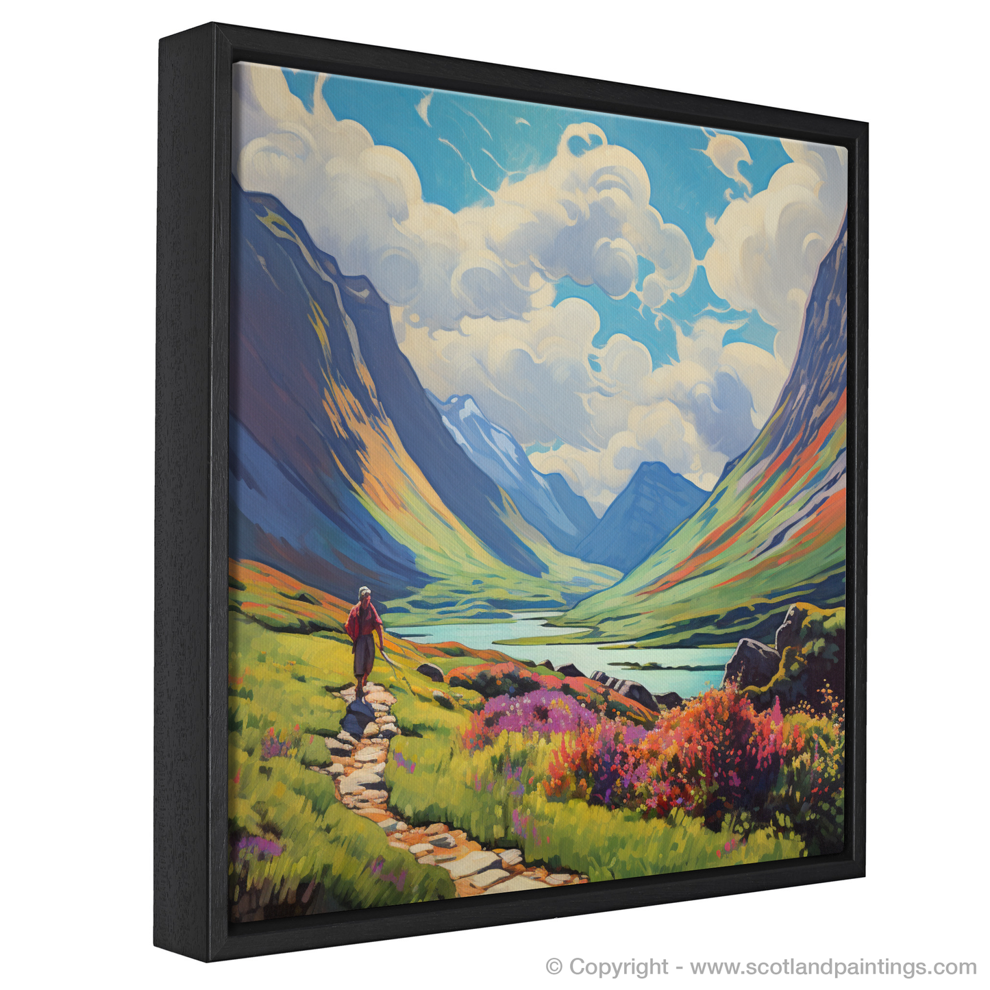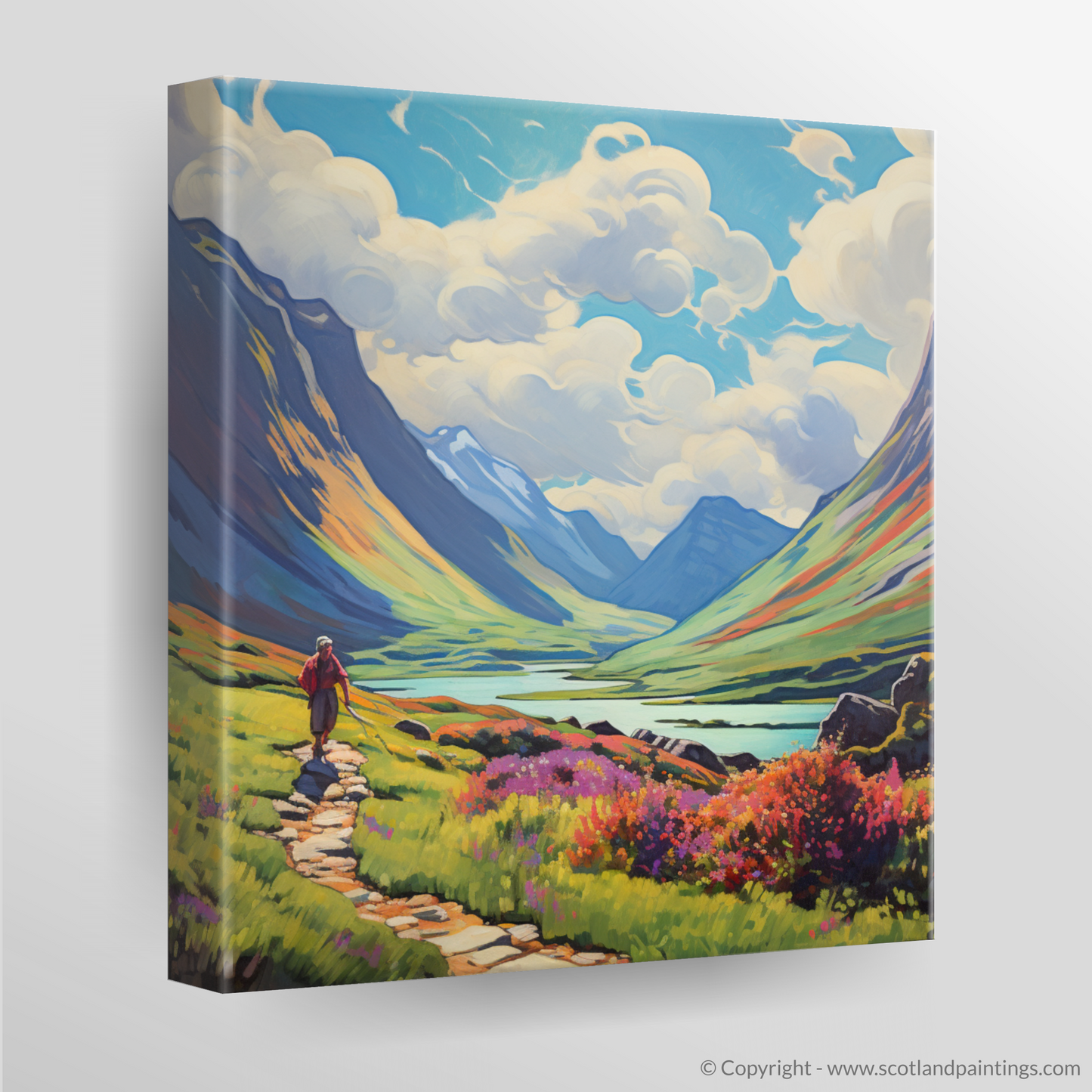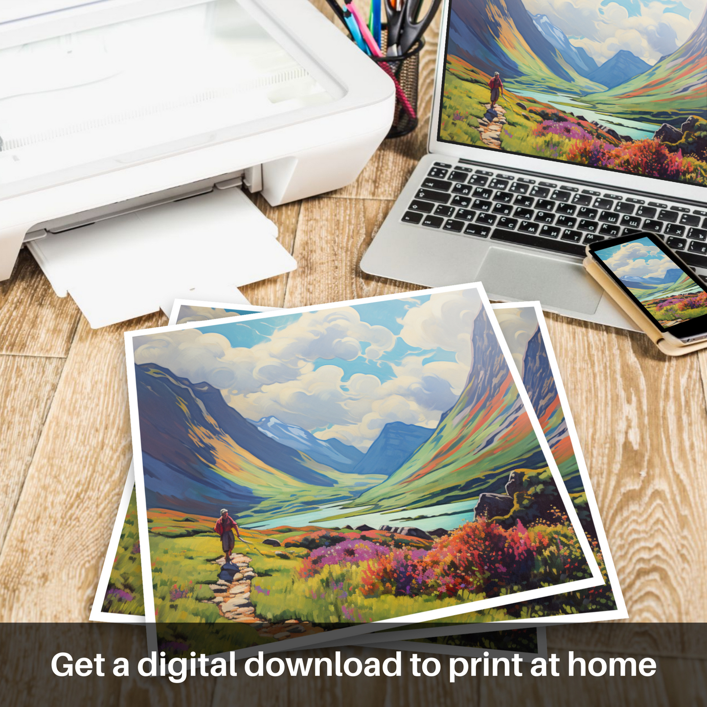 Capture the serene beauty of Scotland's sublime landscapes with this evocative print. The artwork transports viewers to Glencoe, where summer unfurls in a symphony of colour and light. A lone hiker takes a sojourn through this majestic valley, their presence a harmonious note in the vastness of nature's splendour.