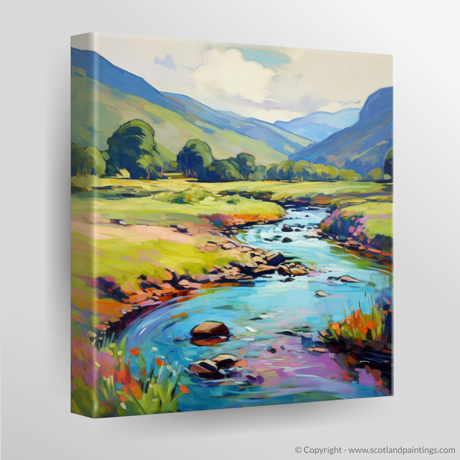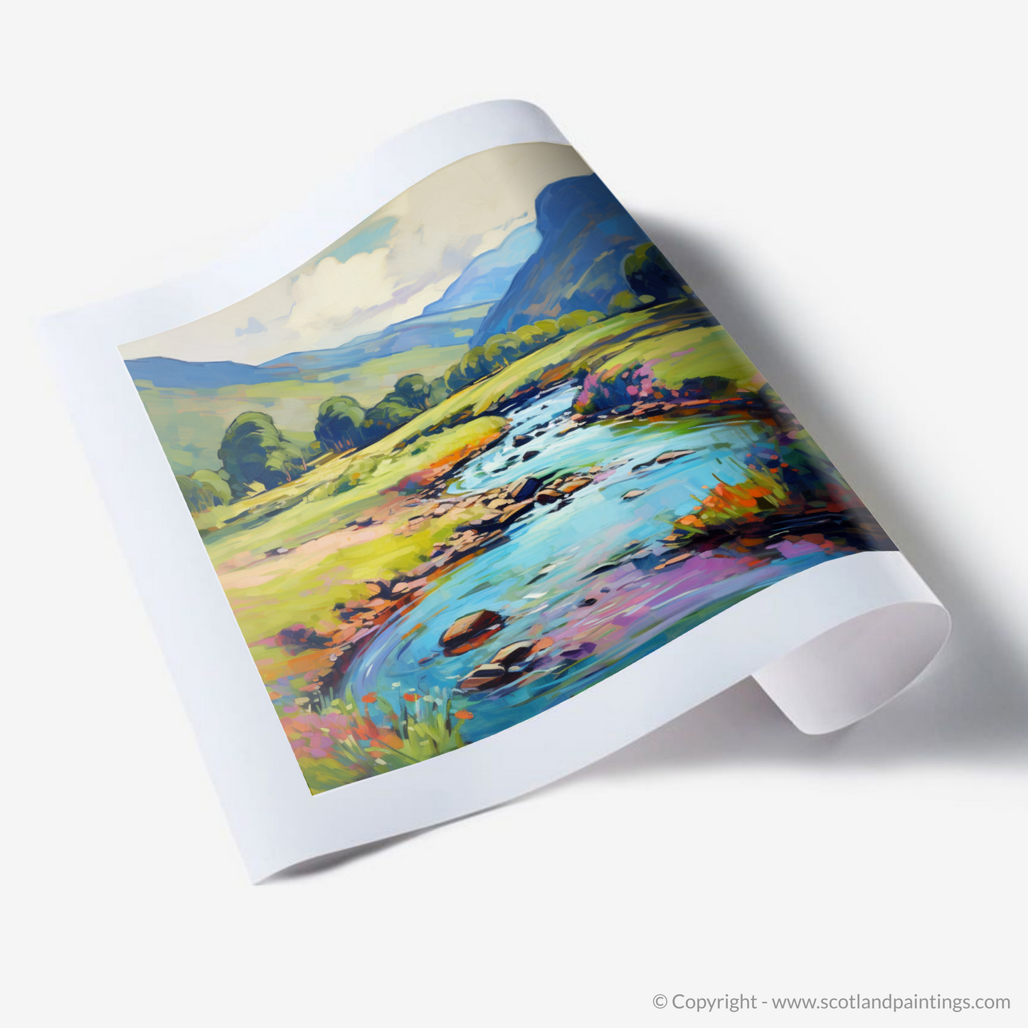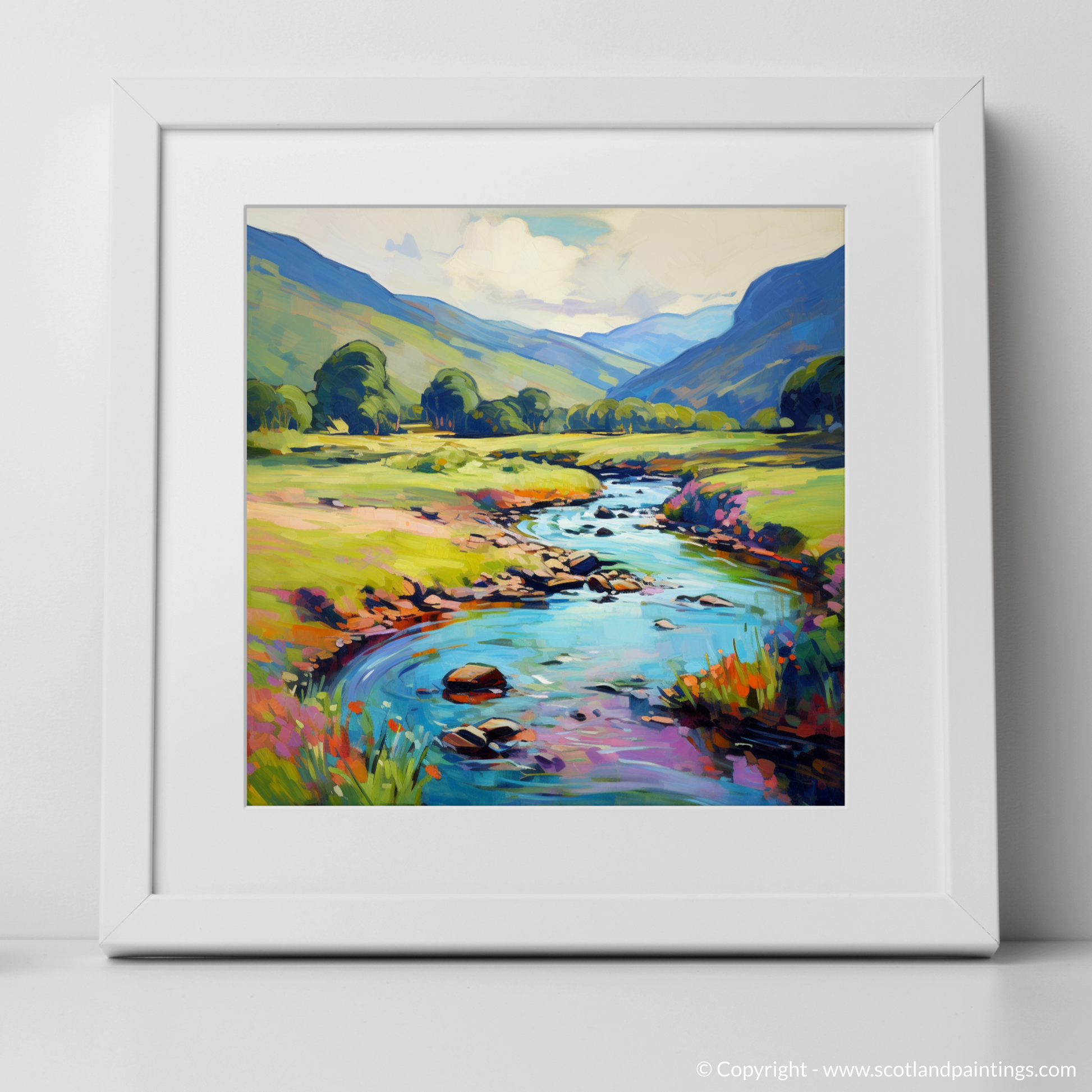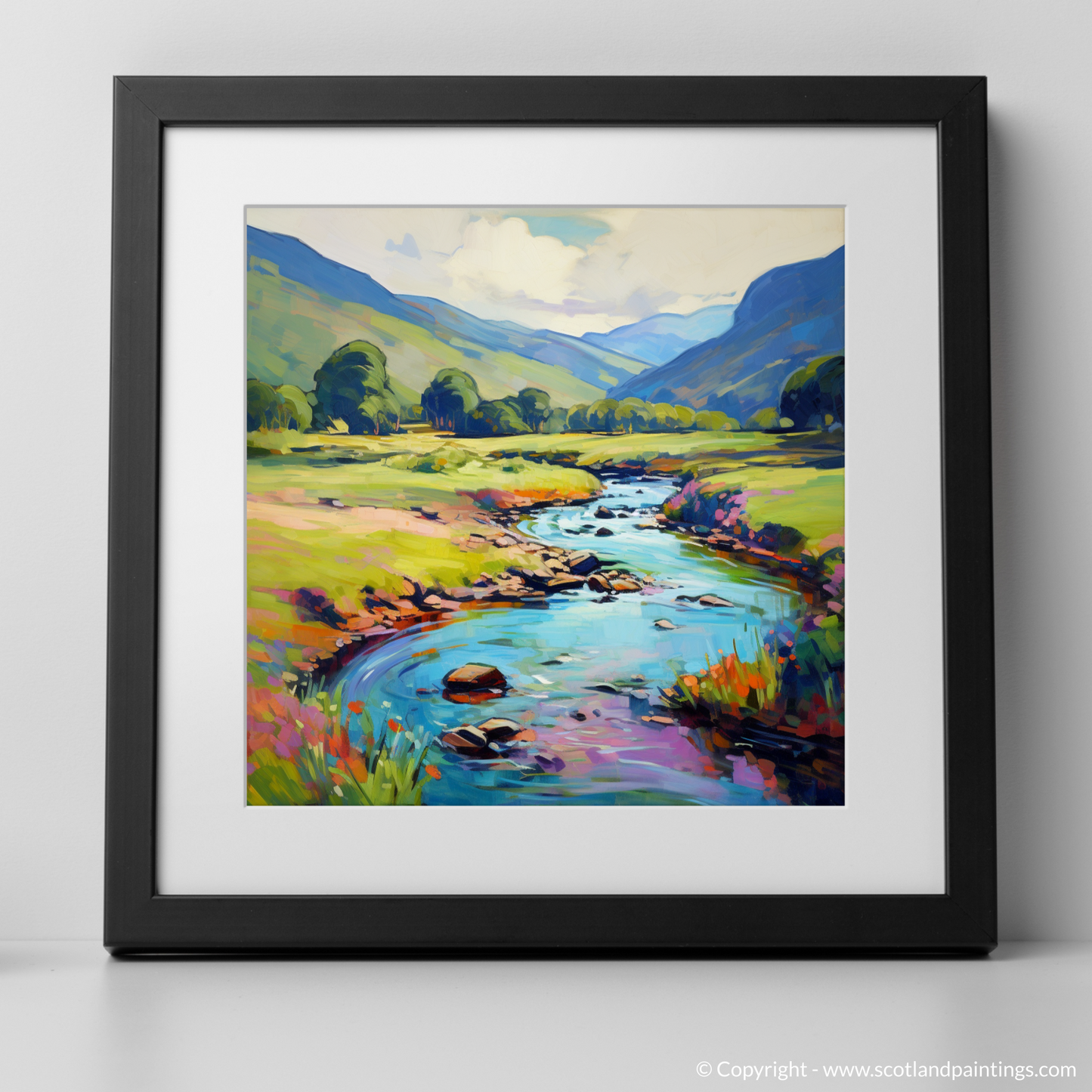 Capturing the essence of Glen Lyon in Perthshire during the height of summer, this vibrant print breathes life into any space. The artwork is a visual feast, characterised by bold, expressive brushstrokes typical of the Fauvist style, where colour is king. Verdant hues of grass and foliage blend harmoniously with the intense blues of the meandering river, which reflects a dance of sunlight and sky.