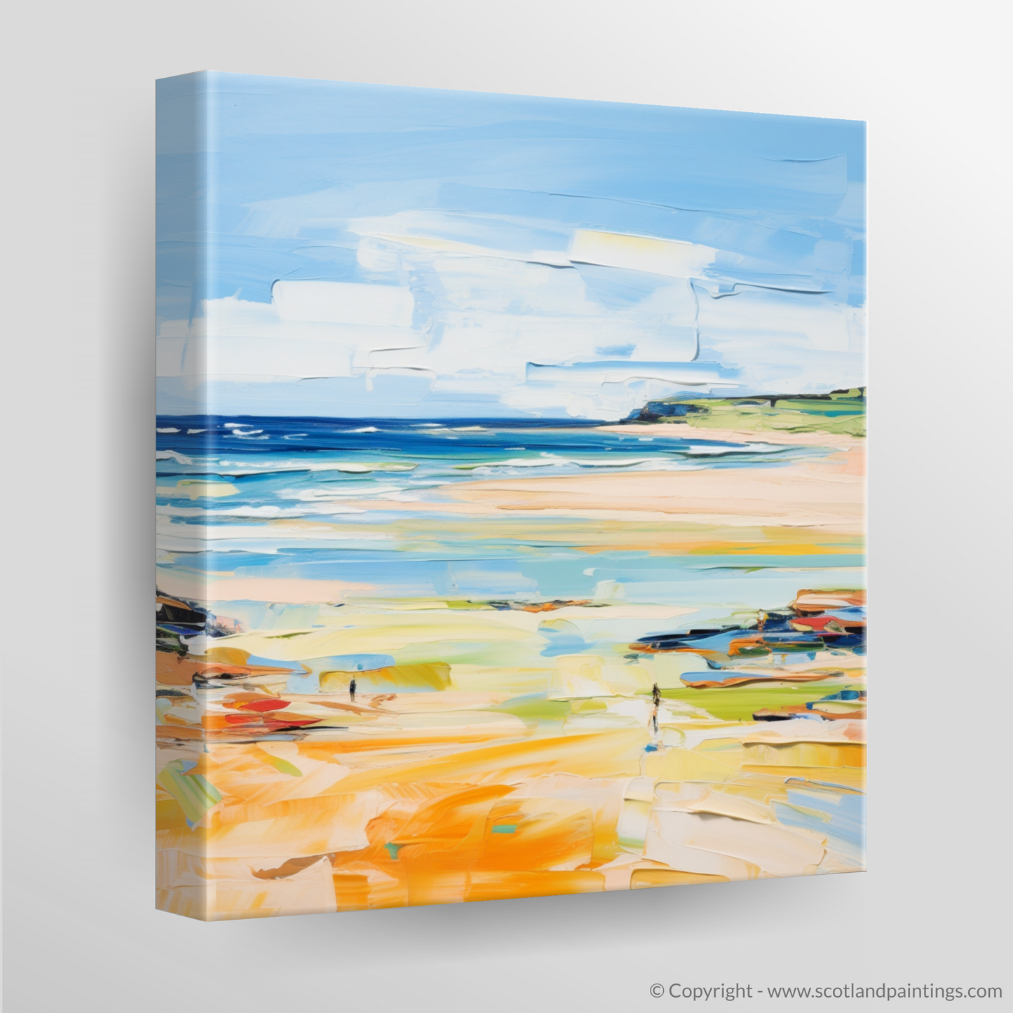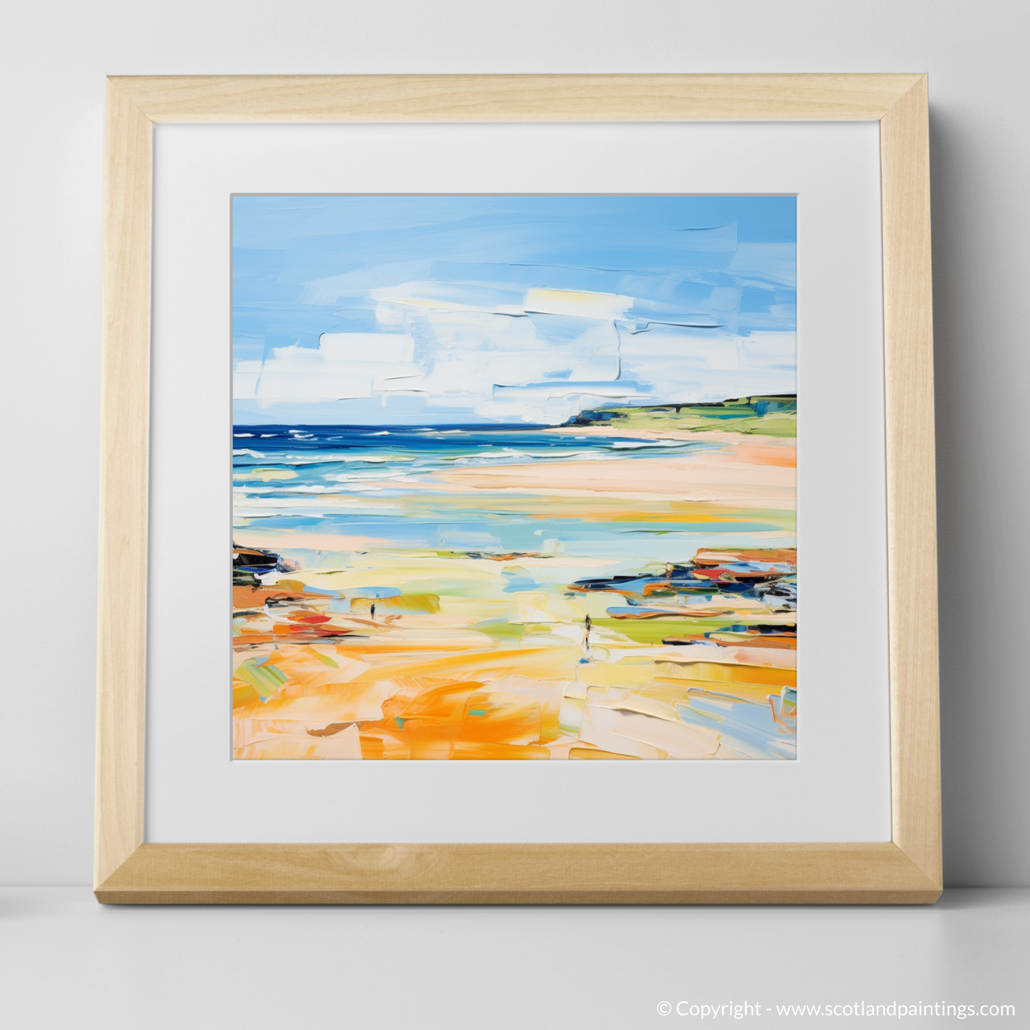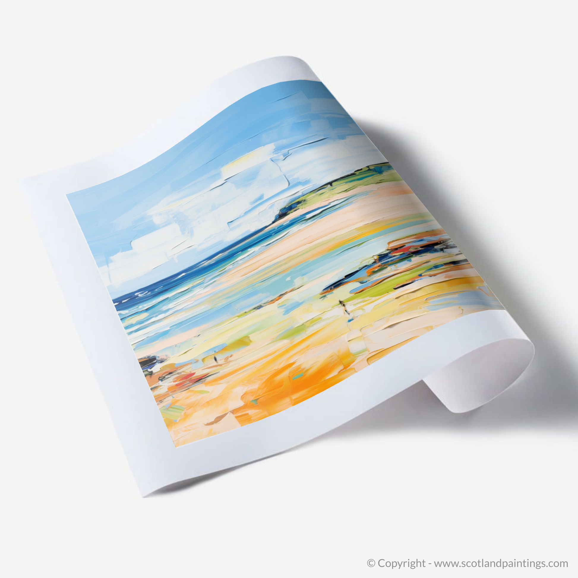 Channel the essence of a Scottish summer with this vibrant abstract interpretation of St Cyrus Beach, Aberdeenshire. This composition is an explosion of colour, capturing the warmth and dynamism of the coast under the summer sky. Broad, expressive brushstrokes convey the vast expanses of the sandy shores, where strokes of creamy yellows and soft whites merge seamlessly with the subtle hues of beige and gold, reminiscent of sunlit sand.