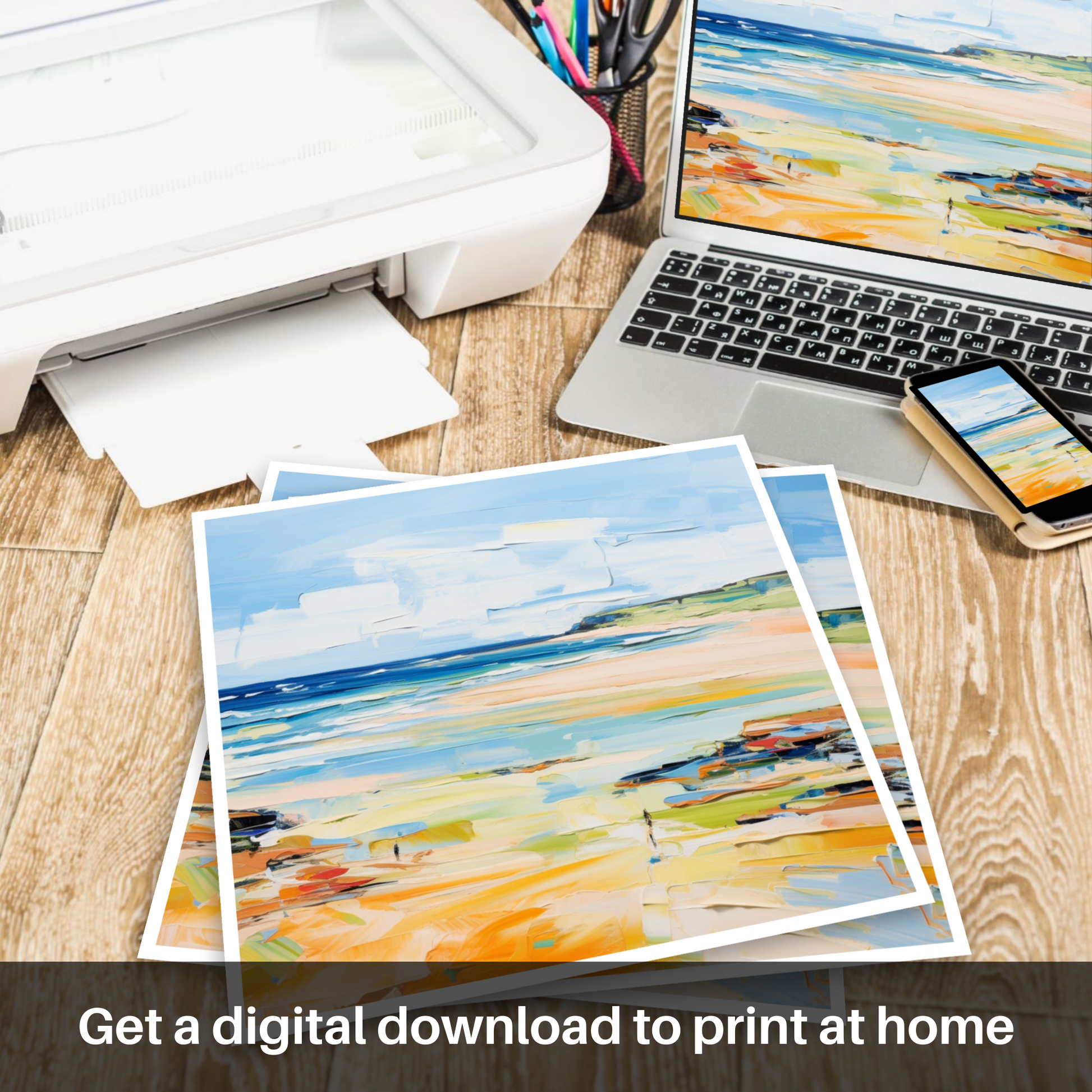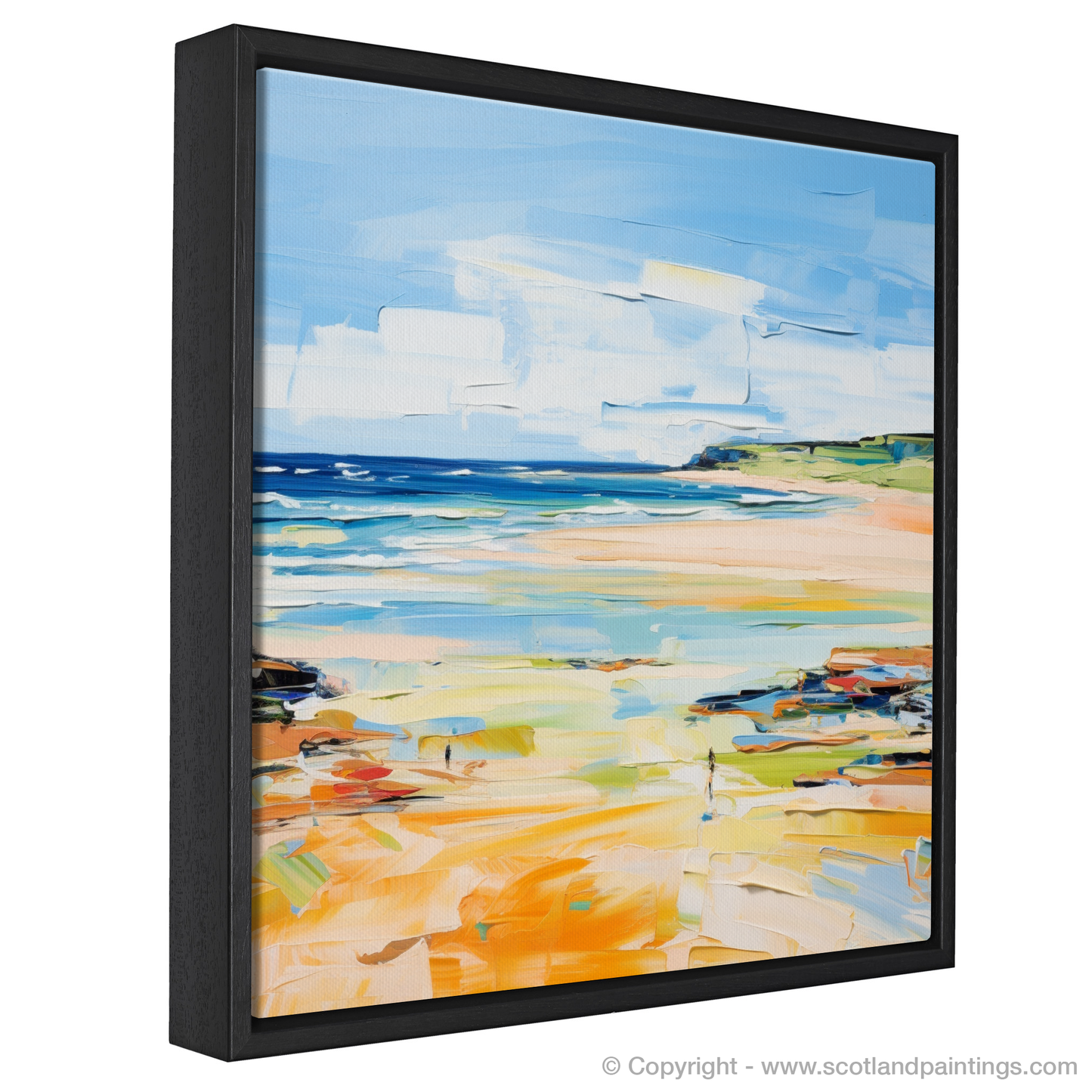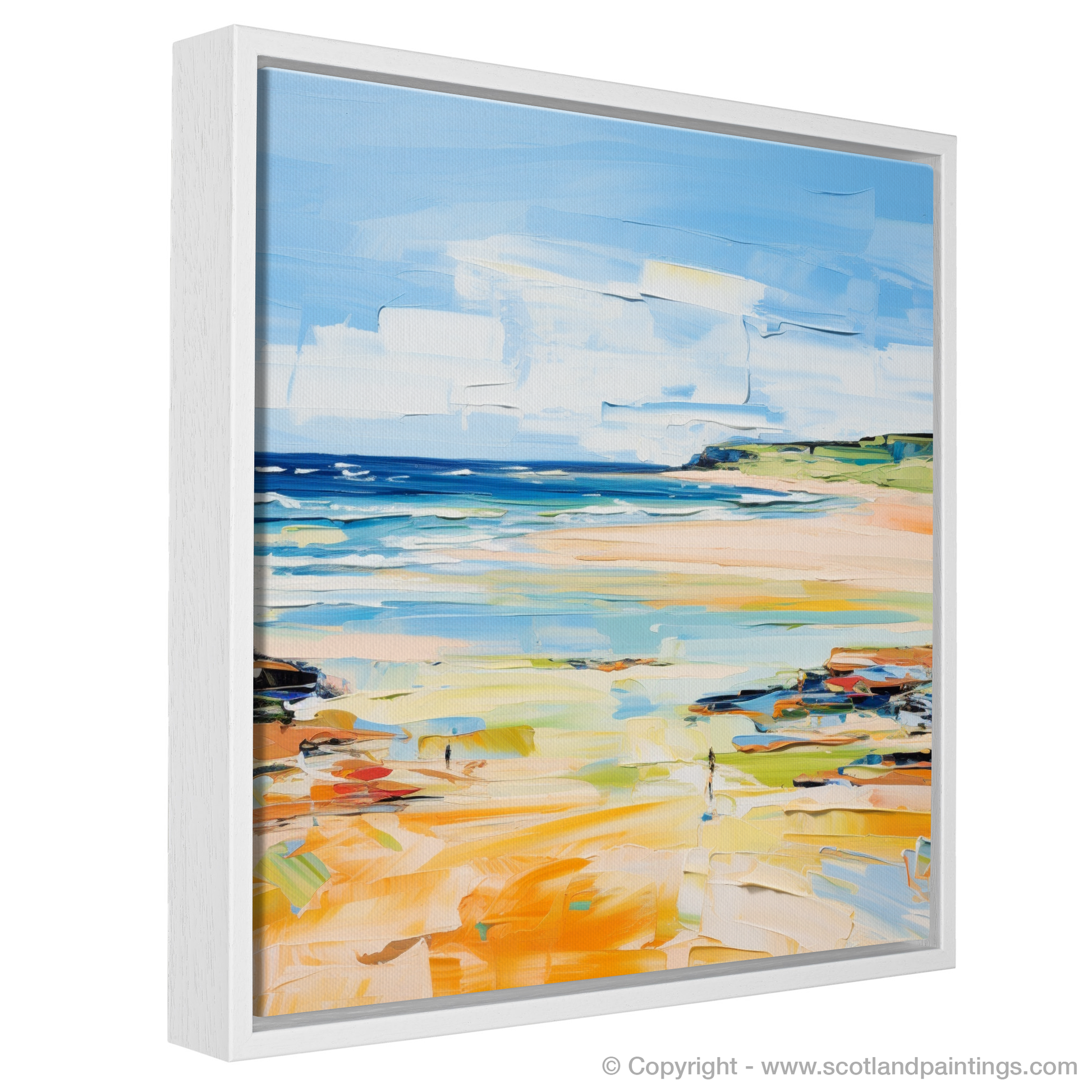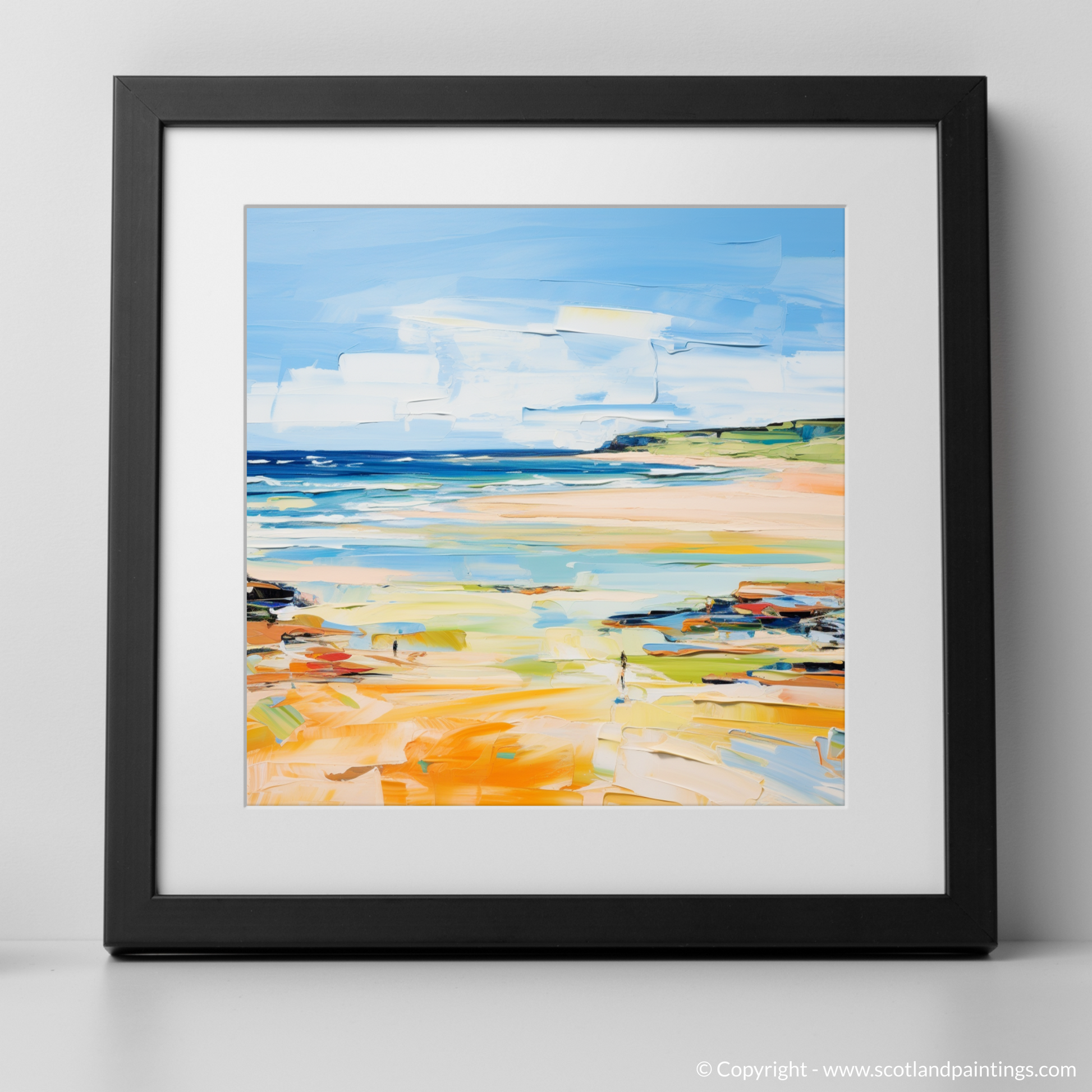 Channel the essence of a Scottish summer with this vibrant abstract interpretation of St Cyrus Beach, Aberdeenshire. This composition is an explosion of colour, capturing the warmth and dynamism of the coast under the summer sky. Broad, expressive brushstrokes convey the vast expanses of the sandy shores, where strokes of creamy yellows and soft whites merge seamlessly with the subtle hues of beige and gold, reminiscent of sunlit sand.