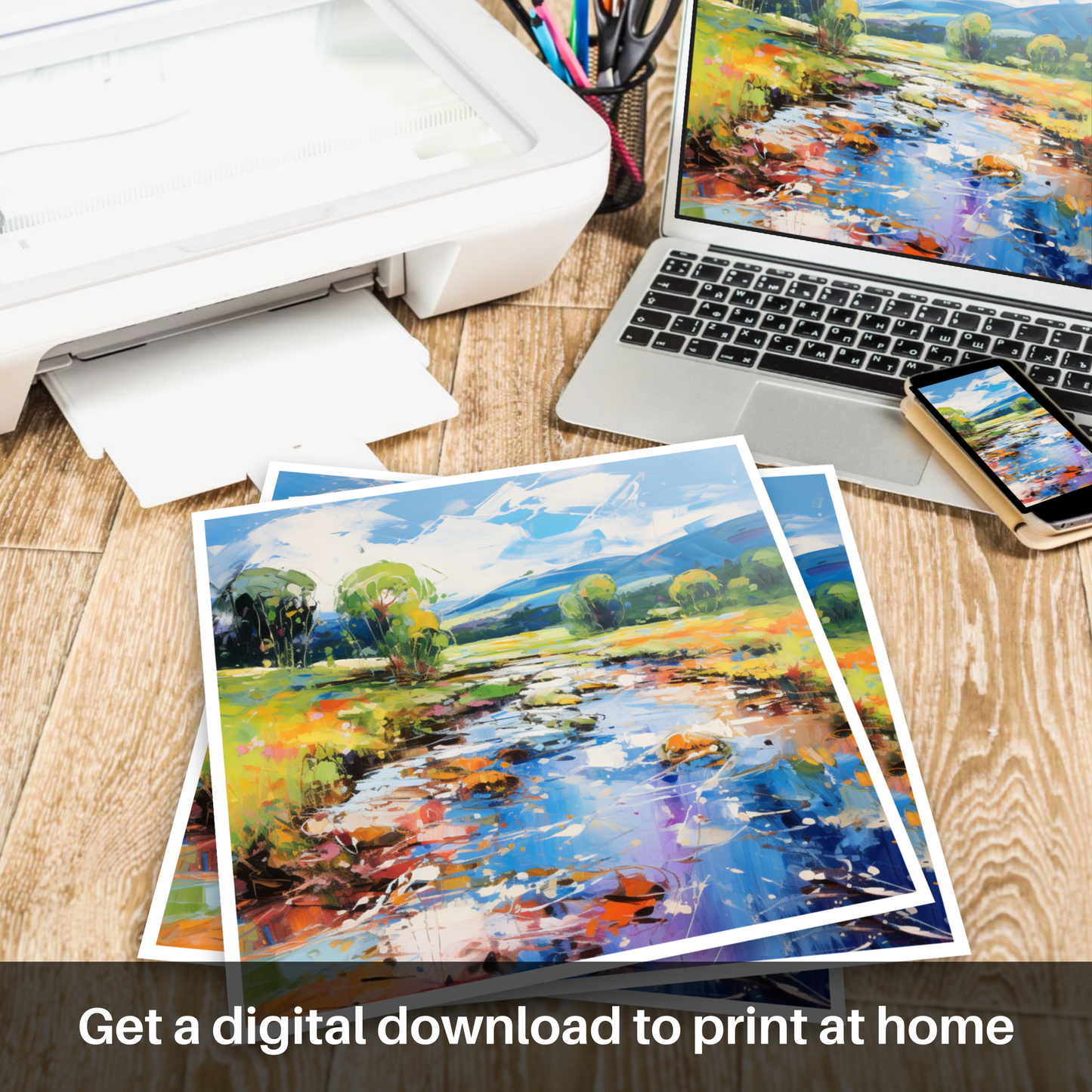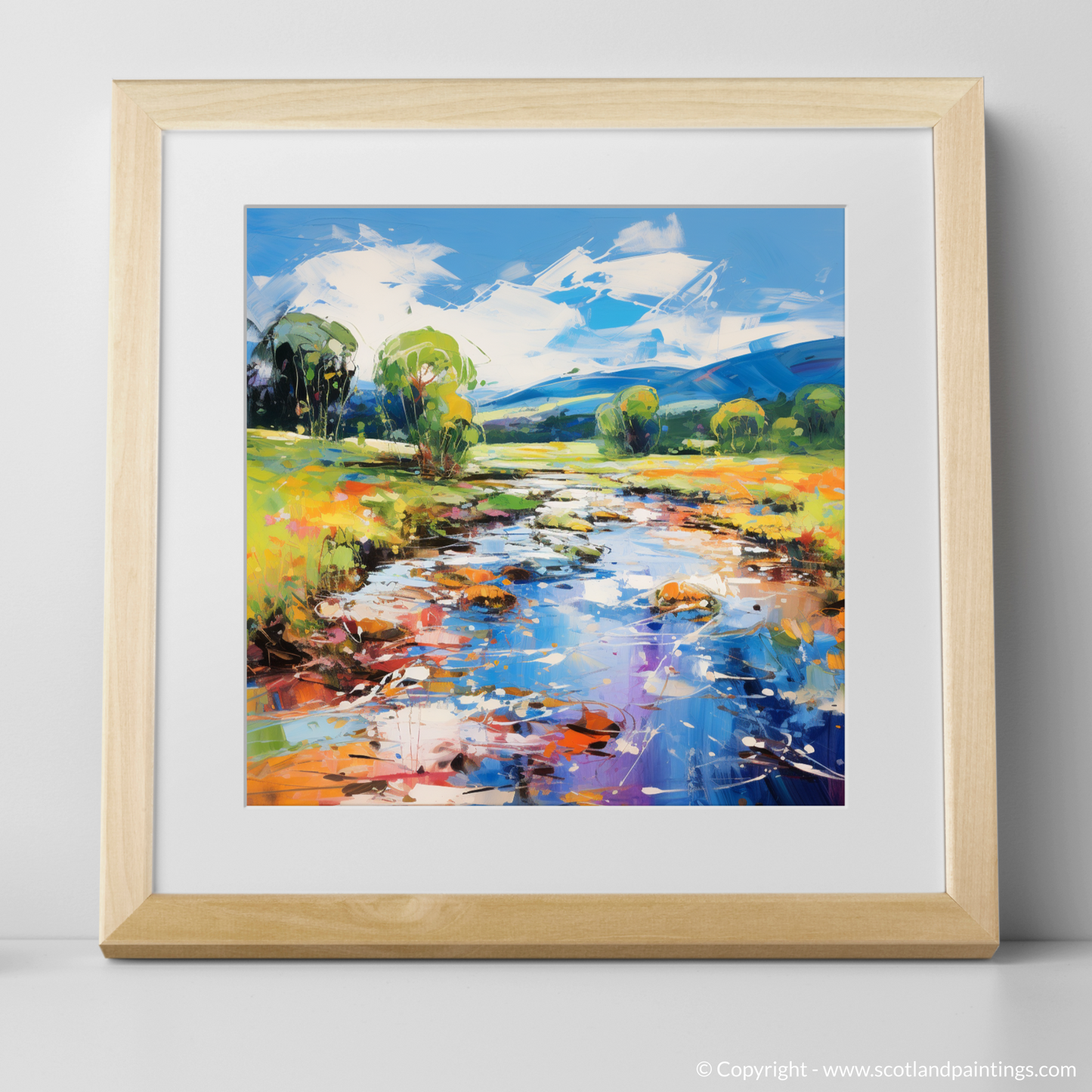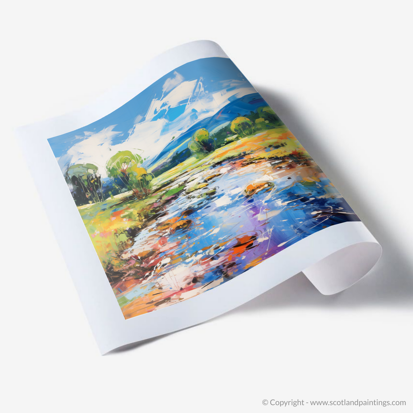 This vibrant print captures the essence of the River Carron in Ross-shire, bathed in the glorious light of a summer's day. The abstract representation offers a plethora of intense colours that infuse the scene with energy and warmth. Bold strokes in azure and cobalt blue depict the gentle flow of the river, speckled with reflections that dance across the water's surface in a symphony of white, amber, and vermillion.