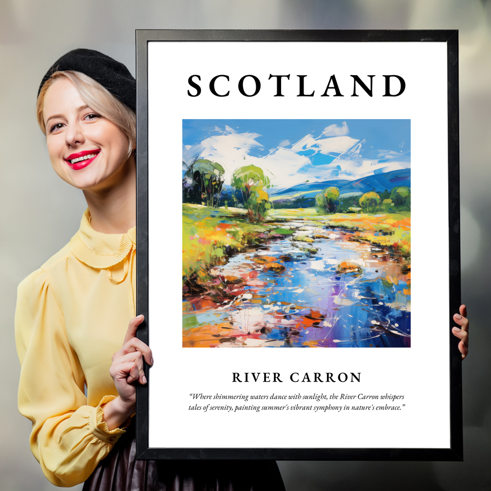 The painting itself is a masterstroke of abstract artistry, bringing to life the shimmering waters of the River Carron as they dance under the summer sun. Vivid colours meld together in a fluid symphony, depicting a serene day where nature plays with the light, creating a captivating visual narrative. Complemented by the poetic quote beneath, the print invites you to pause and reflect, to lose yourself in a moment of tranquillity.