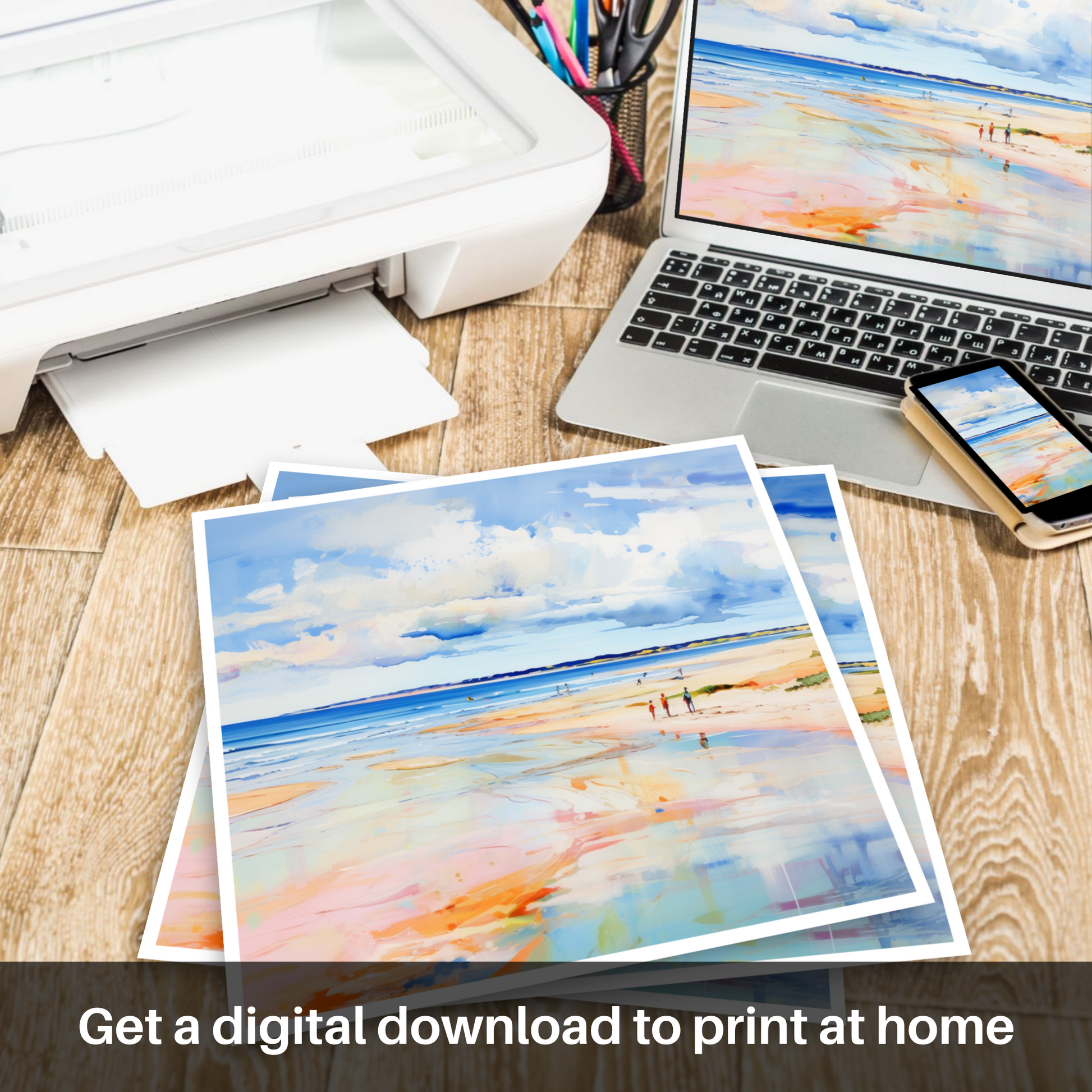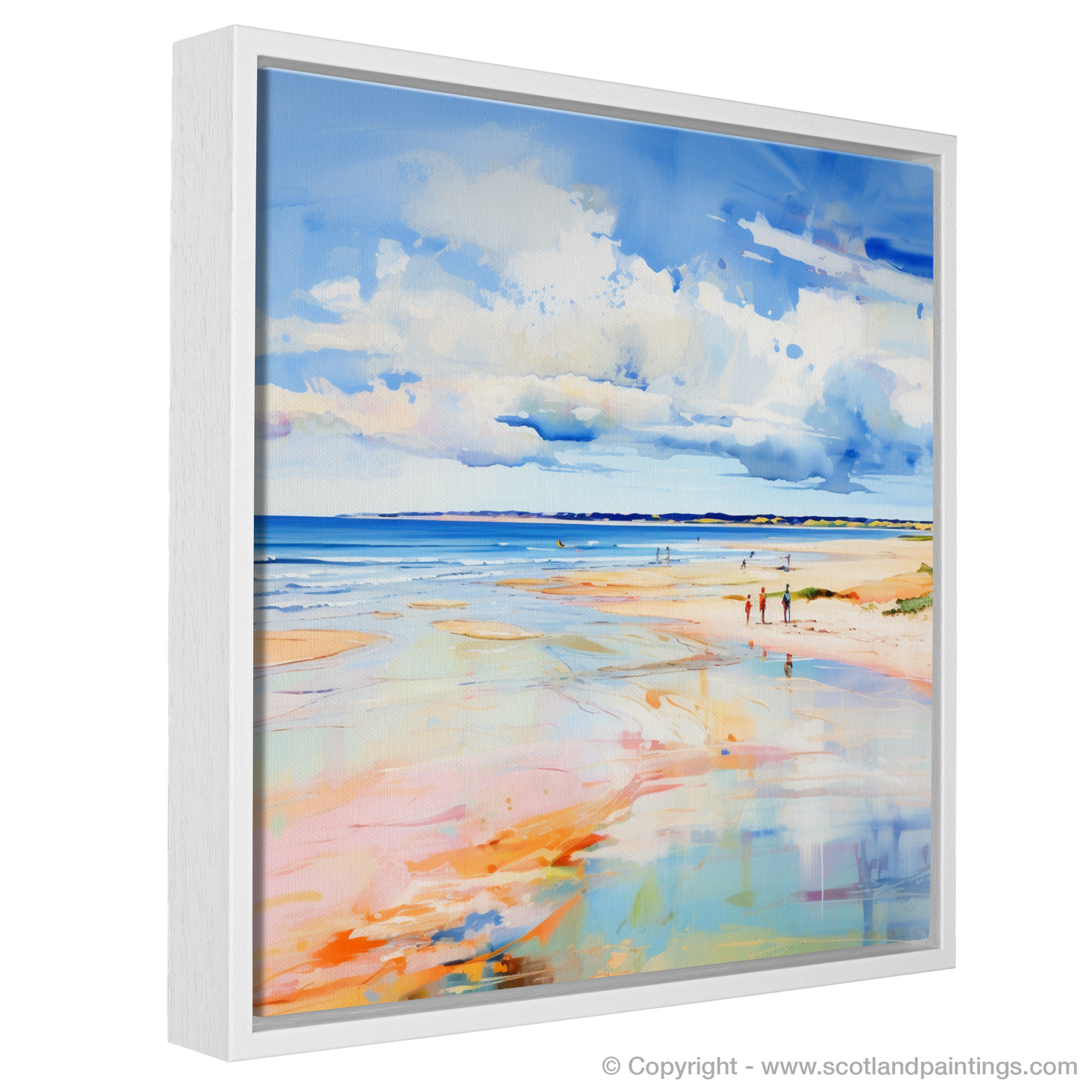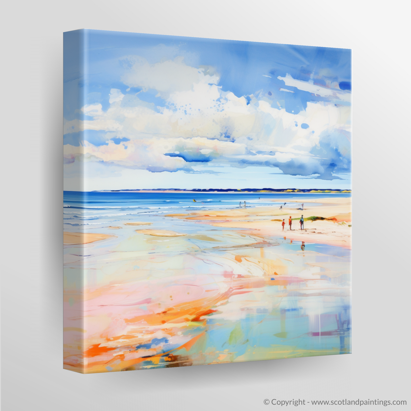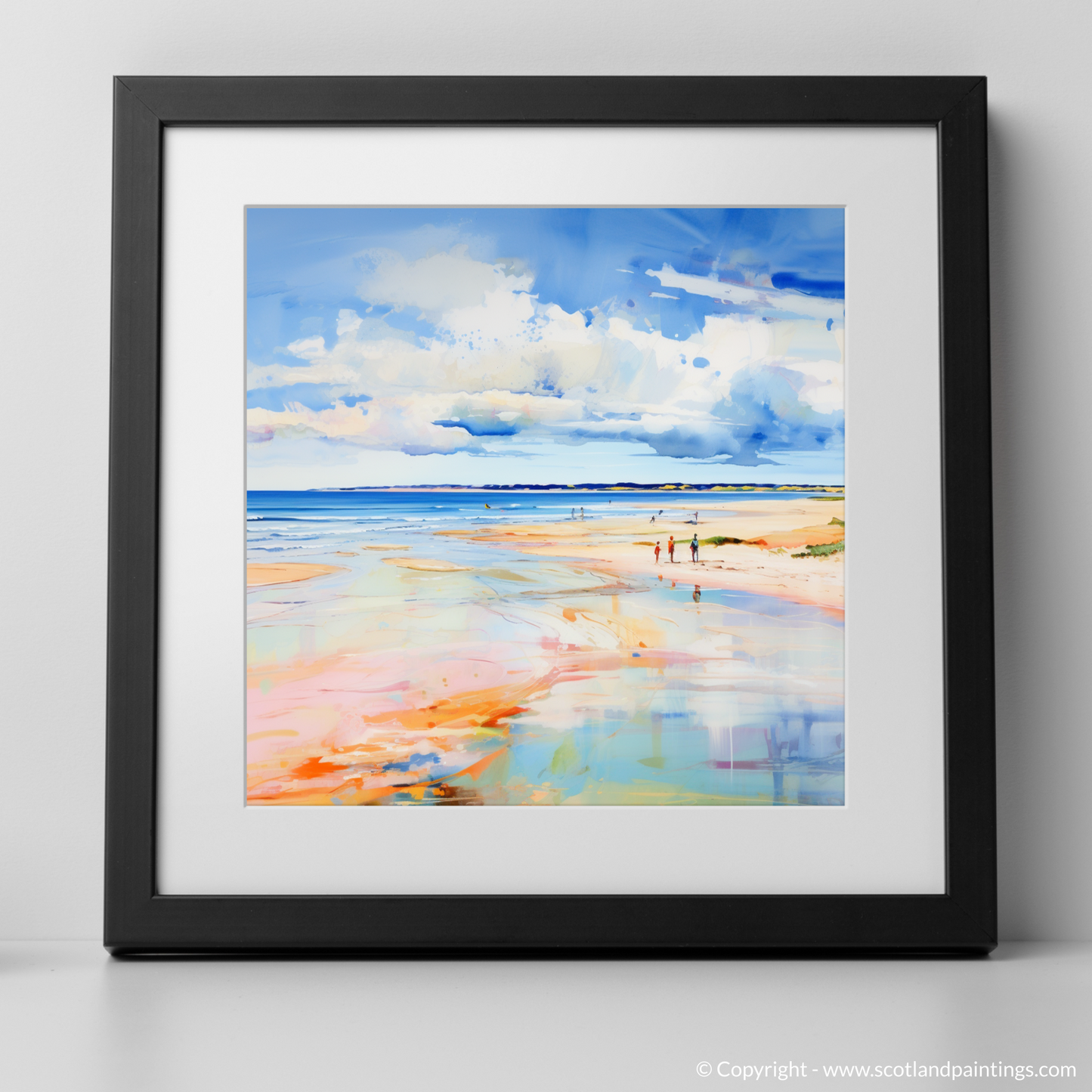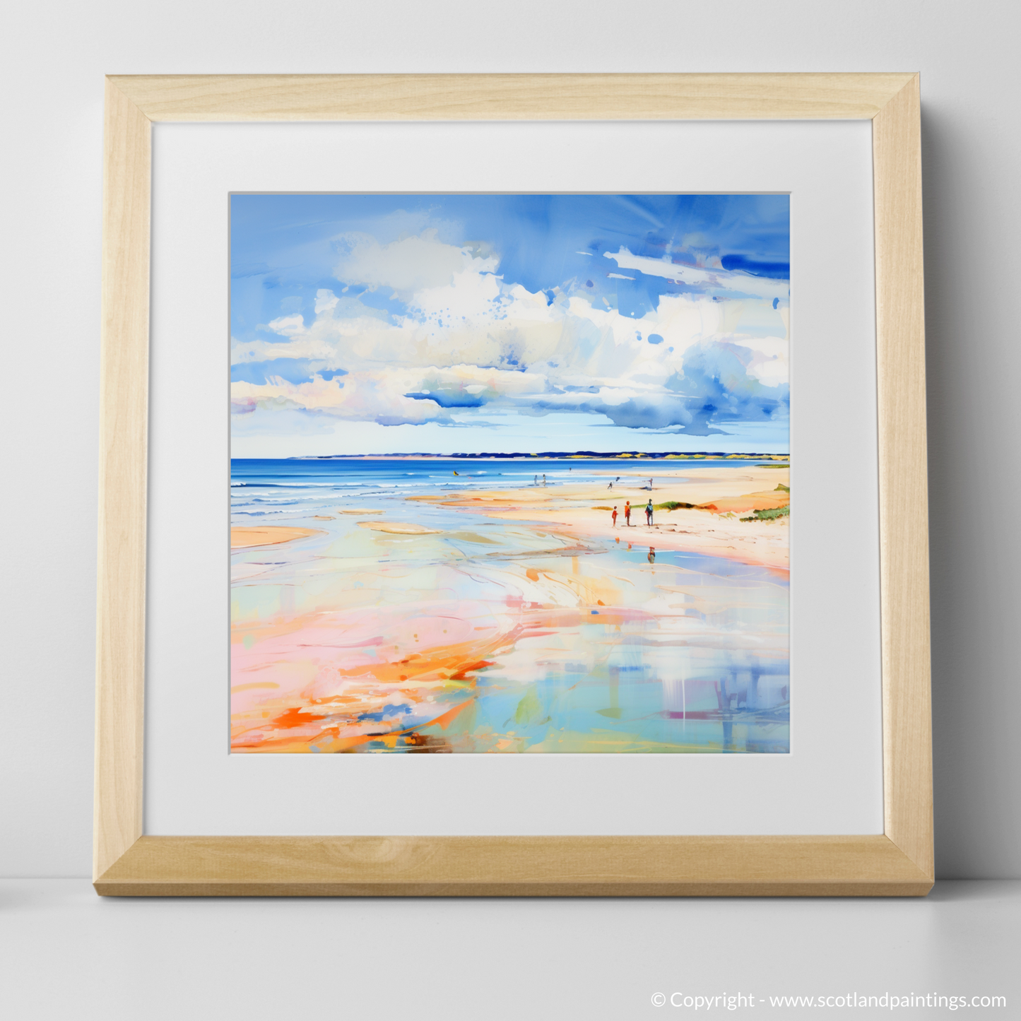 Captured in a vibrant abstract style, this print evokes the serene beauty of Nairn Beach in the height of summer. With a bold palette, the piece portrays the expansive Scottish shoreline as a medley of colour, where washes of cerulean blue, soft azure, and hints of white sky reflect onto the wet sands, creating a mirror of the heavens. The beach itself is a tapestry of warm oranges, blush pinks, and golden hues that remind one of the sun's gentle kiss on the earth's surface.