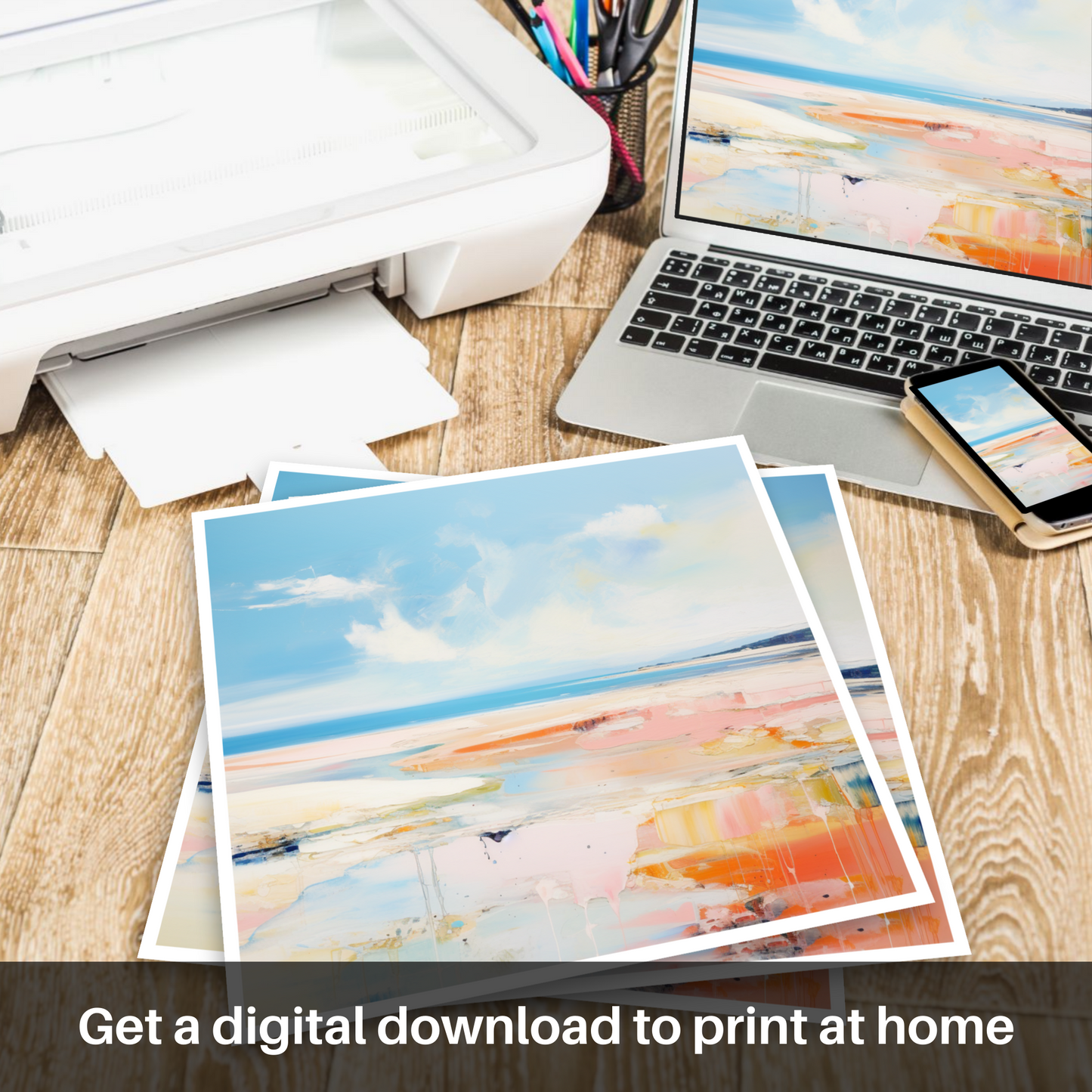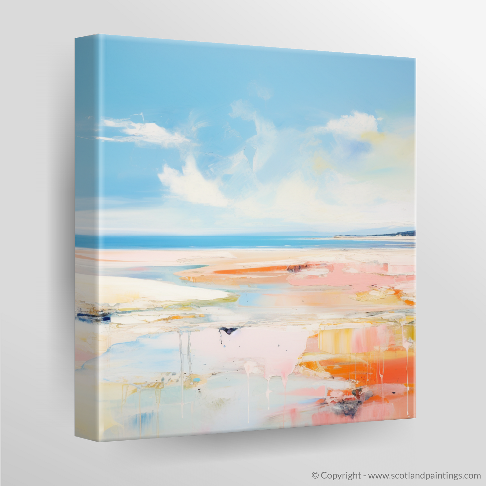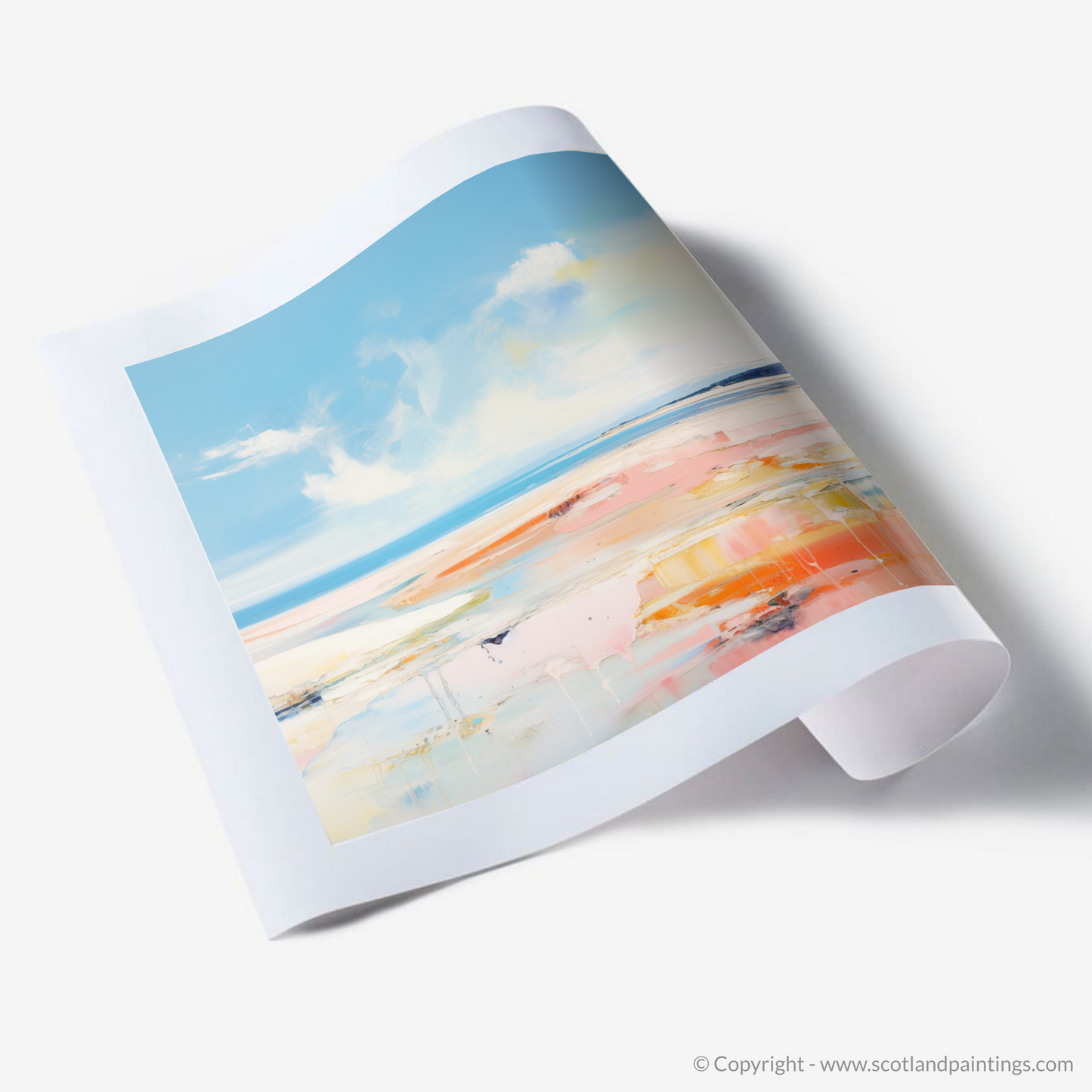 Capturing the essence of Nairn Beach during a Scottish summer, this abstract print offers a vibrant and refreshing take on the traditional seaside landscape. Vivid hues of tangerine, rose, and cerulean intersect with gentle cream and blushing peach tones, creating a dynamic visual experience that stimulates and soothes in equal measure.