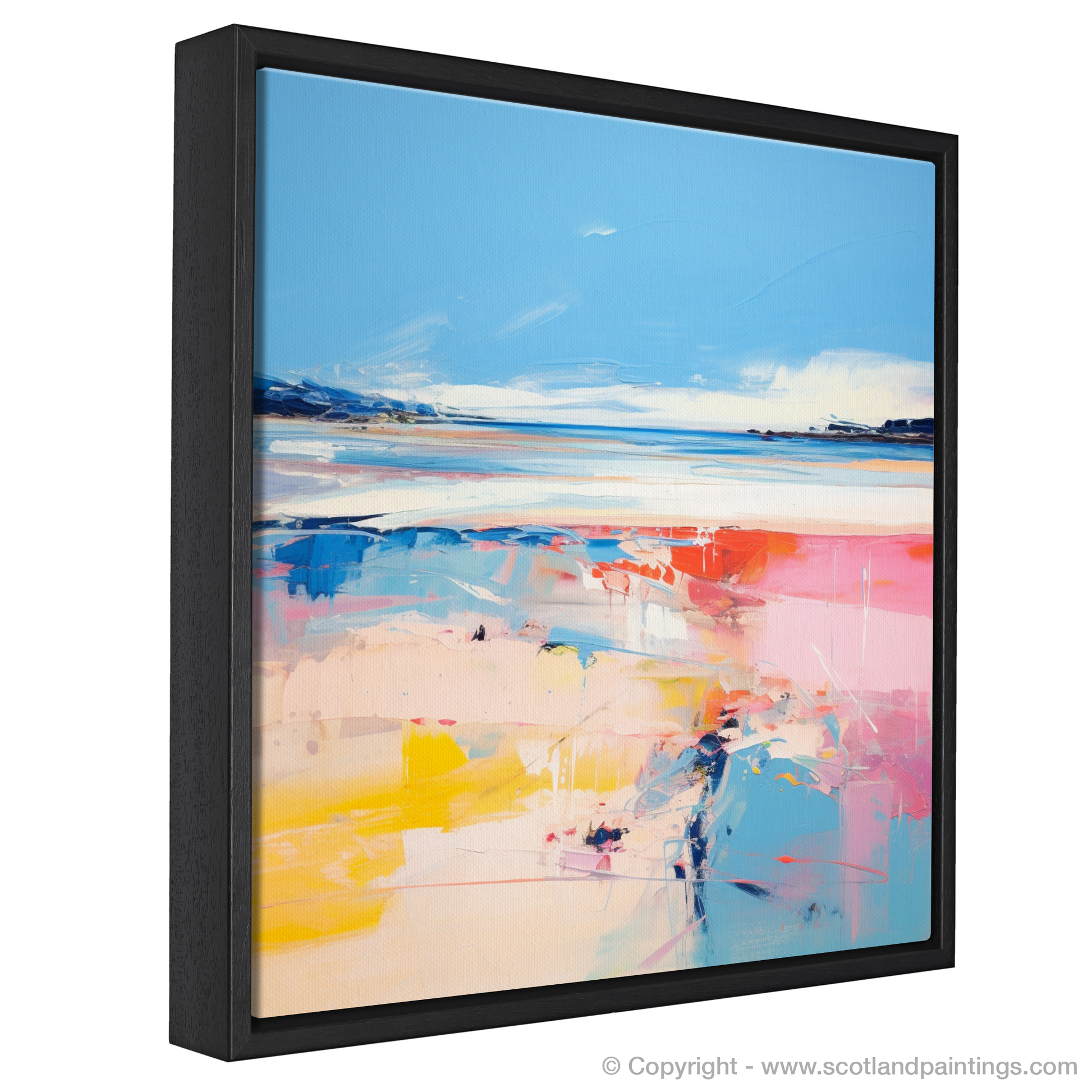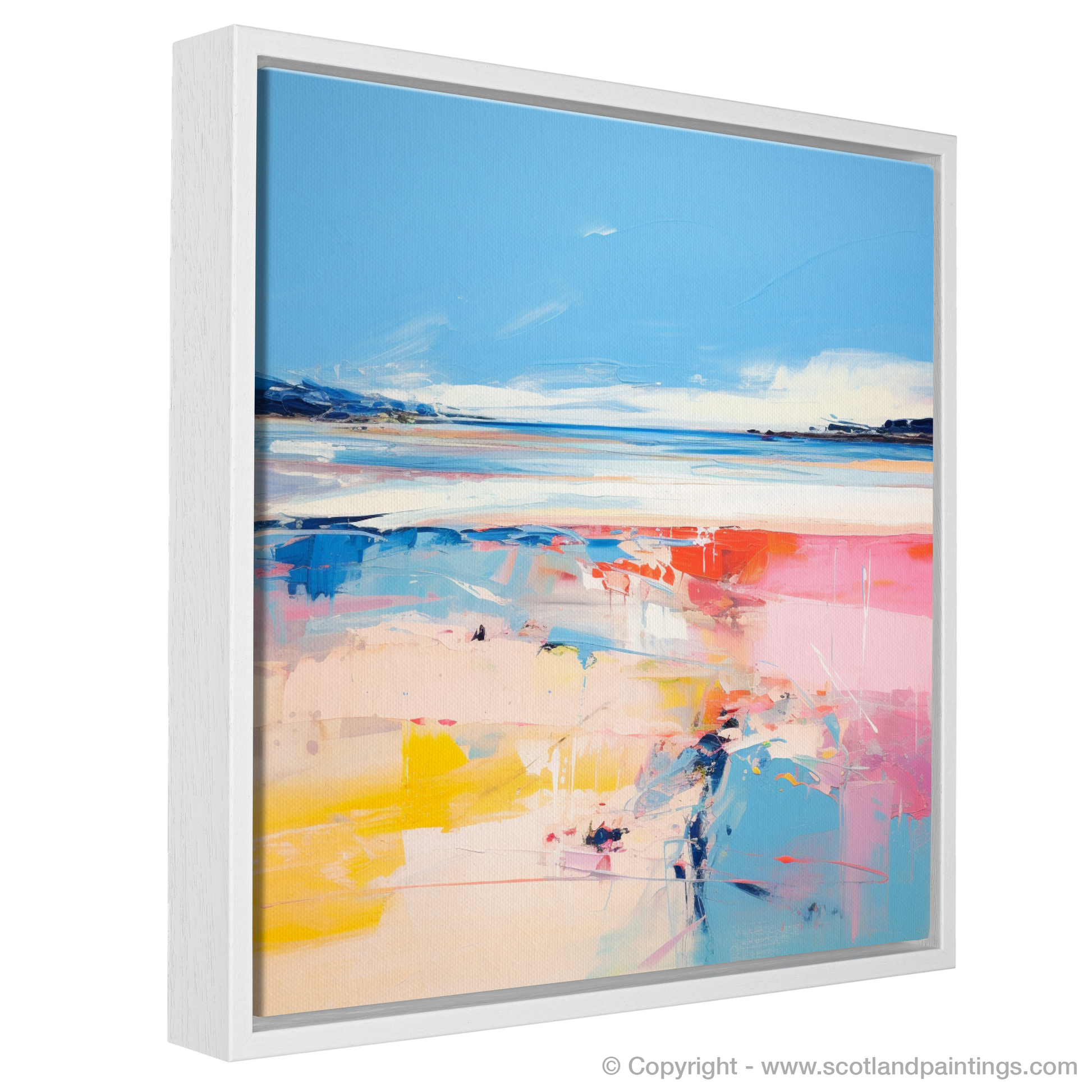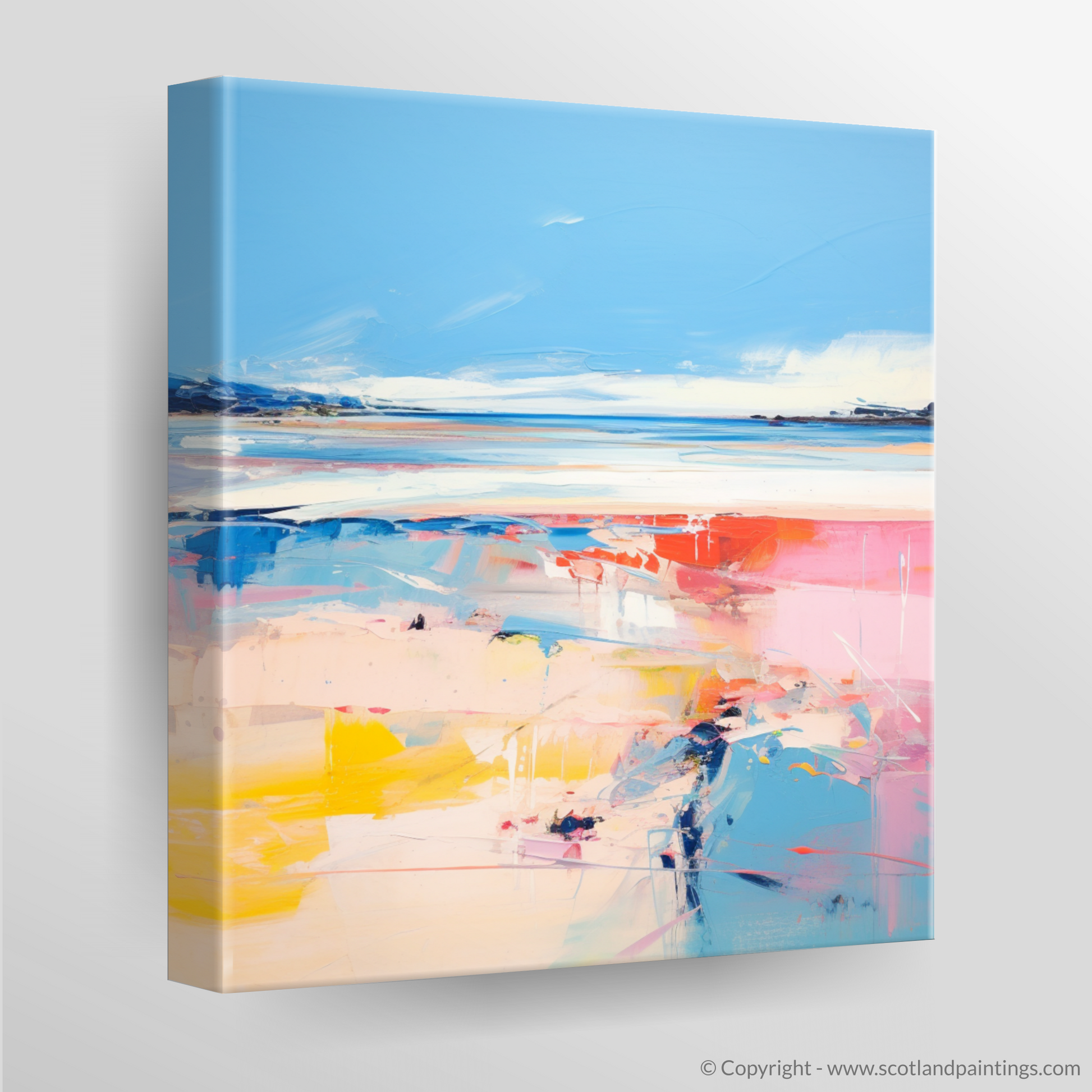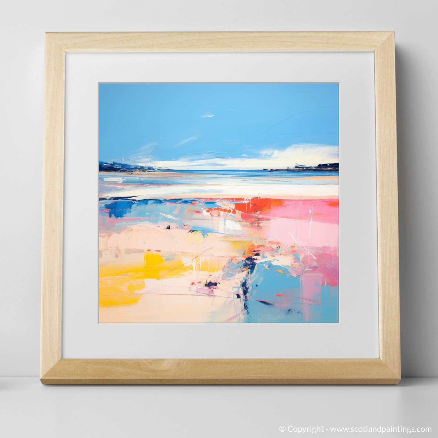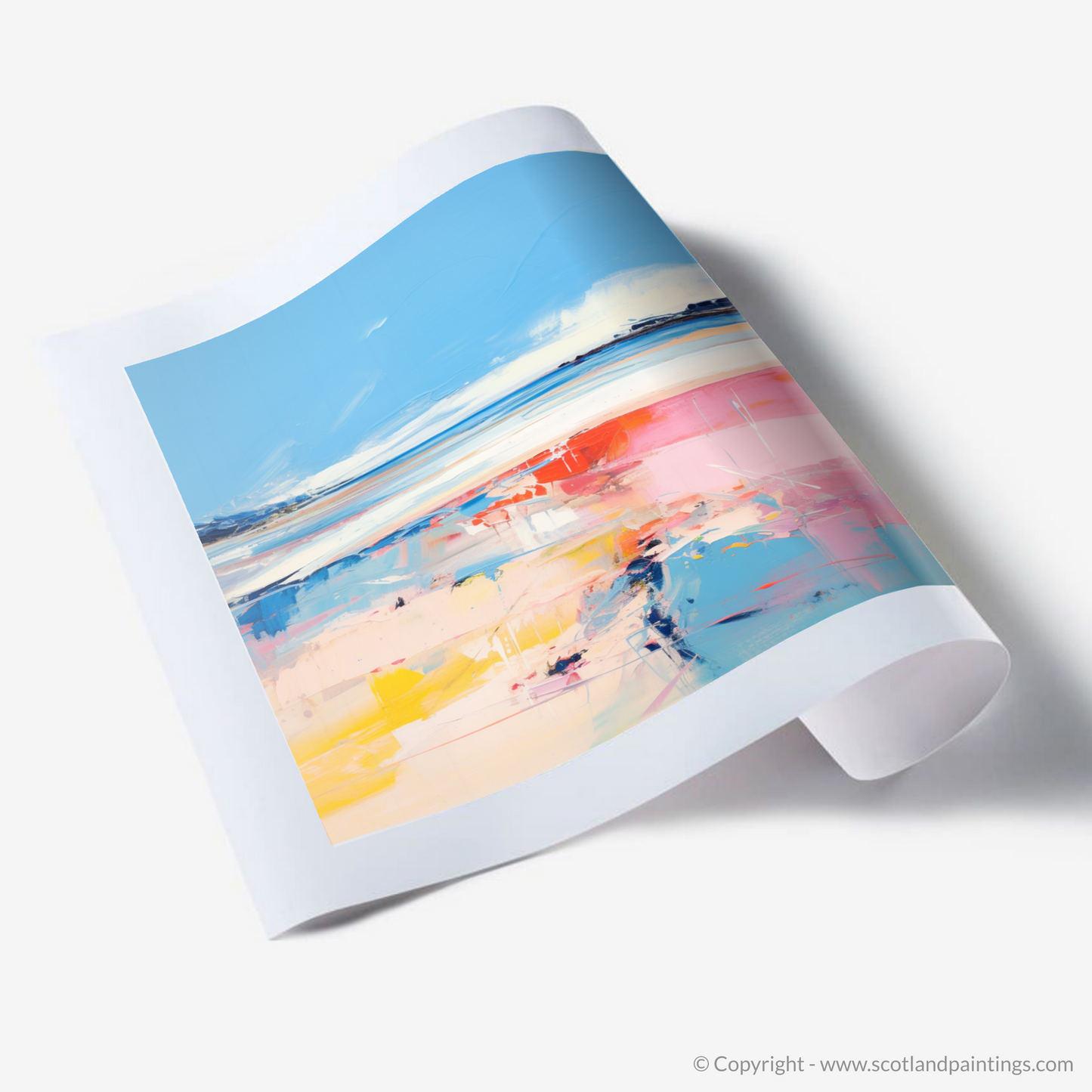 Captivate your senses with this vibrant abstract depiction of Nairn Beach during the blissful summer months. Bold, sweeping strokes of cerulean and azure evoke the expansive Scottish sky, while the horizon is rendered in a harmonious blend of blues and whites, hinting at the distant, serene sea.