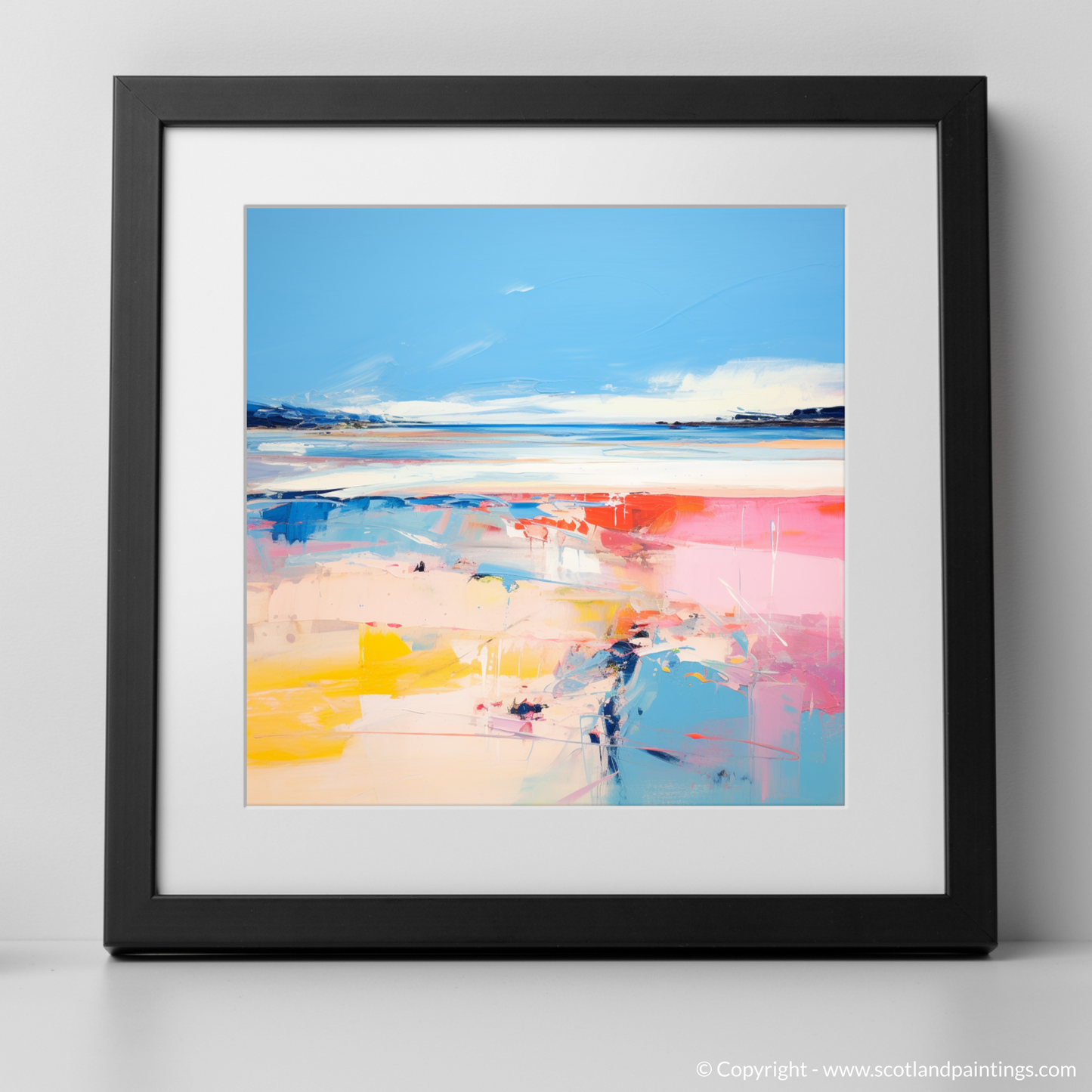 The lower portion of the print is a playful juxtaposition of form and colour, with vivid reds and oranges contrasting the cooler shoreline hues, capturing the warmth of the sun as it kisses the sand. Subtle touches of yellow and pink add a sense of movement, almost as if the gentle summer breeze can be felt through the dynamic application of paint.