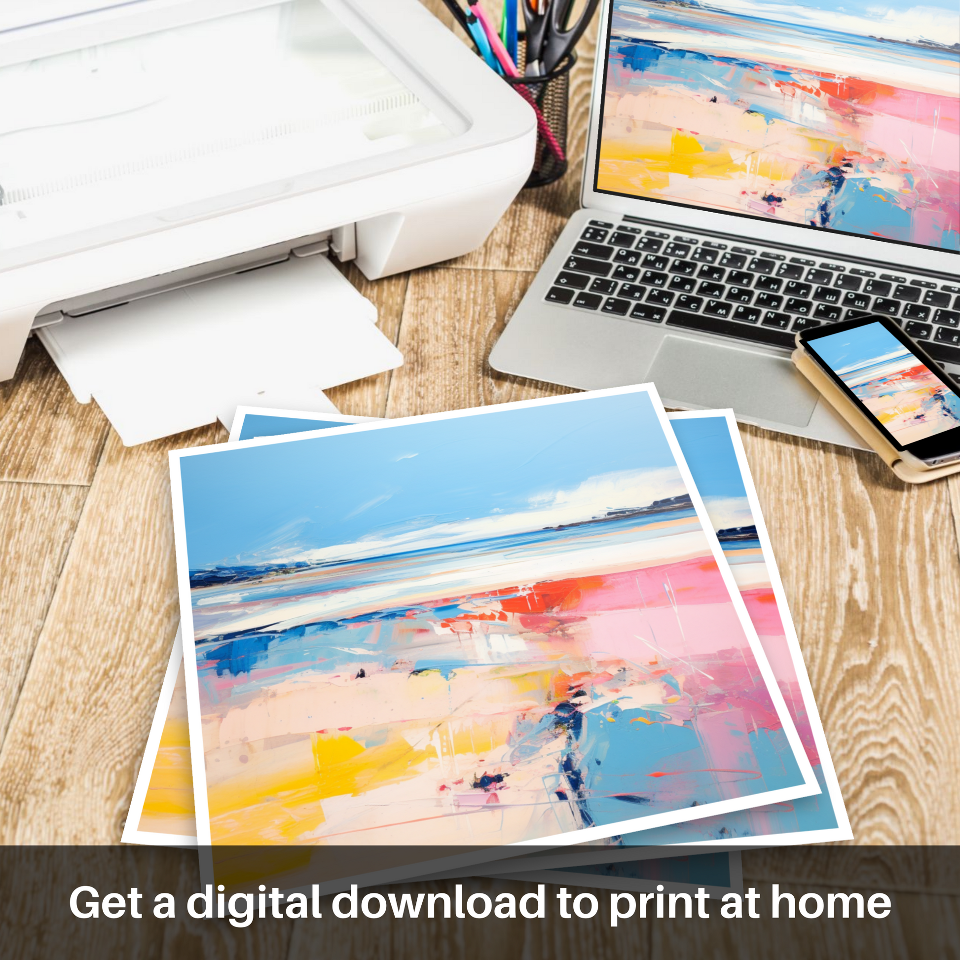 The abstract nature of this print invites the viewer to interpret the scene personally, whether it's a recollection of balmy days by the coast or an invigorating seaside escape yet to be discovered. This expressive piece from the 'Scotland in Summer' collection brings a dash of Scottish coastal charm to any space, beckoning viewers to lose themselves in the beauty and energy of Nairn Beach.
