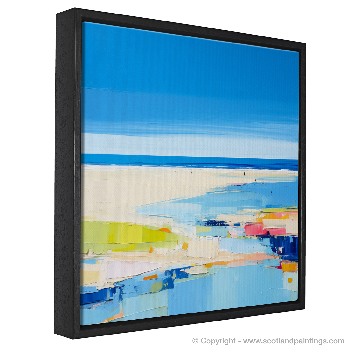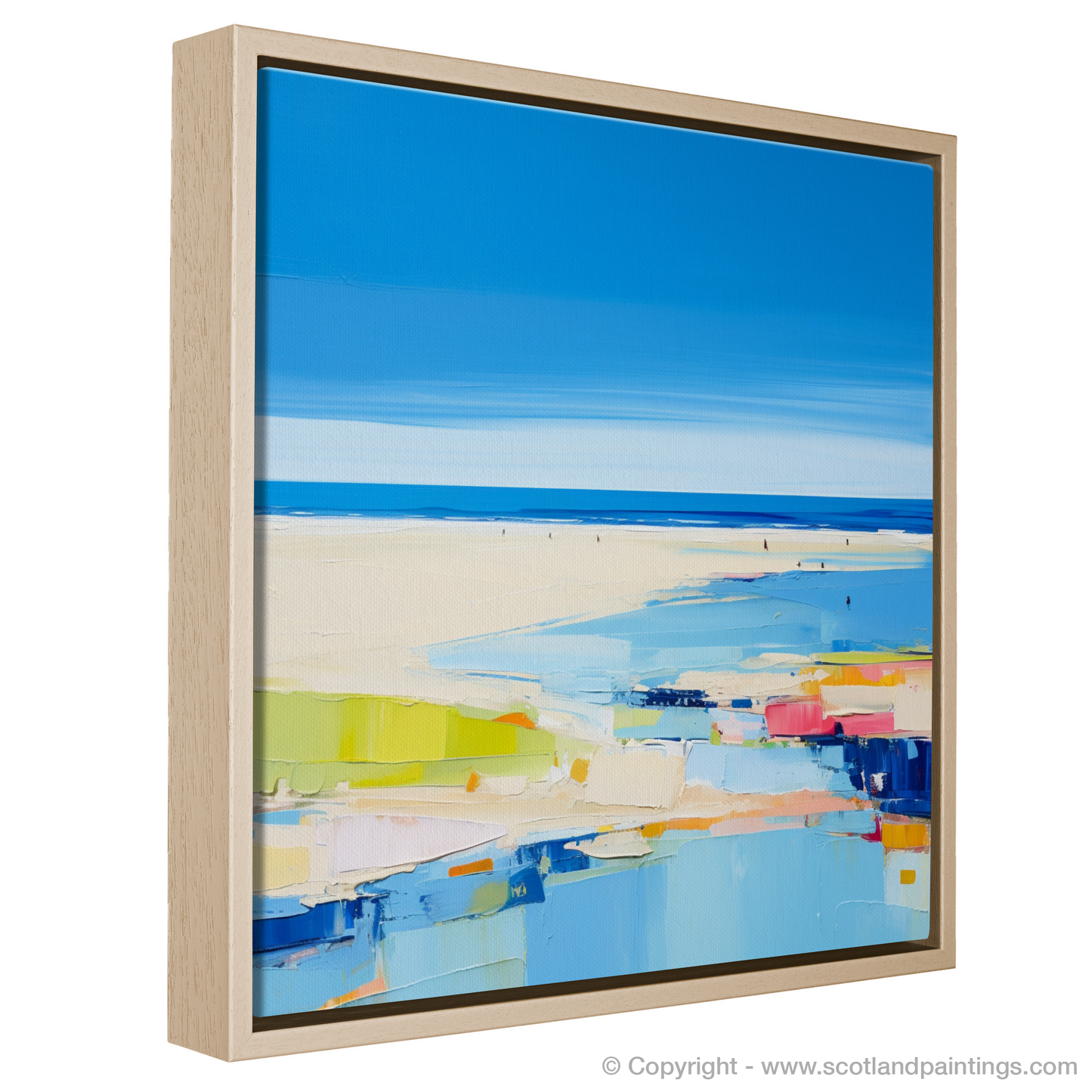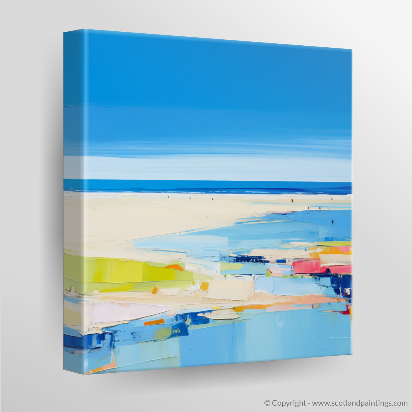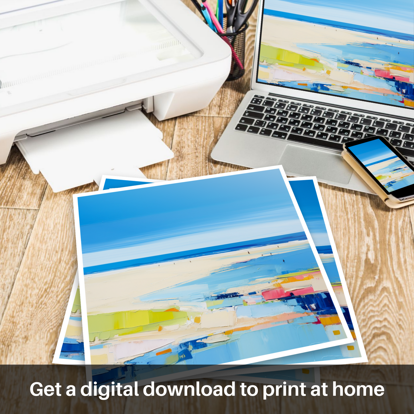The artwork presents a compelling tapestry of colour, where azure skies meet the gentle swell of the North Sea. Streaks of deep blue and cerulean are interspersed with the golden sands and the cool sea greens, echoing the rhythm of the waves and the warmth of the sun-kissed beach.