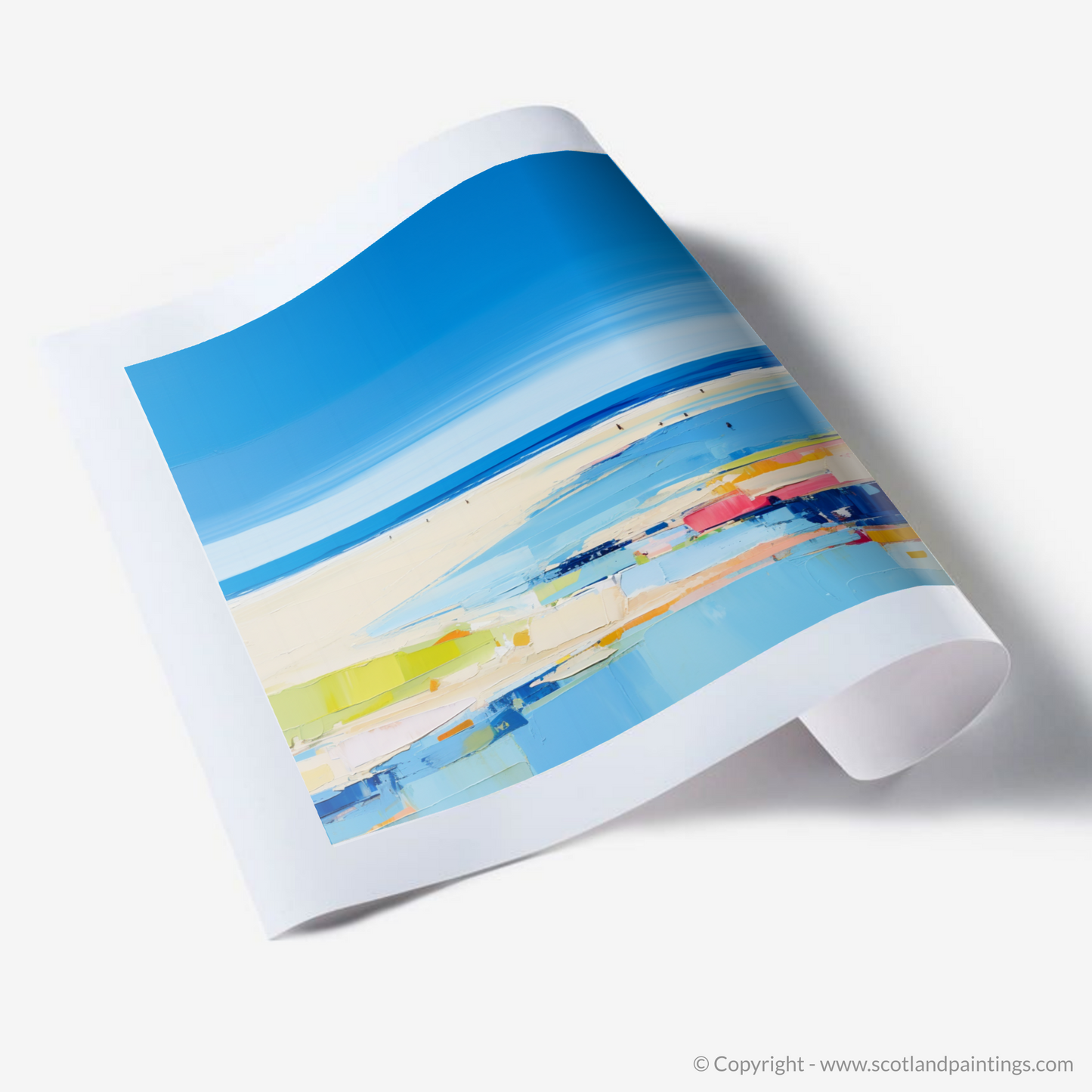 Let the tranquil hues and bold strokes of this abstract interpretation of St Cyrus Beach, Aberdeenshire, capture your imagination and enhance your space. This print, part of our 'Scotland in Summer' collection, evokes the splendid natural beauty of the Scottish shoreline during the warmer months.