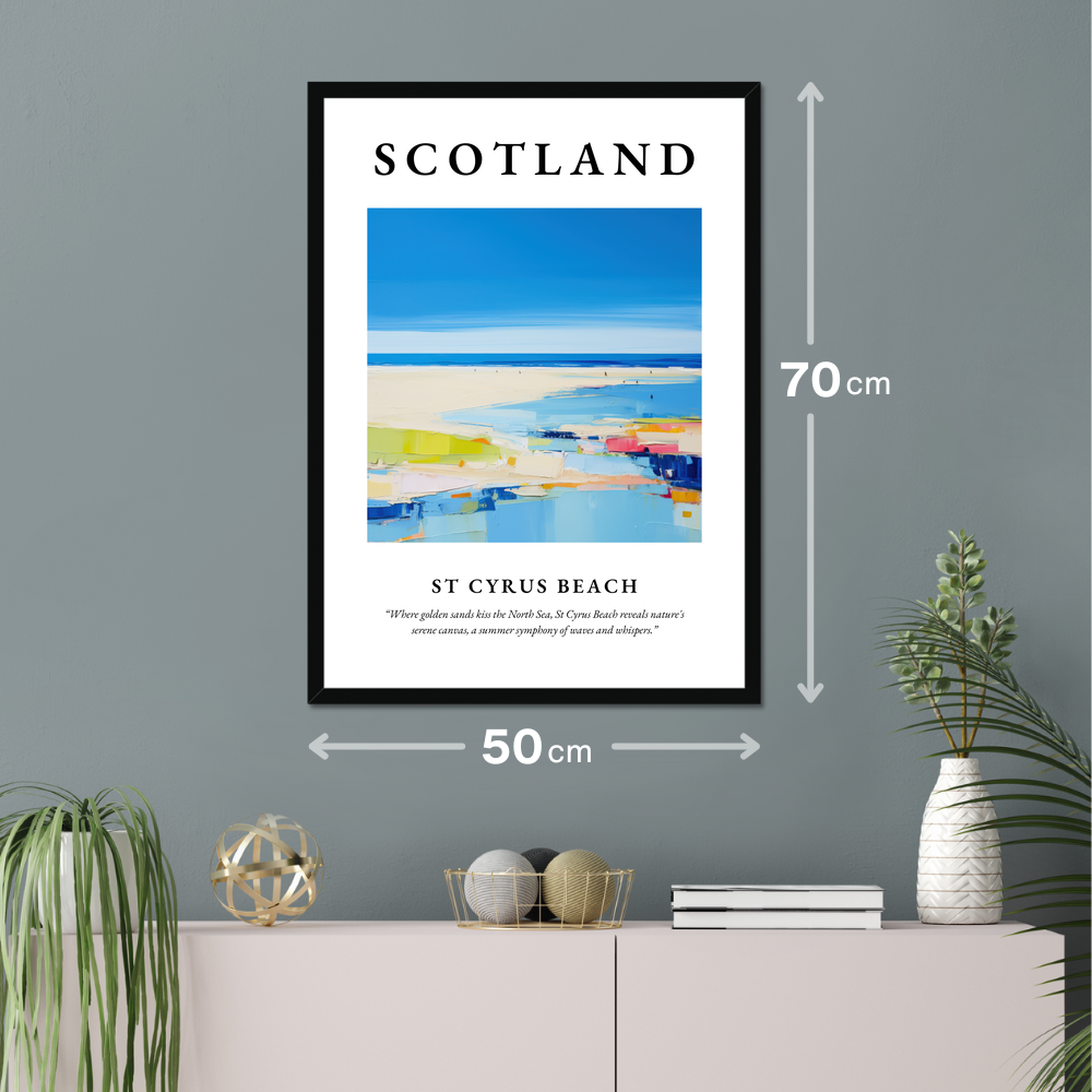 Available in sleek black, classic white, or a natural wood-effect frame, this piece seamlessly integrates into any decor. The bold title "SCOTLAND" draws the eye, setting the stage for the abstract portrayal below. Beneath the lively depiction of the beach, the gentle quote allows reflection: “Where golden sands kiss the North Sea, St Cyrus Beach reveals nature's serene canvas, a summer symphony of waves and whispers.” Such a statement piece is not only a tribute to the breathtaking landscapes of Scotland but also a valuable conversation starter.