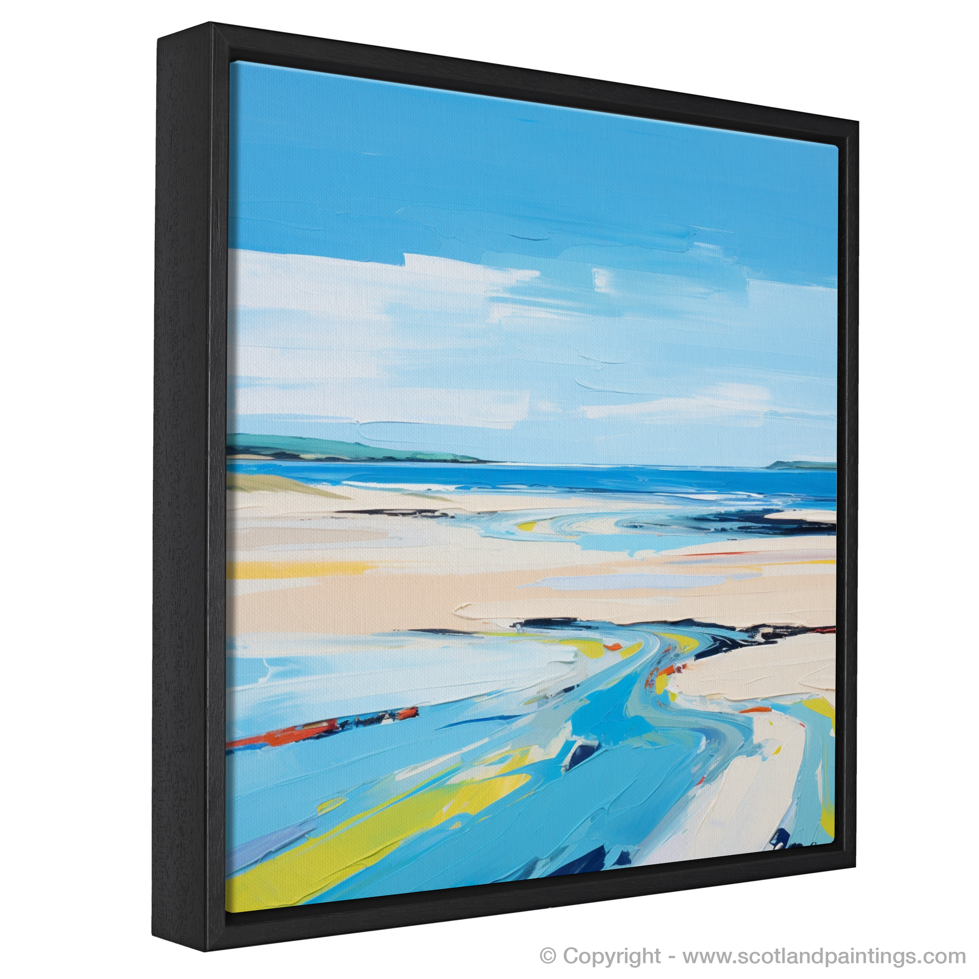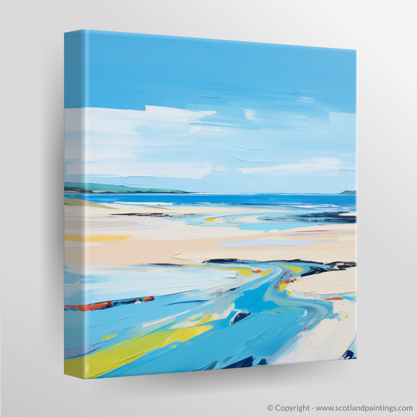 The artwork features a symphony of bold brushstrokes that dance across the canvas, portraying the movement of the sea and the shifting sands. Shades of azure and cerulean evoke the clear, expansive summer sky, while the rich blues suggest the depth and tranquillity of the ocean waters.