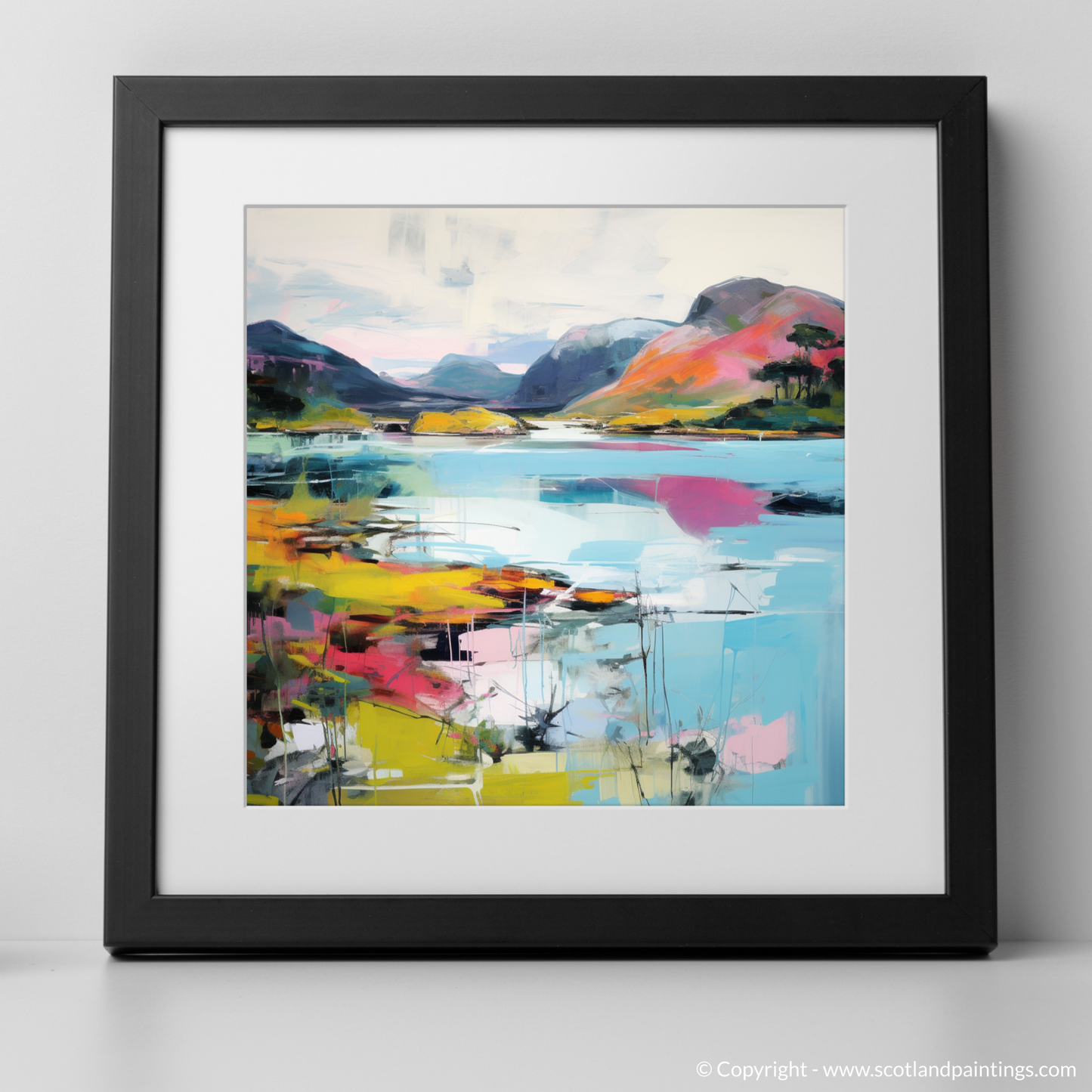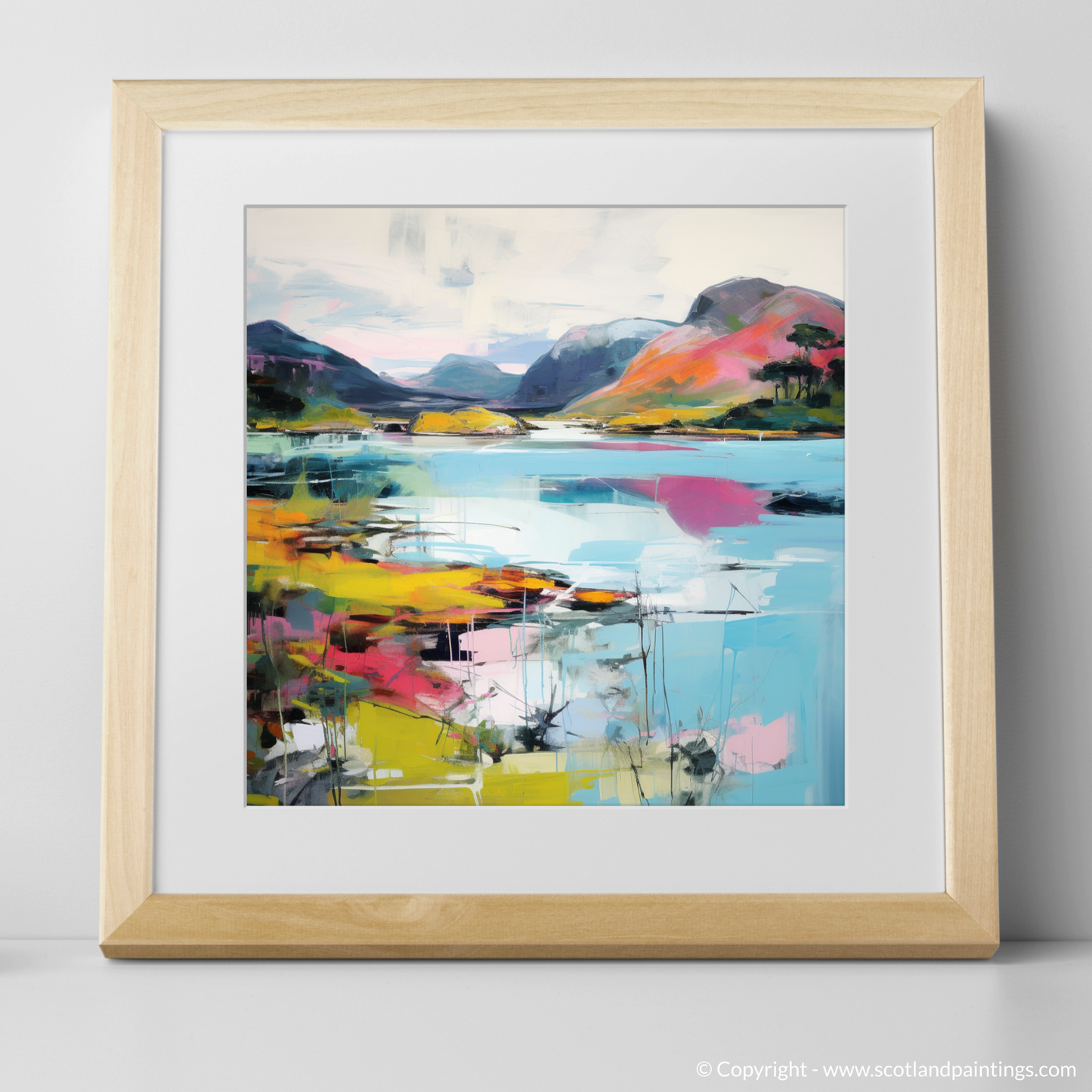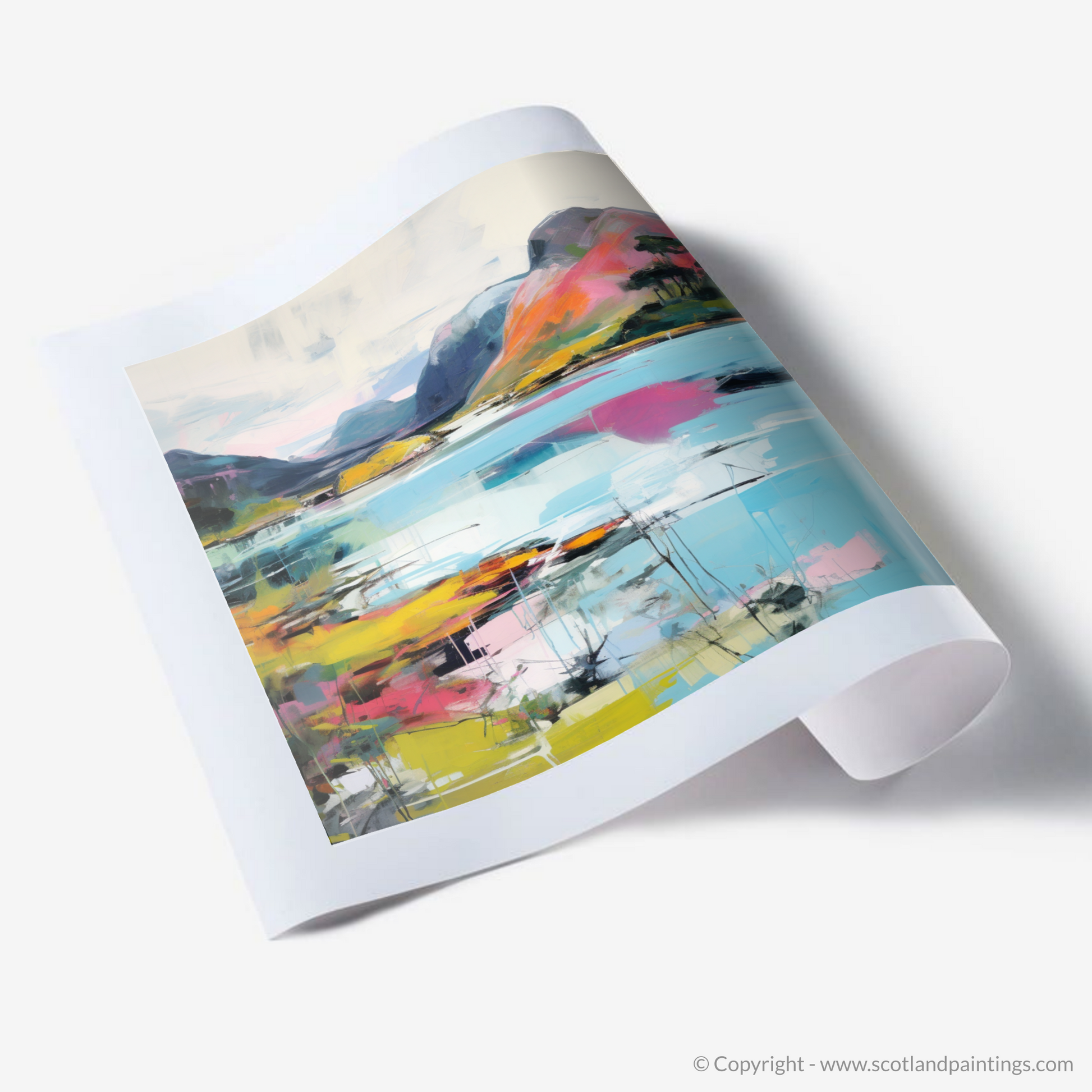 Capture the vibrant essence of the Scottish Highlands during the summertime with this exquisite print. The piece is a captivating blend of expressive brushstrokes and a bold colour palette that brings to life the dynamic landscape of Loch Morar. The foreground is awash with an array of intense yellows and delicate pinks, suggesting the wild blooms that flourish in the warmer months. These vivid hues are mirrored in the placid waters of the loch, creating a serene reflection that adds depth and balance to the composition.