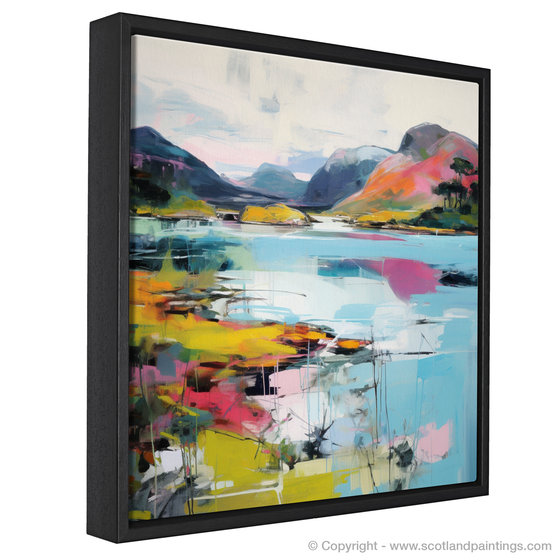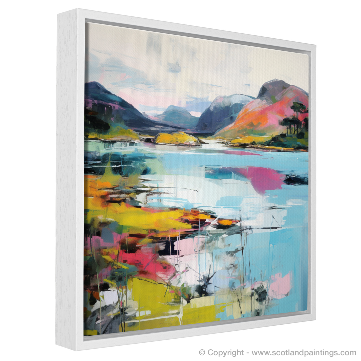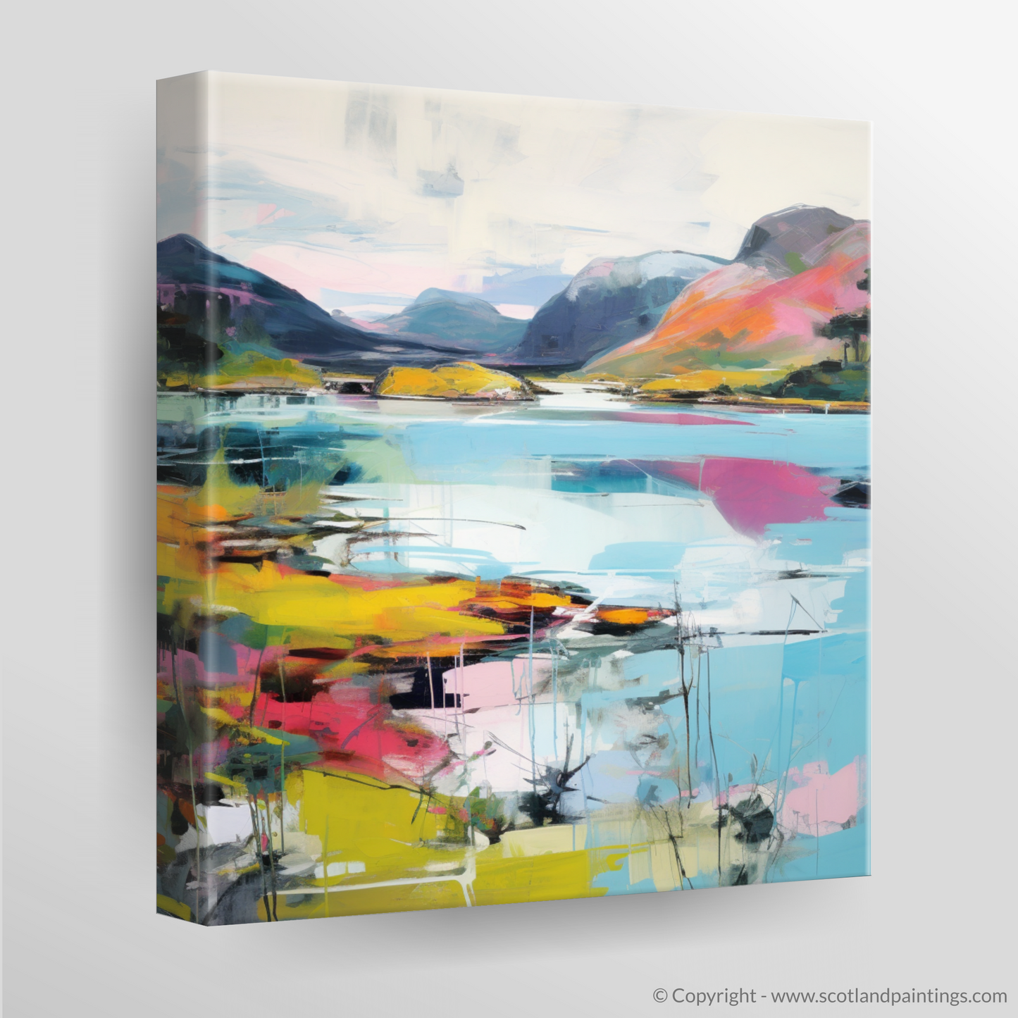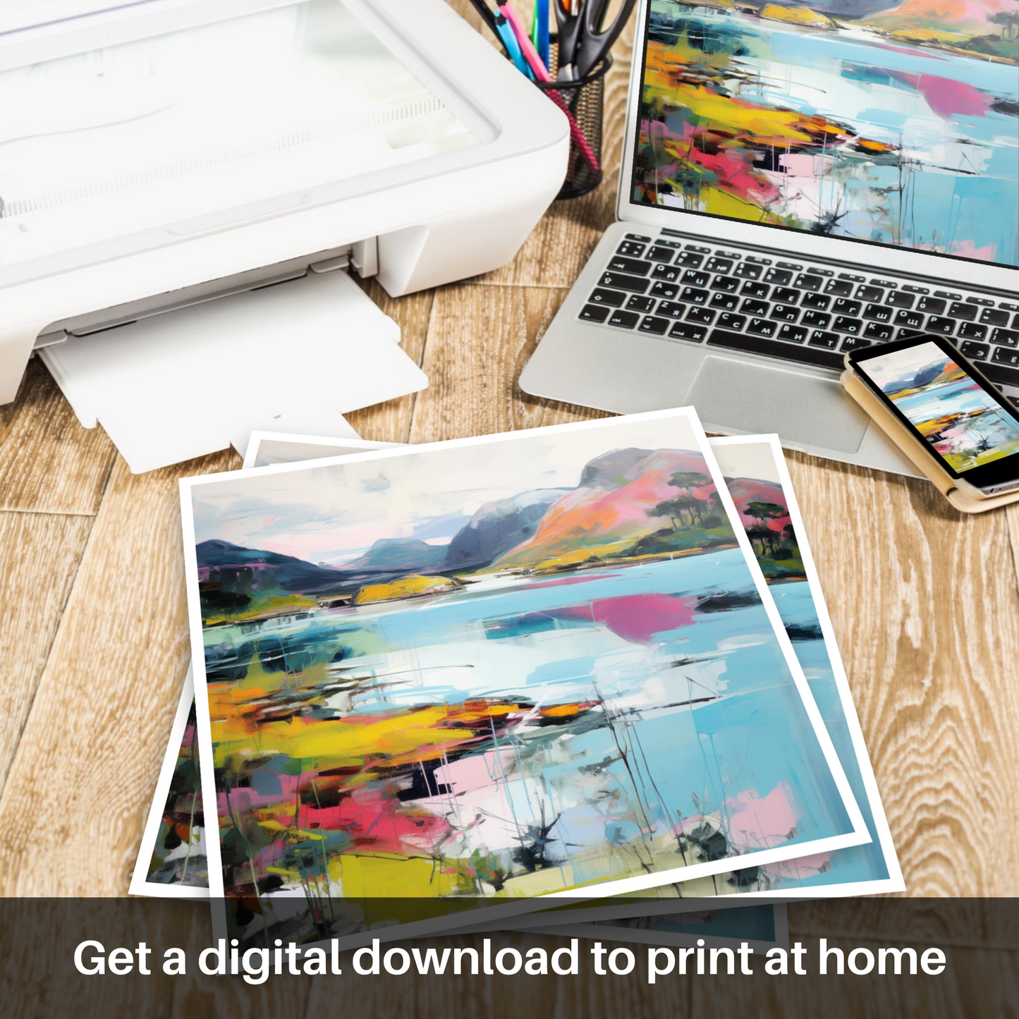 Capture the vibrant essence of the Scottish Highlands during the summertime with this exquisite print. The piece is a captivating blend of expressive brushstrokes and a bold colour palette that brings to life the dynamic landscape of Loch Morar. The foreground is awash with an array of intense yellows and delicate pinks, suggesting the wild blooms that flourish in the warmer months. These vivid hues are mirrored in the placid waters of the loch, creating a serene reflection that adds depth and balance to the composition.