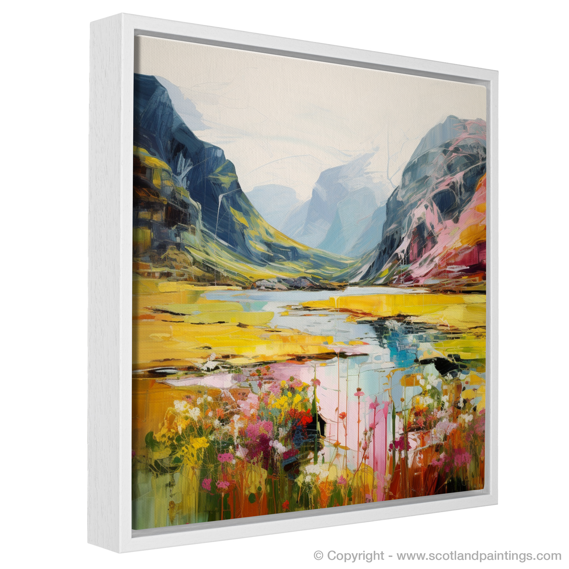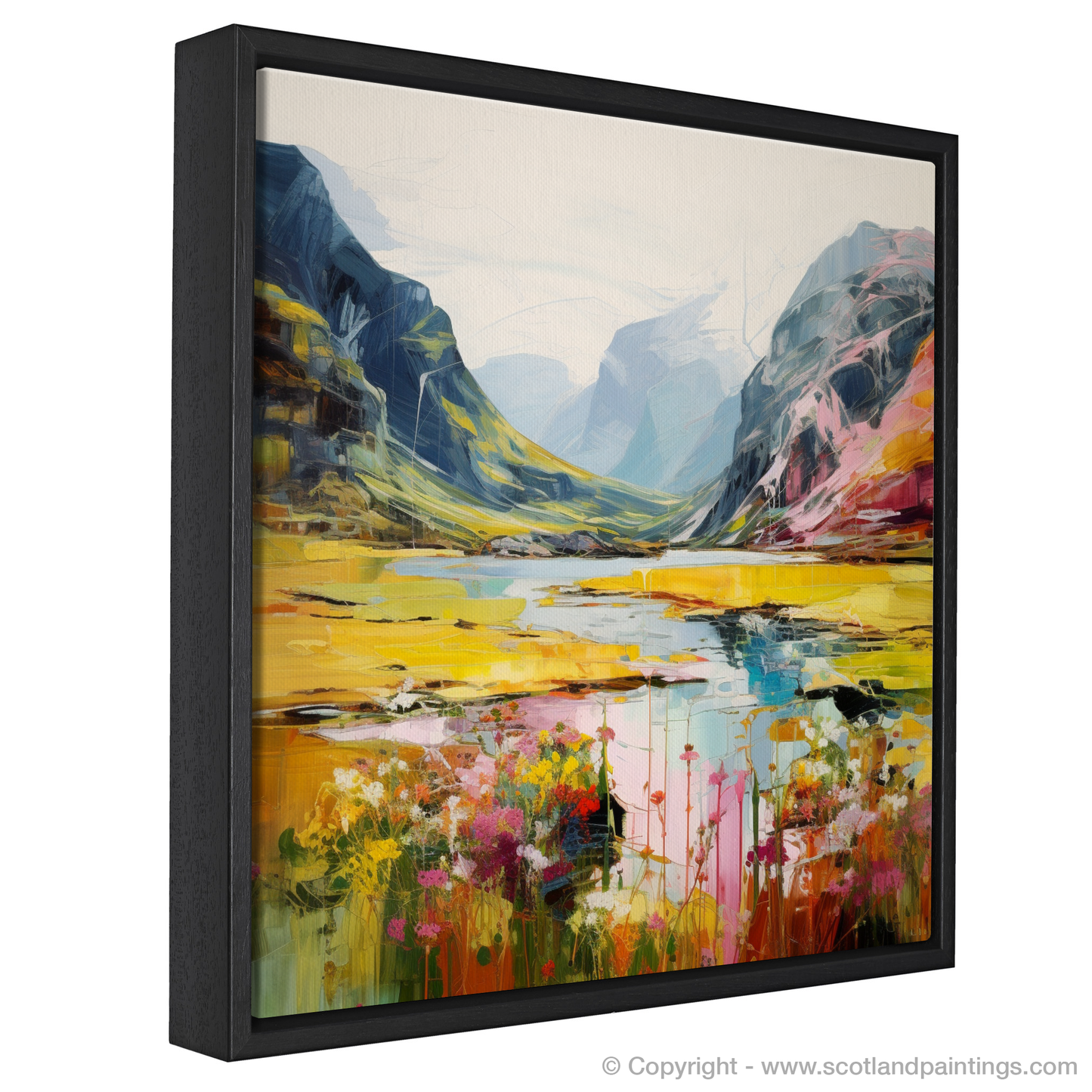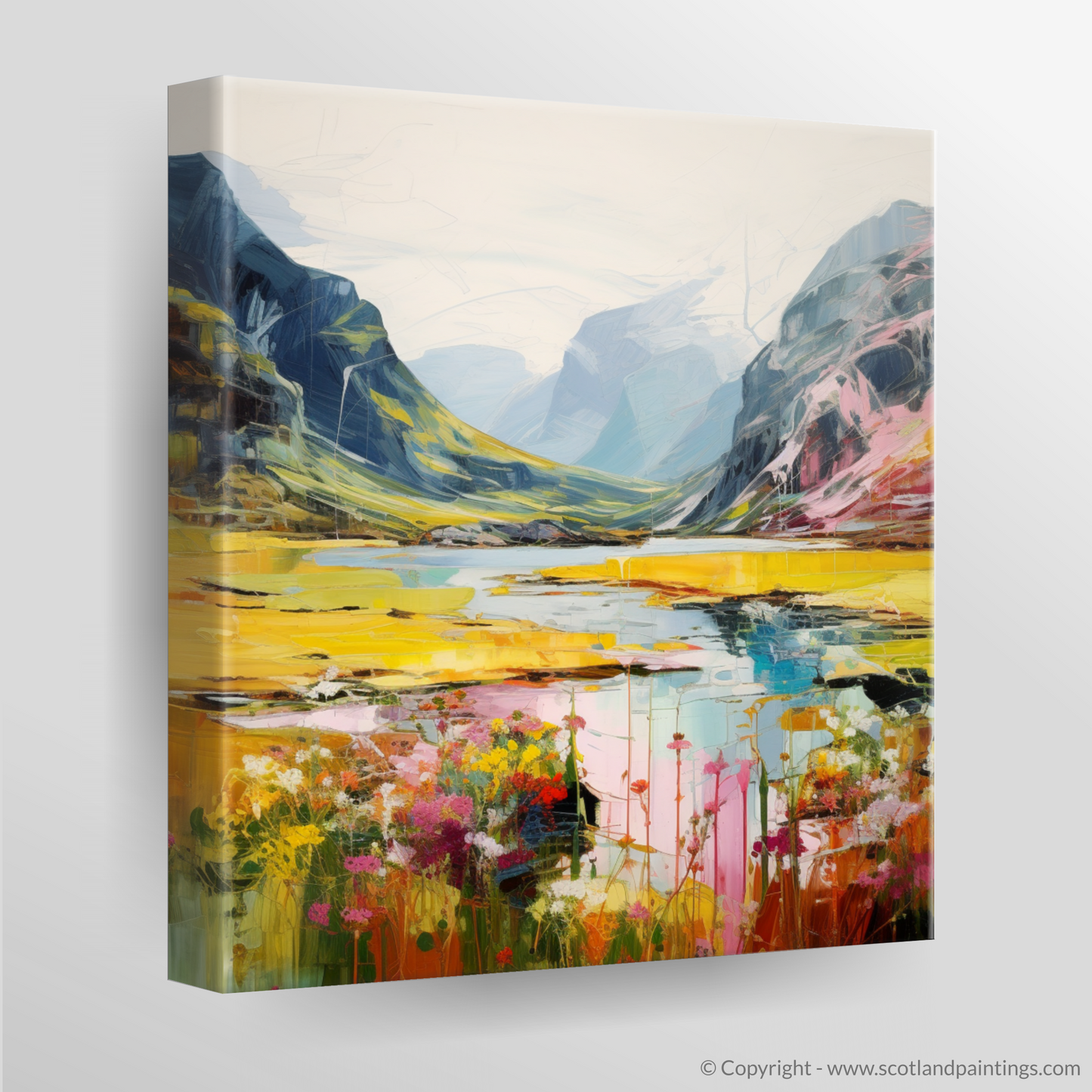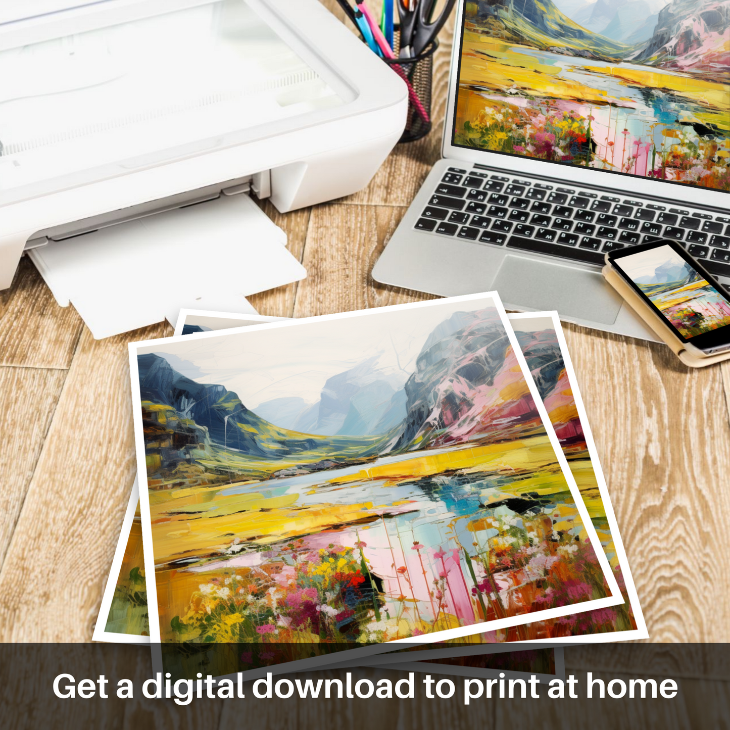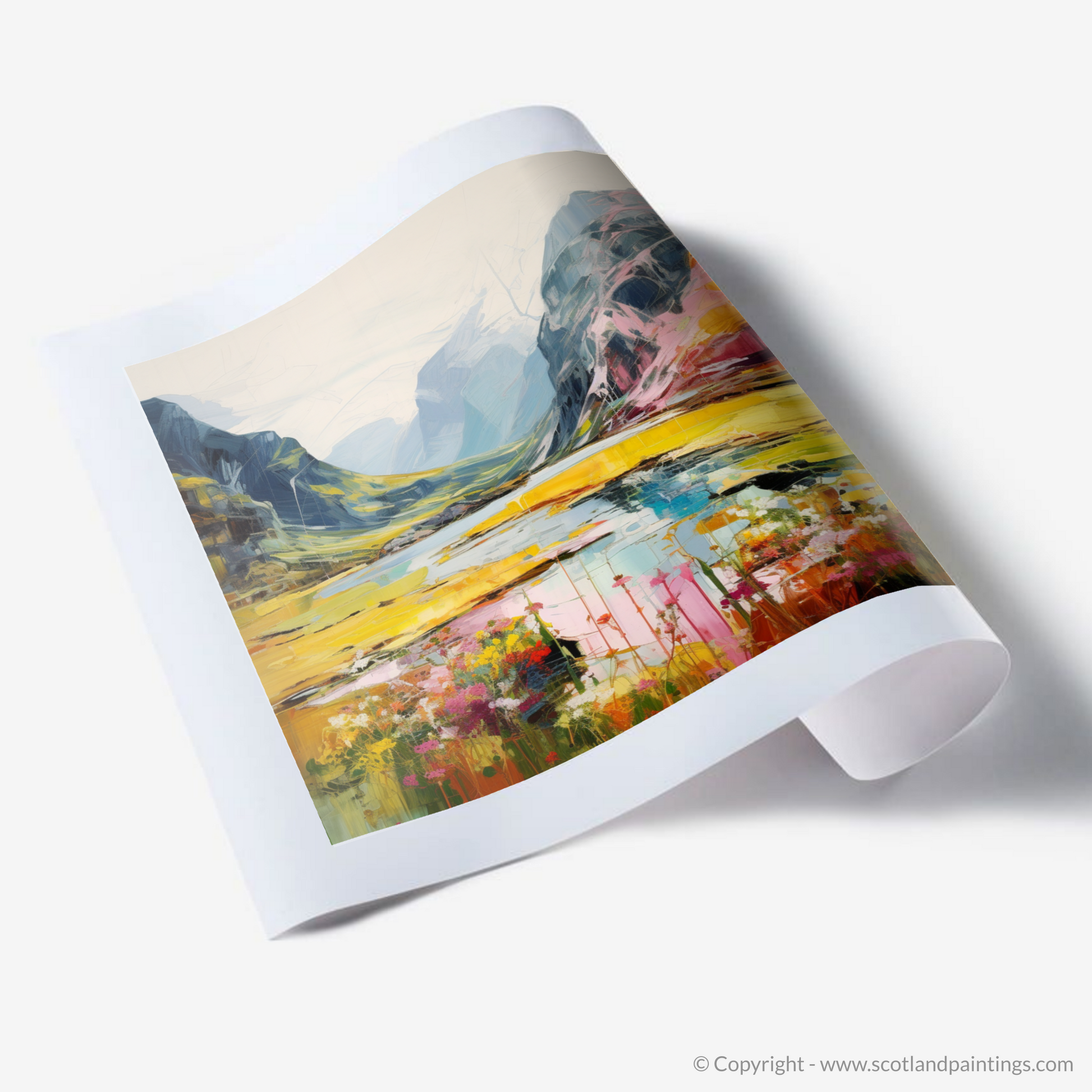 Capturing the vibrant essence of the Scottish Highlands during the peak of summer, this exquisite print transports viewers to the awe-inspiring Glen Coe. The lush depiction features an array of warm, sun-kissed tones that dance across the canvas, reflecting the dynamic and ever-changing light of the season. Bold brushstrokes in a contemporary style bring a modern twist to the classic landscape, blending realism with an abstract flair.