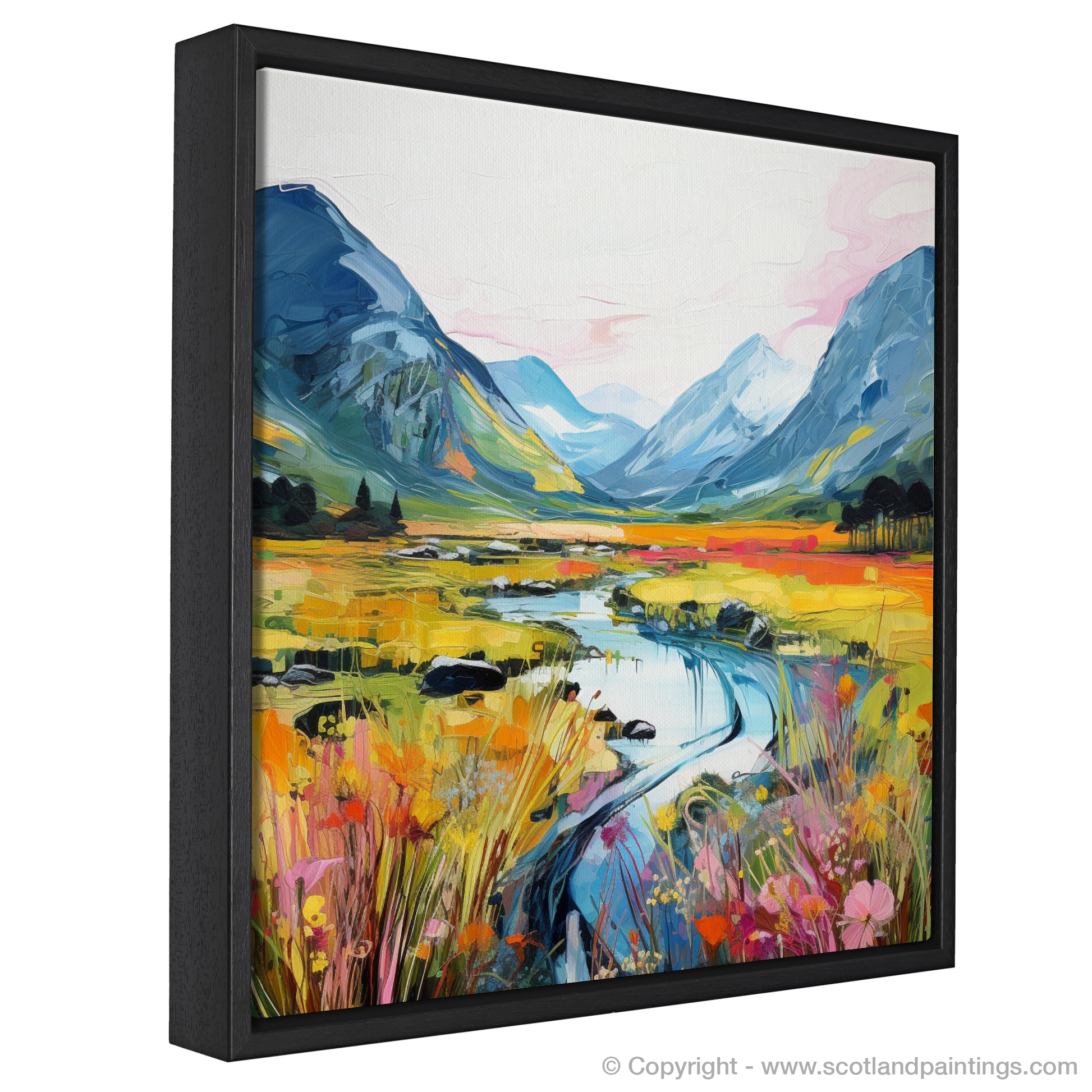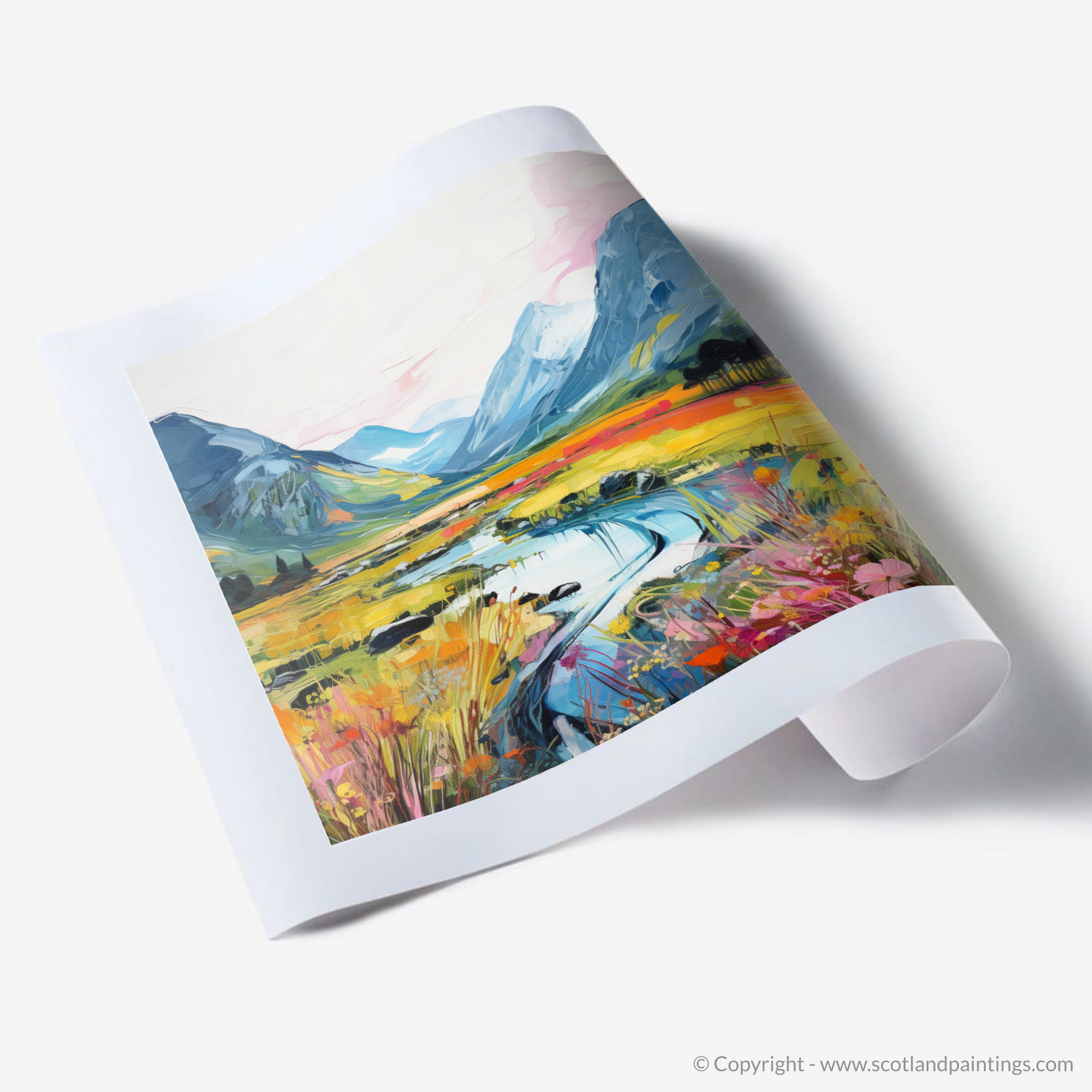 Capturing the vibrant essence of the Scottish Highlands during the warm embrace of summer, this exquisite print is a testament to nature's sprawling beauty. The artwork portrays Glen Coe, a valley of volcanic origins renowned for its panoramic vistas and striking landscapes.