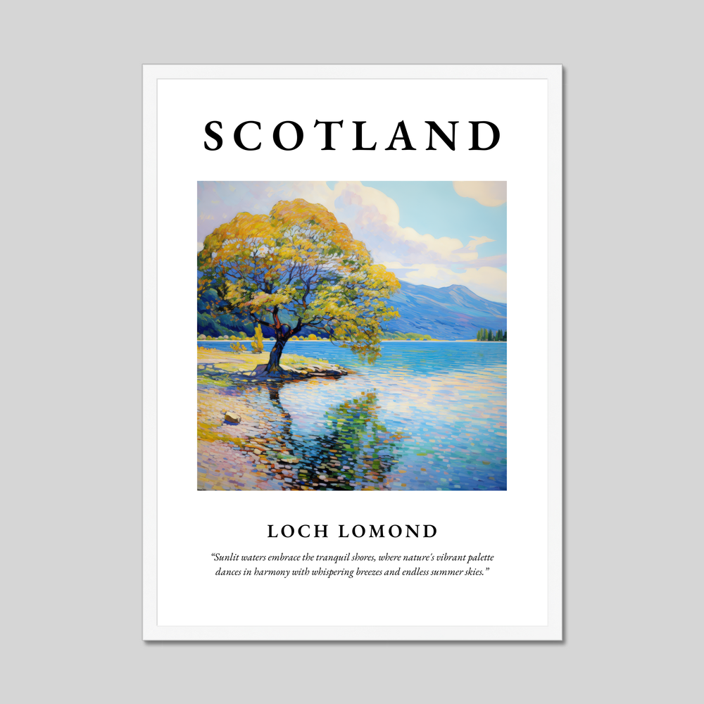 The word “SCOTLAND” stands boldly at the top, guiding your eyes to a stunning Impressionist painting of Loch Lomond. The art captures the essence of summer – sunlight dapples the water, vibrant hues dance across the canvas, and the landscape is alive with the gentle whispers of nature. Beneath the tranquillity of the scene, a quote reminds us of the enchanting allure: “Sunlit waters embrace the tranquil shores, where nature's vibrant palette dances in harmony with whispering breezes and endless summer skies.”