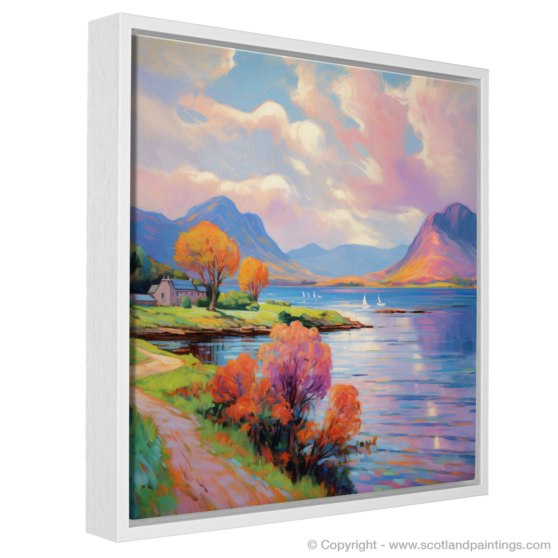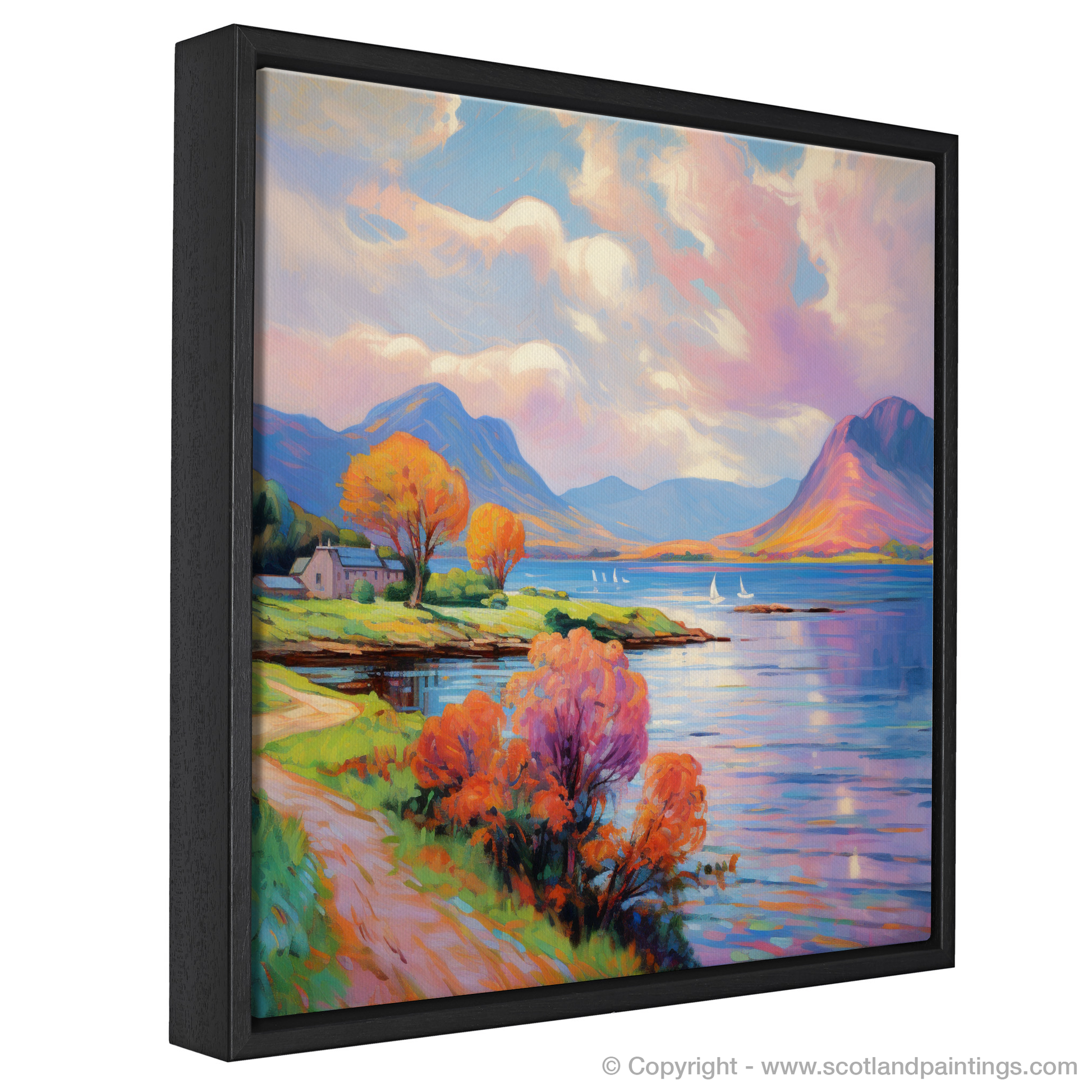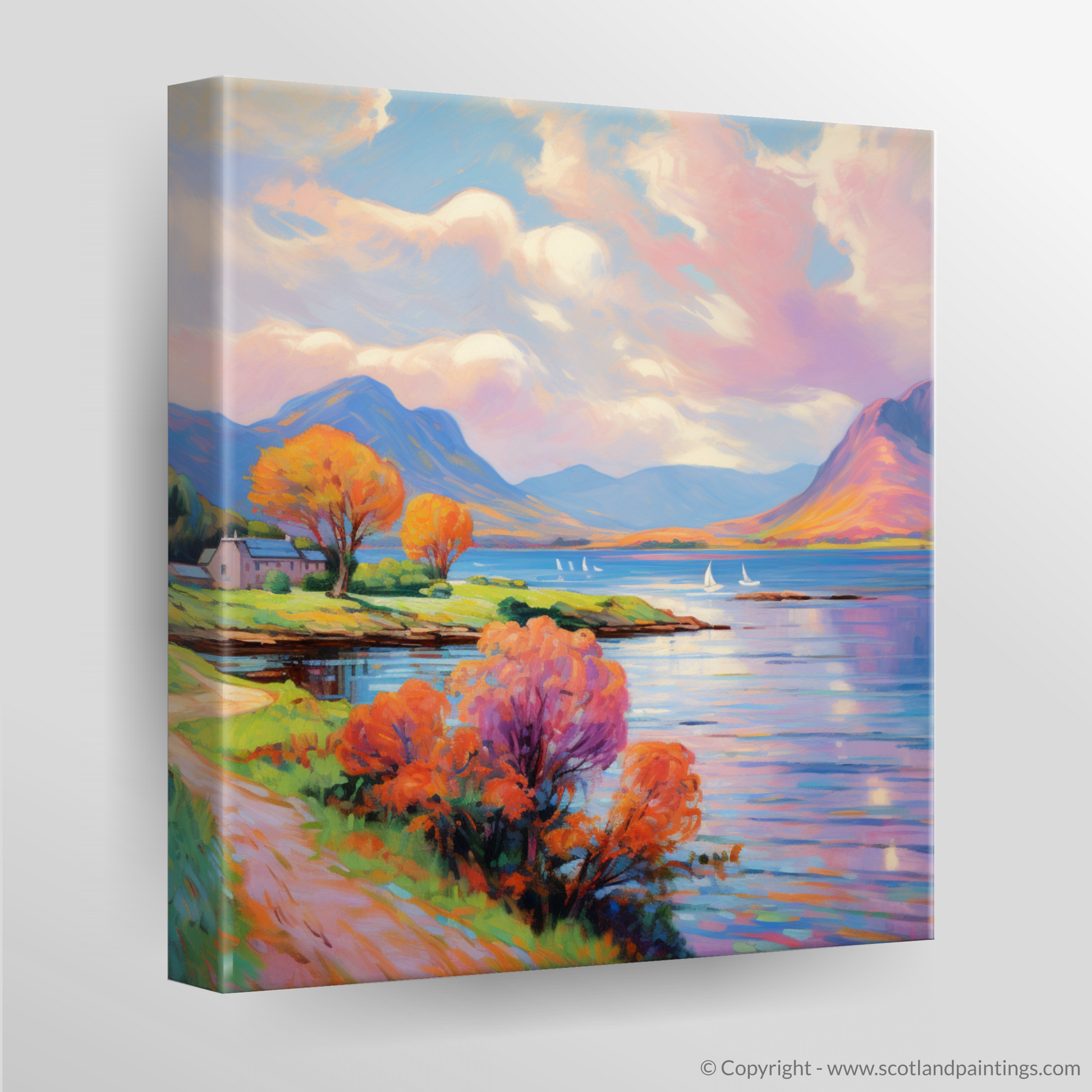 Capturing the serene beauty of the Scottish Highlands, this vibrant print brings to life the picturesque scenery of Loch Leven during the blissful summer months. The canvas is awash with the warm glow of the sun as it casts a tapestry of vivid hues across the landscape. Bursts of orange and pink flora in the foreground stand in striking contrast to the cool, tranquil blues of the loch.