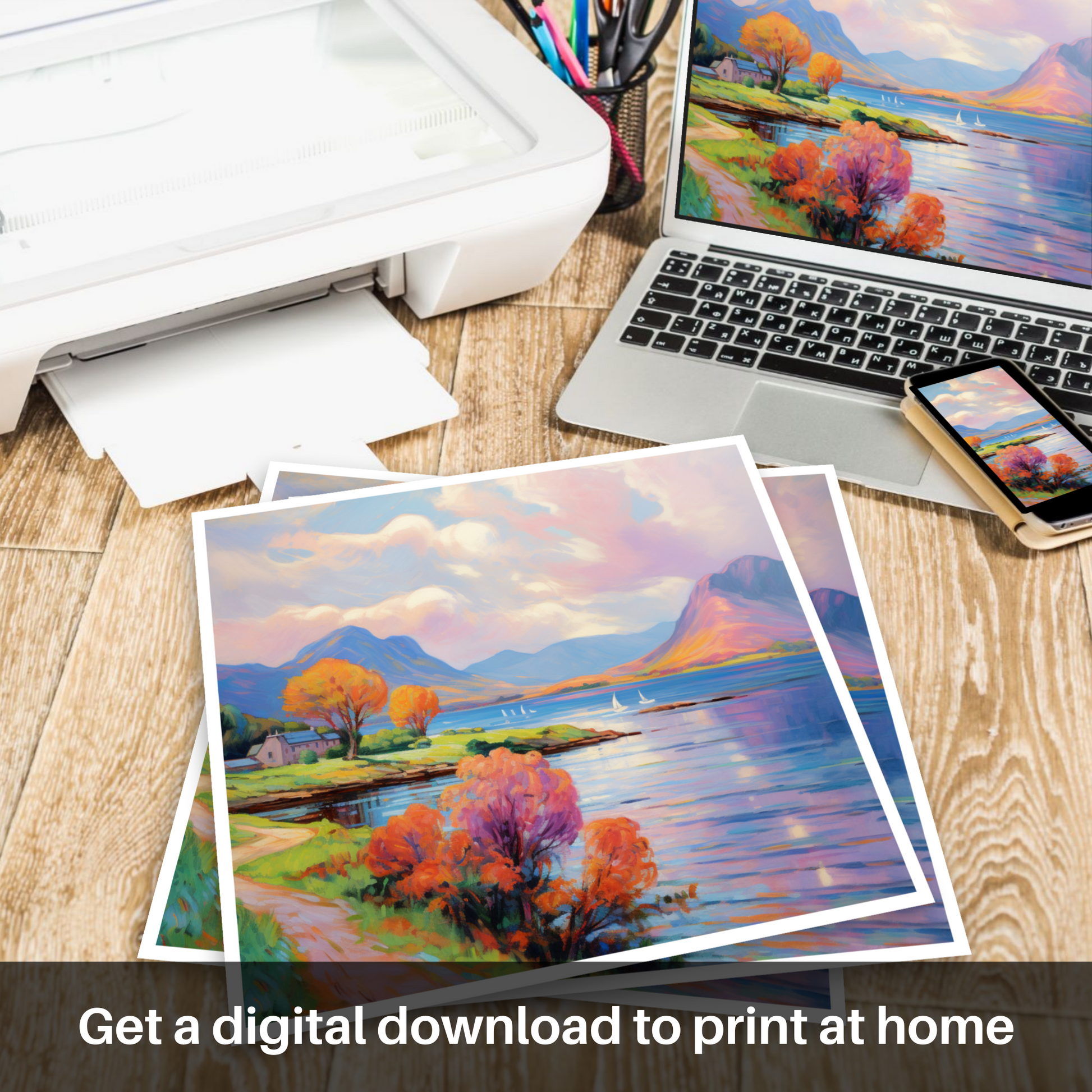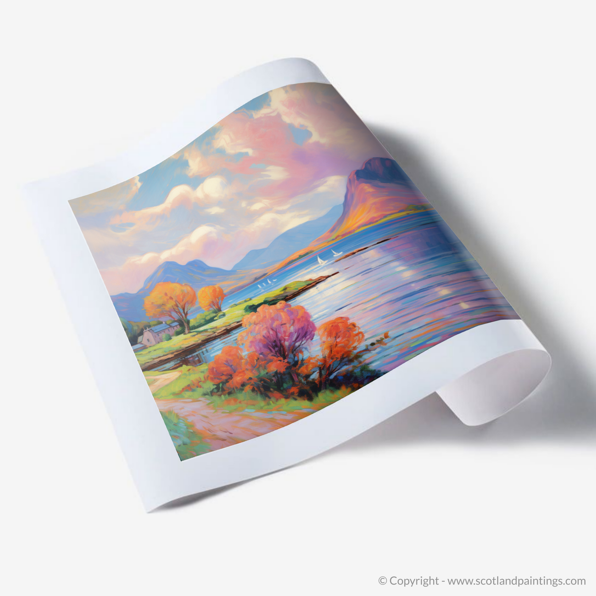 Rendered in an impressionistic style, the brushstrokes convey both the dynamism and the stillness of a Highland summer's eve. This print stands as a testament to the enduring allure of Scotland's natural grandeur, a celebration of colour and light that is sure to enchant and inspire viewers, bringing the essence of a Scottish summer into any space.
