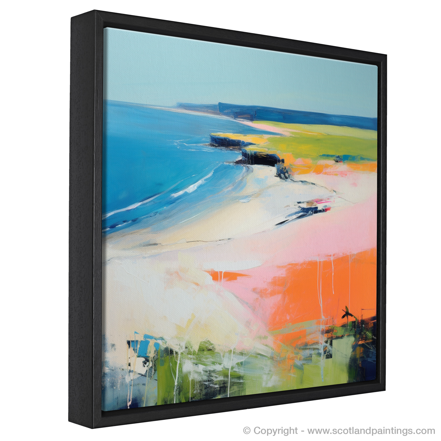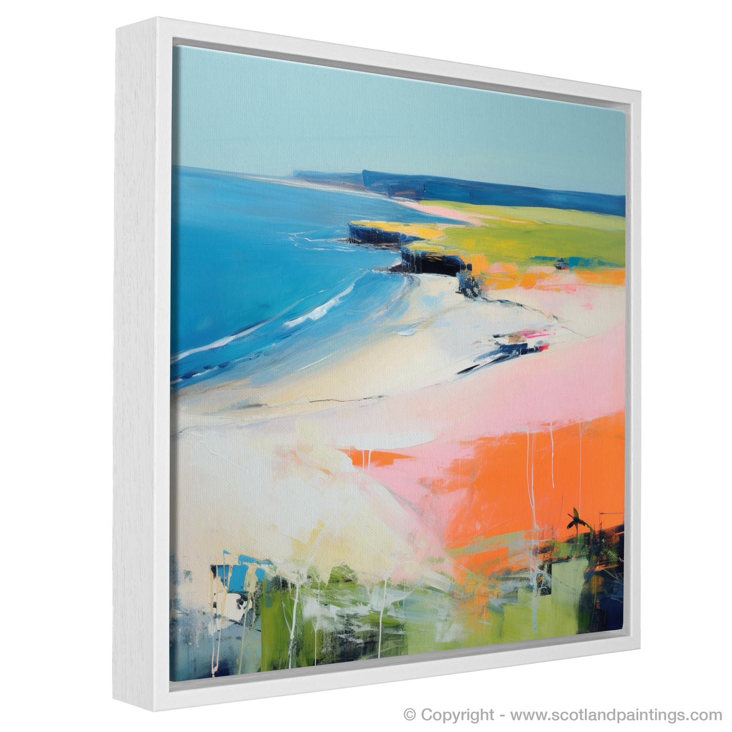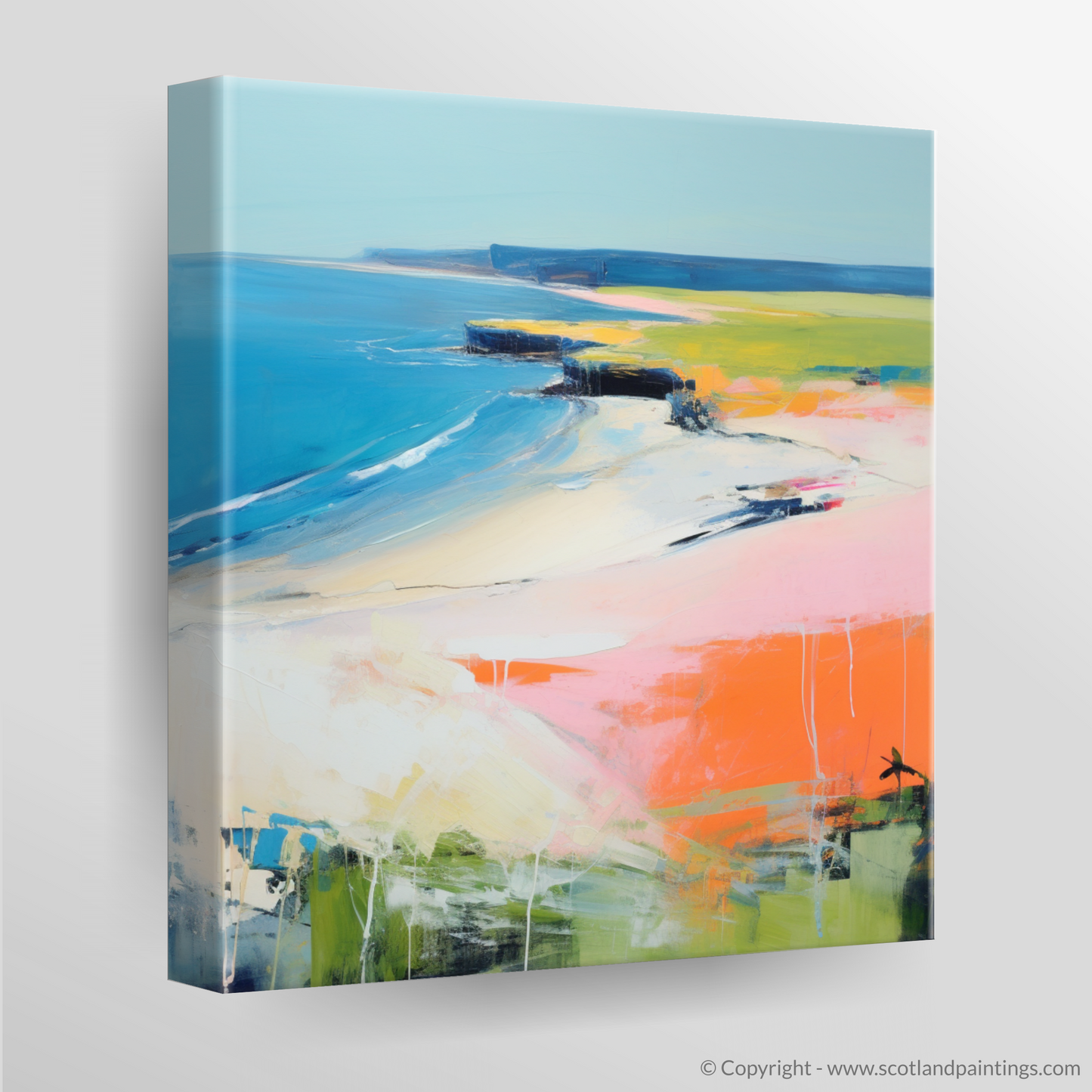 Captivate your senses with this striking abstract interpretation of Lunan Bay, Angus, a cherished jewel in Scotland's coastal crown. Bold, sweeping strokes of azure and cerulean evoke the vast, open sky and the rhythmic dance of the waves along the shoreline. Vivid swatches of golden yellow and fresh green suggest the wildflower-speckled meadows and grassy dunes that embrace the bay during the height of summer.