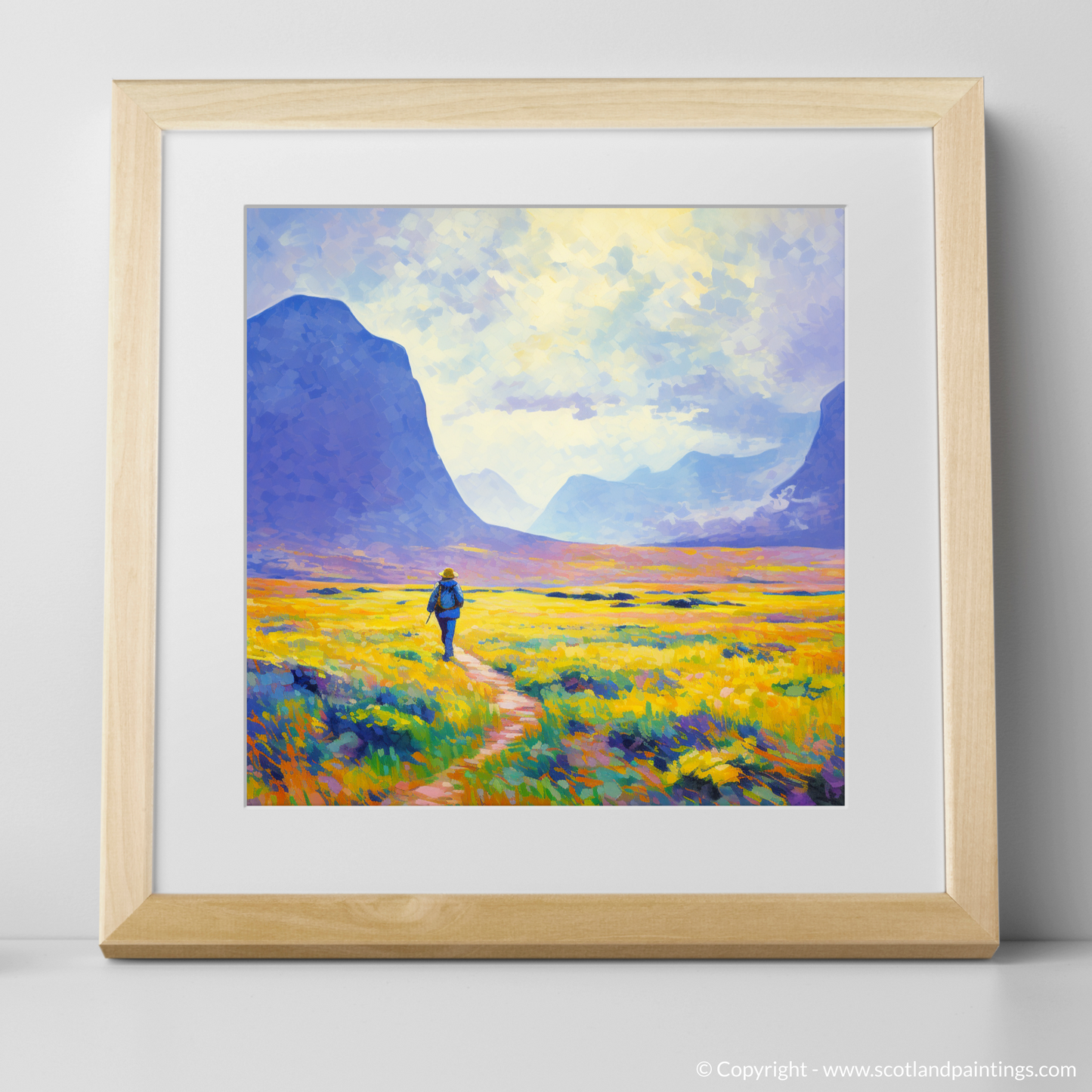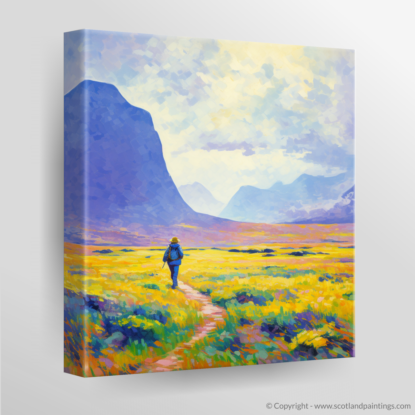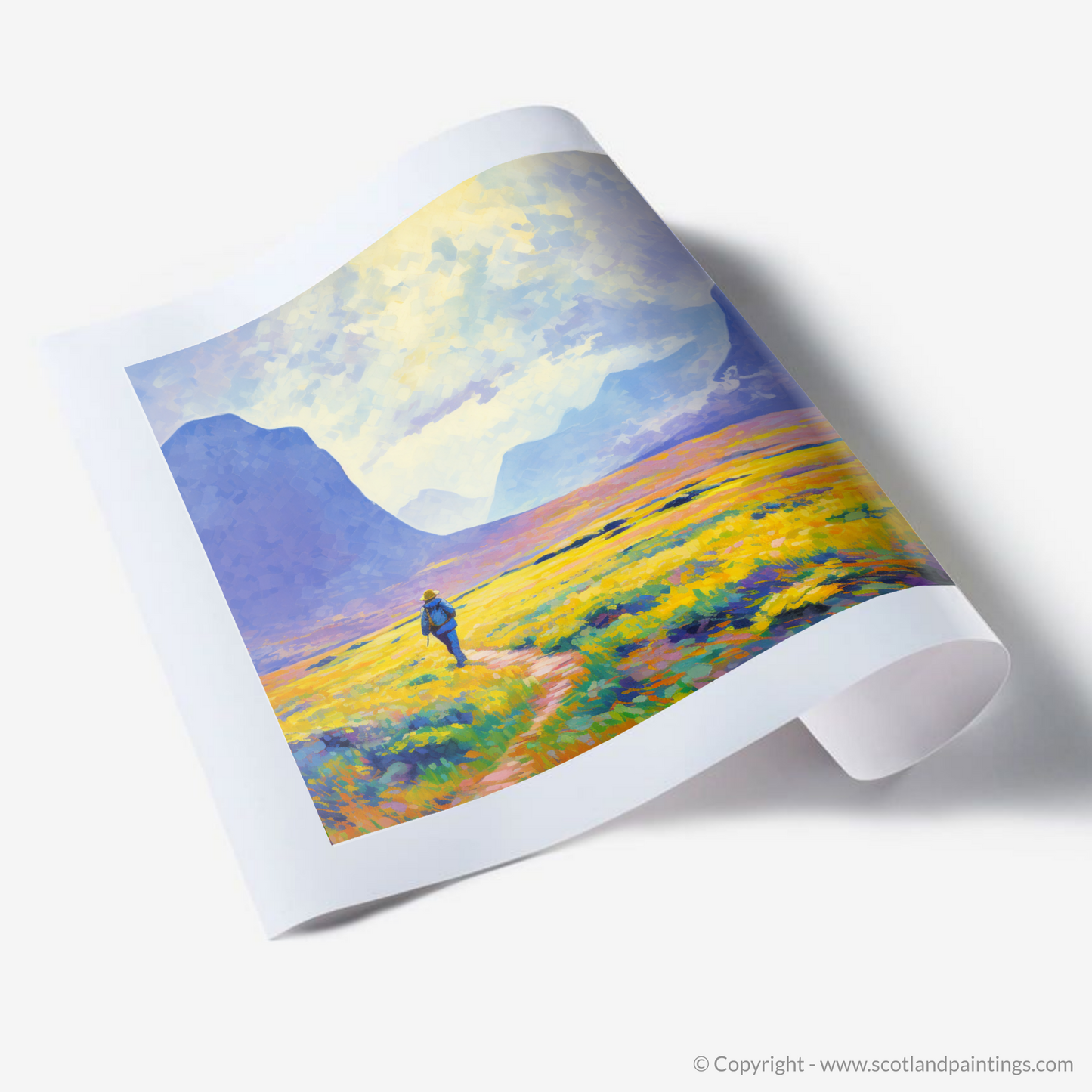 Capturing the serene beauty of the Scottish Highlands, this evocative print brings the vibrant hues of a Glencoe summer to the fore. Bathed in the soft glow of sunlight, the composition is alive with the palpable energy of the wild landscape. A solitary hiker, rendered in bold strokes of blue, serves as a dynamic focal point, creating a harmonious juxtaposition against the warm golden tones of the blooming heather.