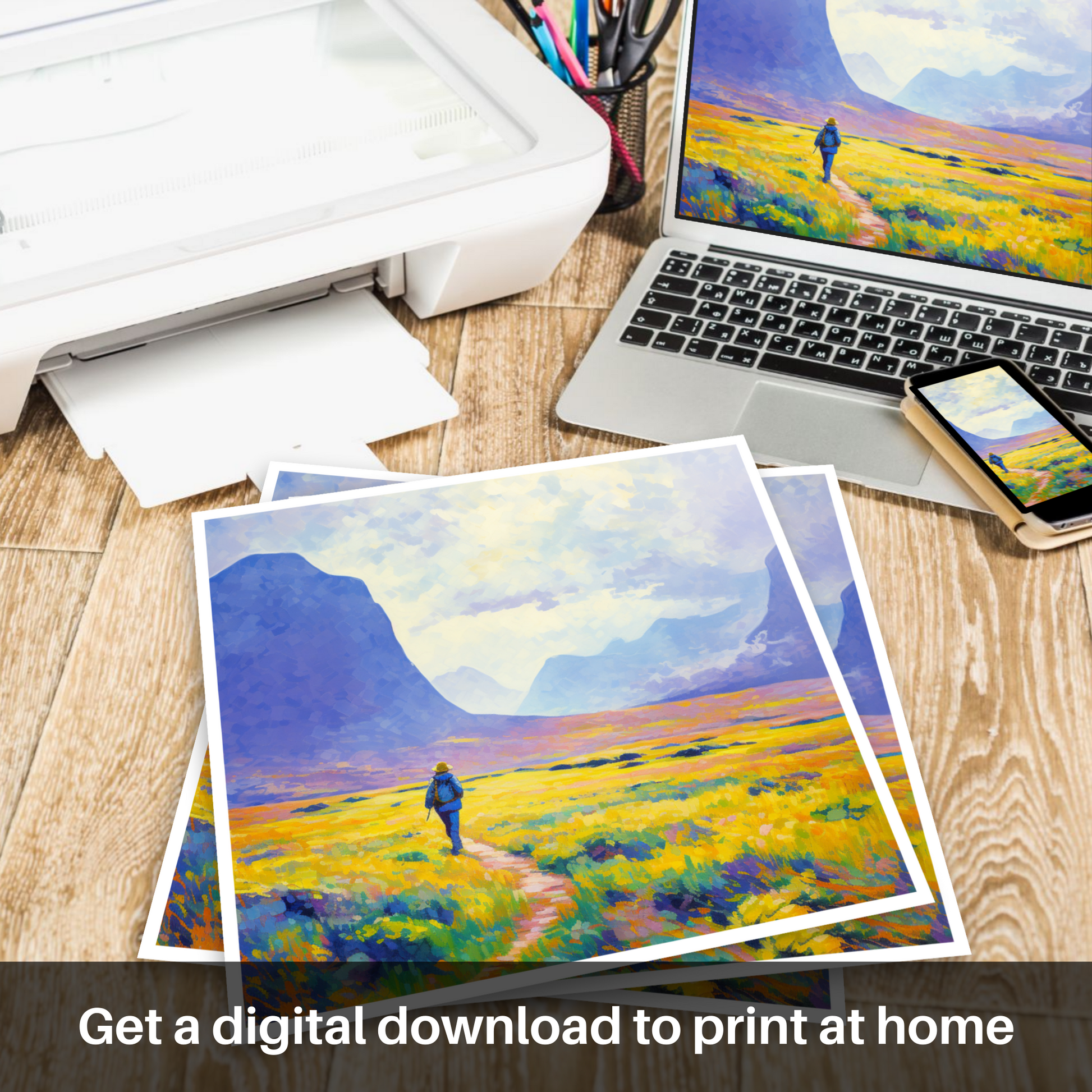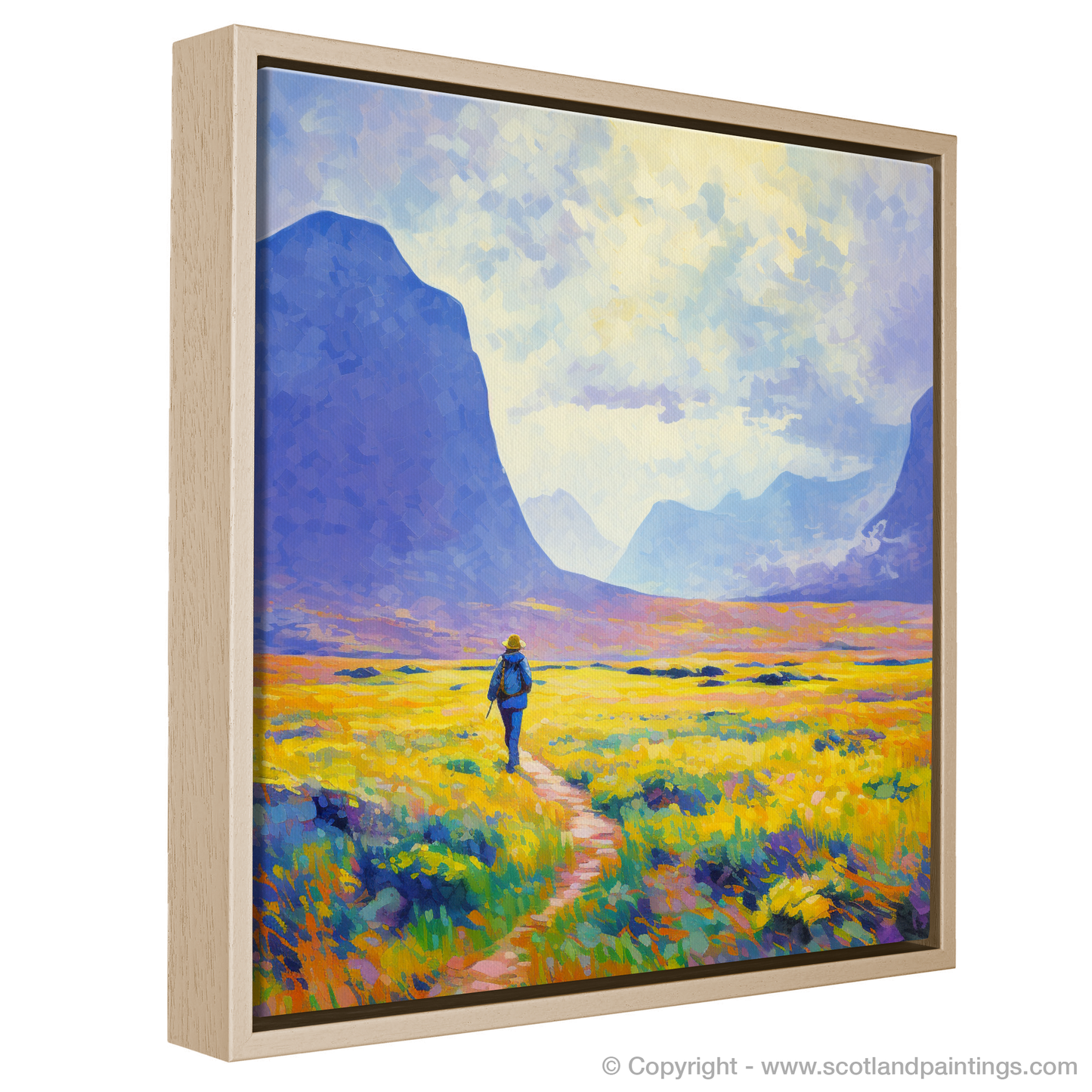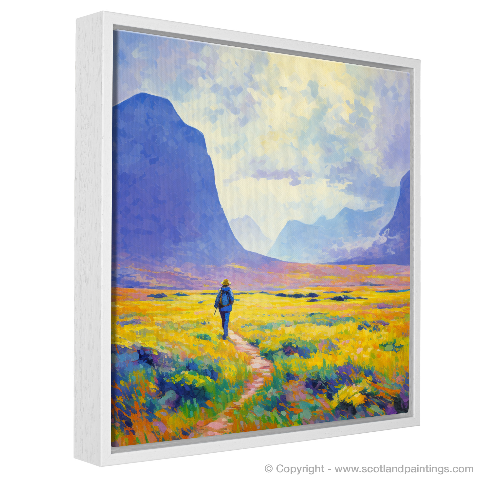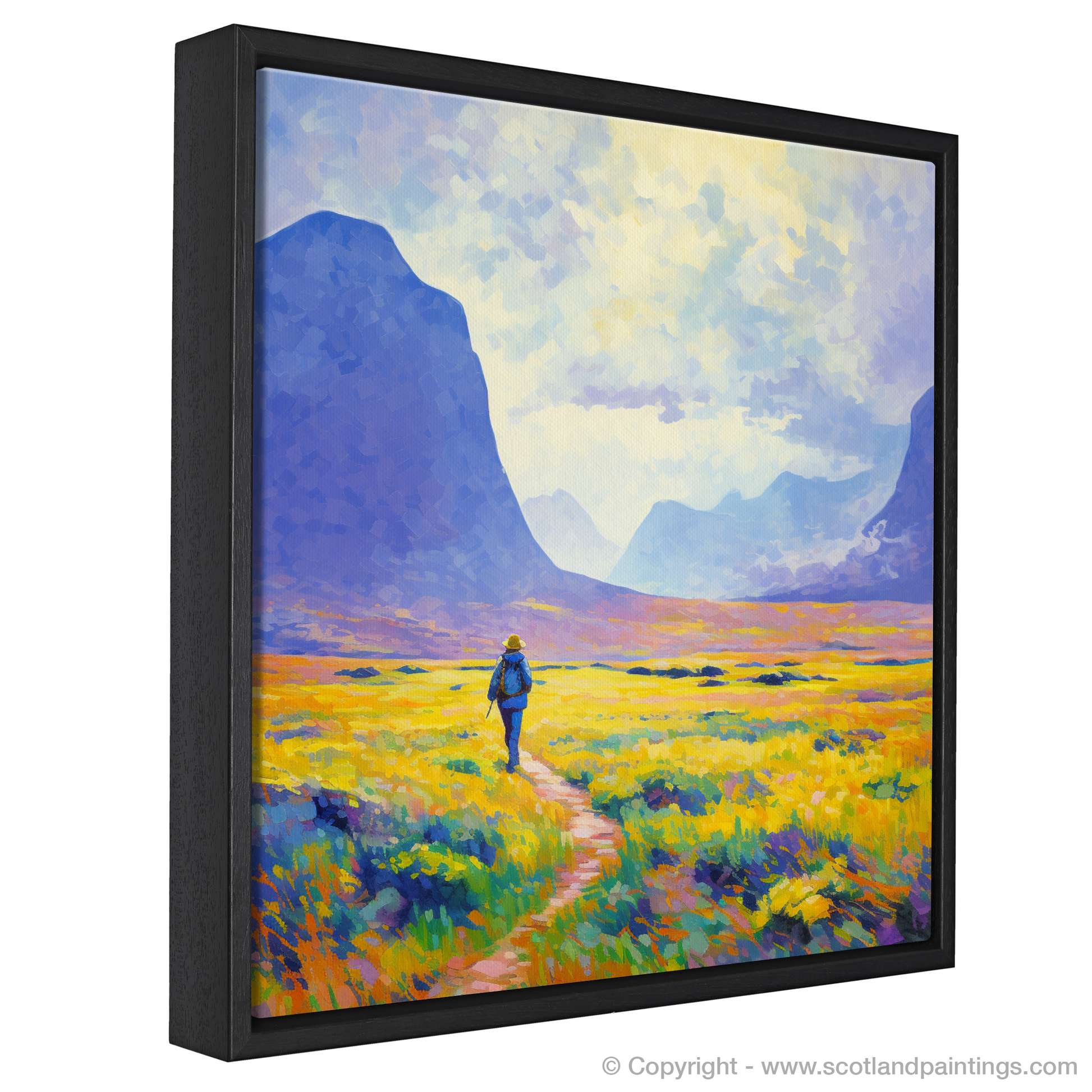 Capturing the serene beauty of the Scottish Highlands, this evocative print brings the vibrant hues of a Glencoe summer to the fore. Bathed in the soft glow of sunlight, the composition is alive with the palpable energy of the wild landscape. A solitary hiker, rendered in bold strokes of blue, serves as a dynamic focal point, creating a harmonious juxtaposition against the warm golden tones of the blooming heather.