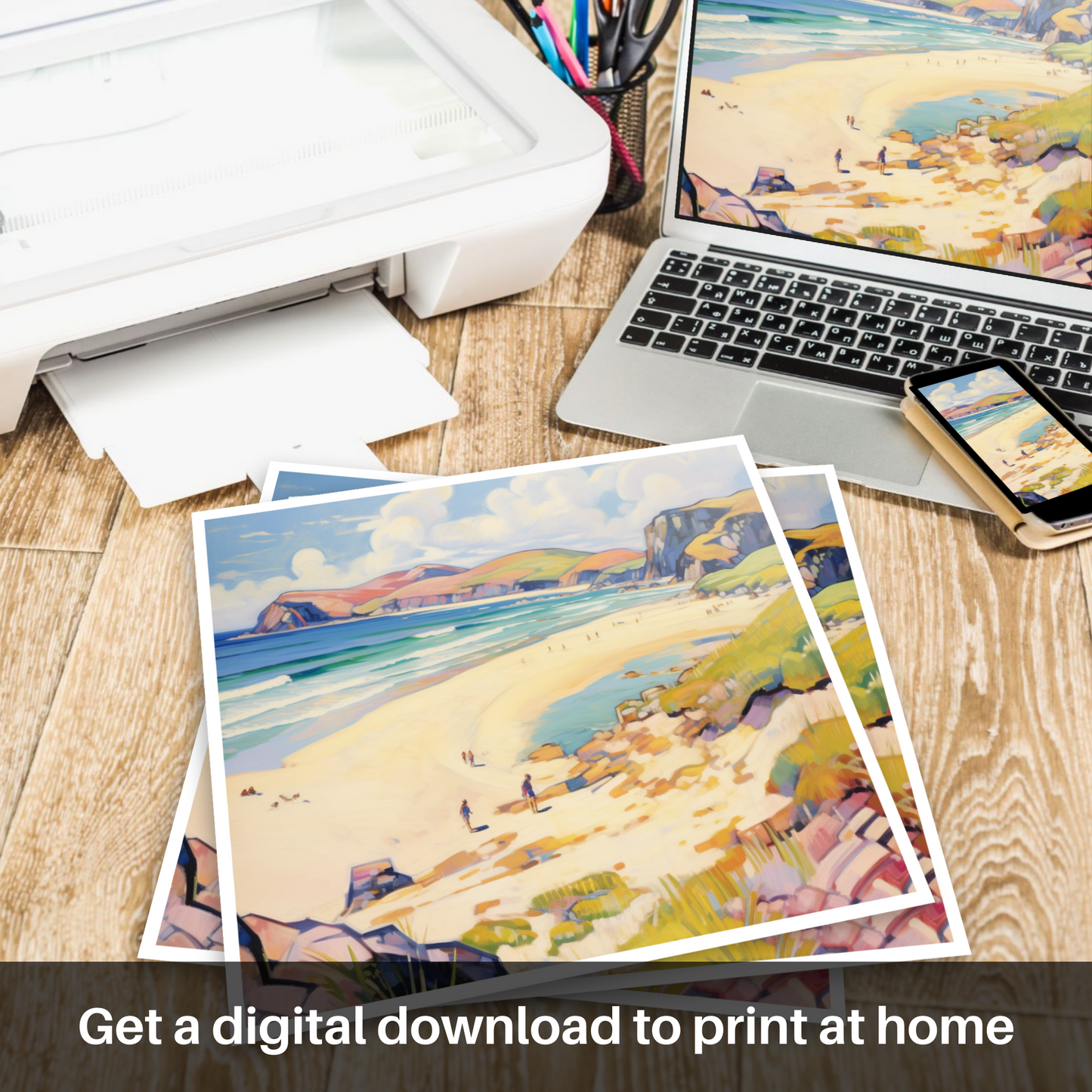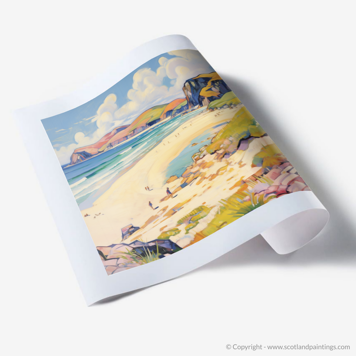 Capture the vibrant essence of a Scottish summer with this captivating print, inspired by the serene beauty of Sandwood Bay, Sutherland. The artwork invites you into a world where the boundaries between land, sea, and sky are joyfully reimagined through a brilliant fauvist palette.