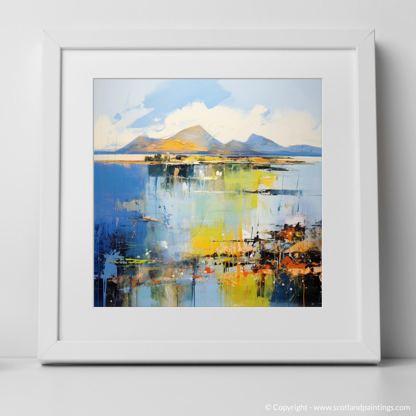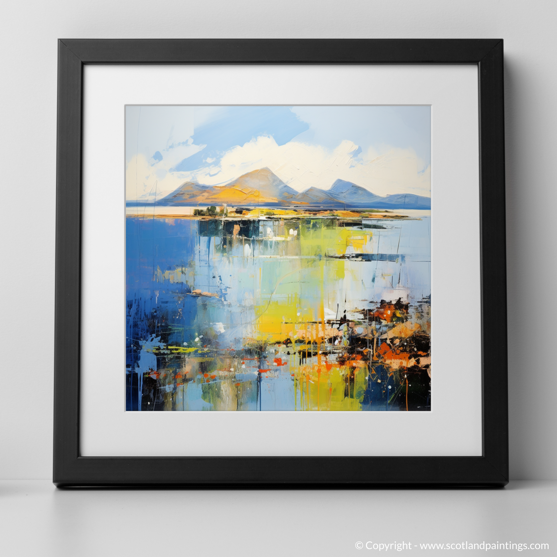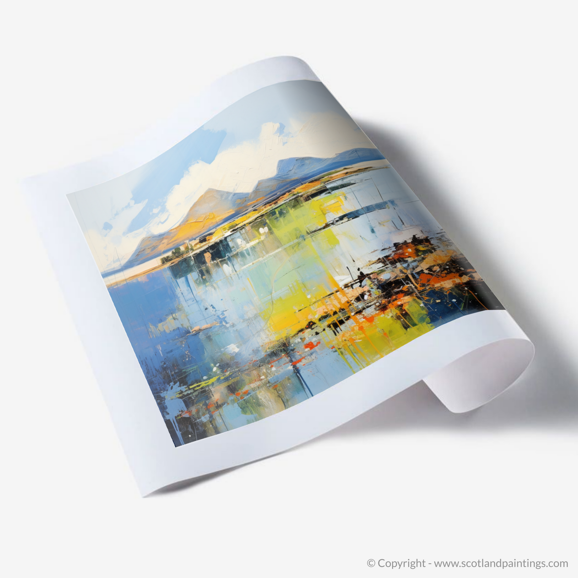 Capturing the essence of the Isle of Arran as viewed from the Firth of Clyde during the vibrant summer months, this abstract piece is a symphony of colour and texture, offering a fresh perspective on traditional landscape art. At first glance, the azure and cerulean hues of the sea merge with the sky, giving a nod to the Isle's coastal charm. The foreground of the print is a kaleidoscope of citrus yellows, warm oranges, and splashes of white, an abstract representation of the sun-drenched shoreline and the island's diverse flora.