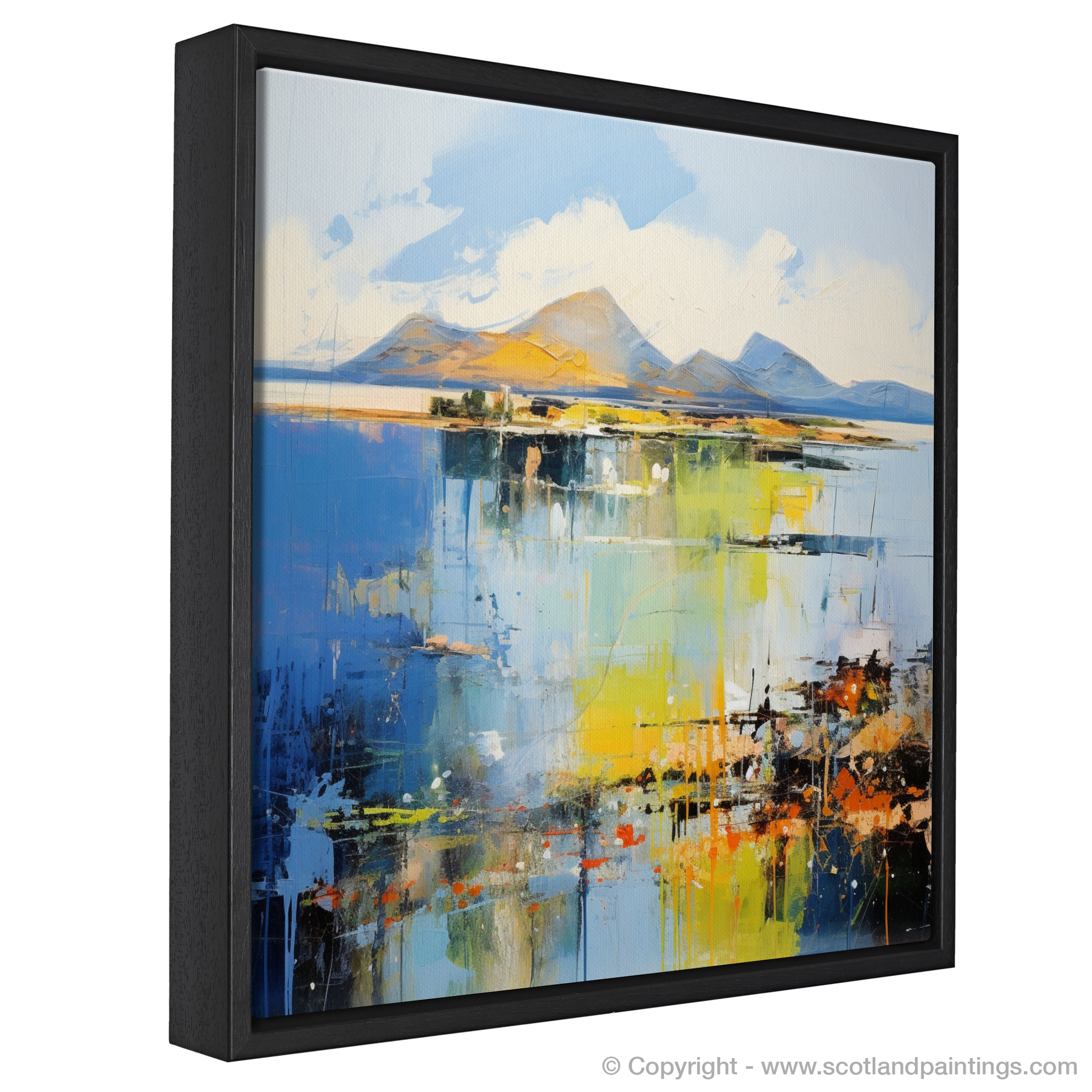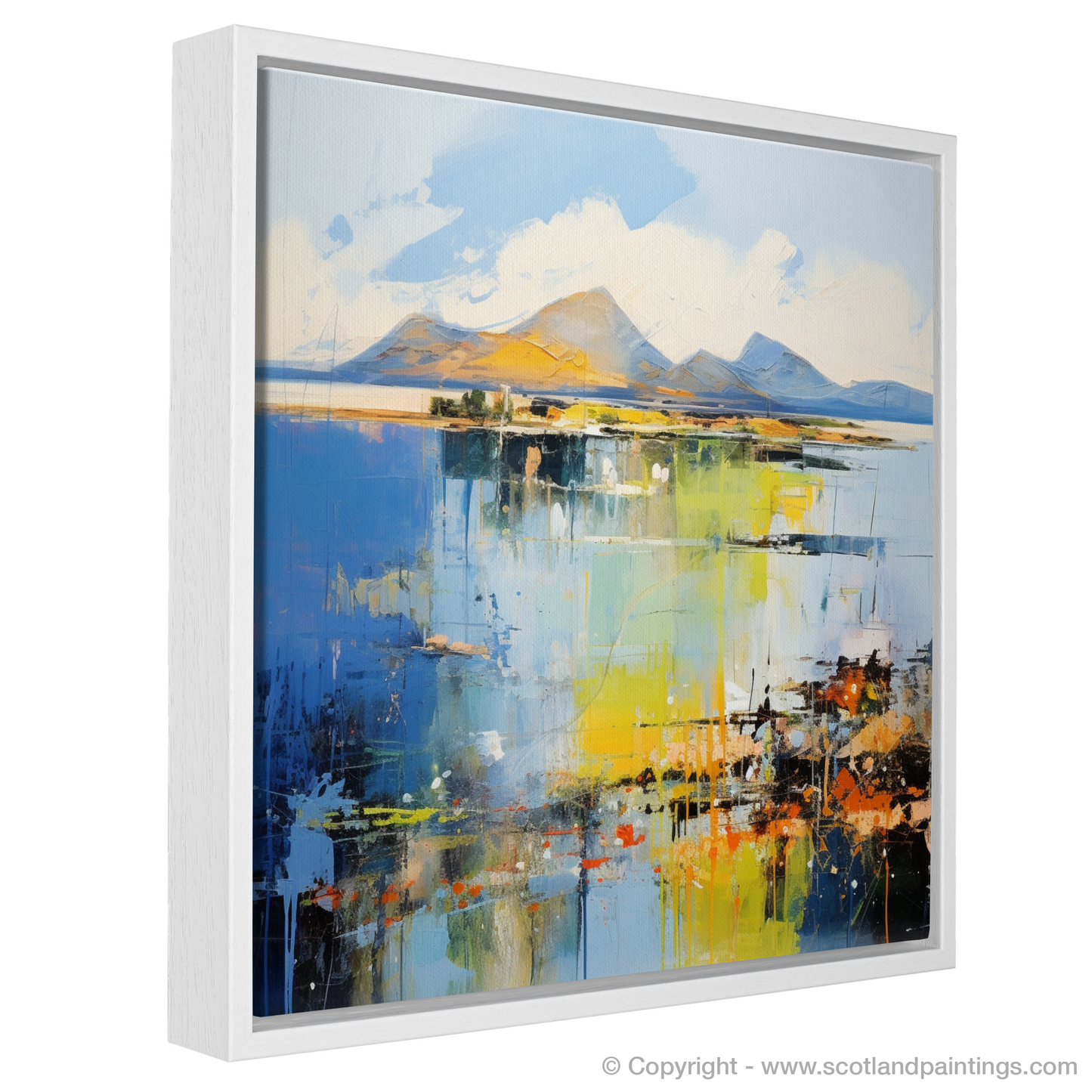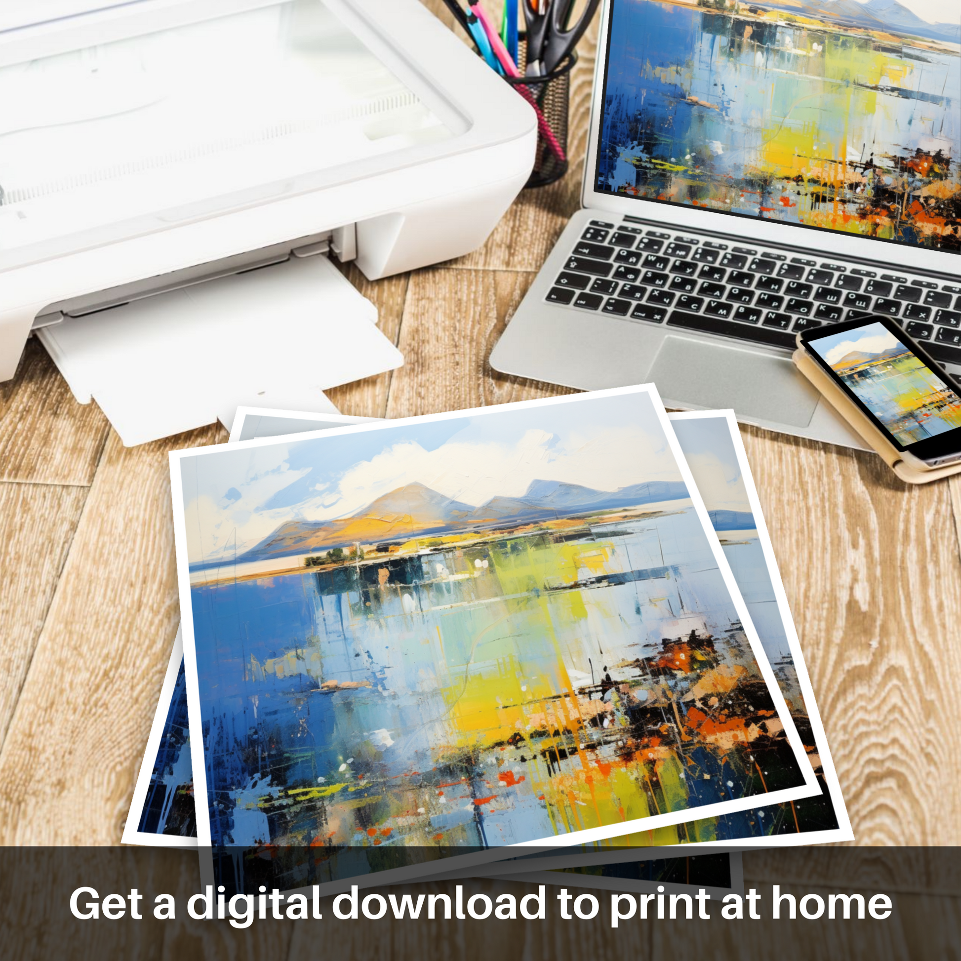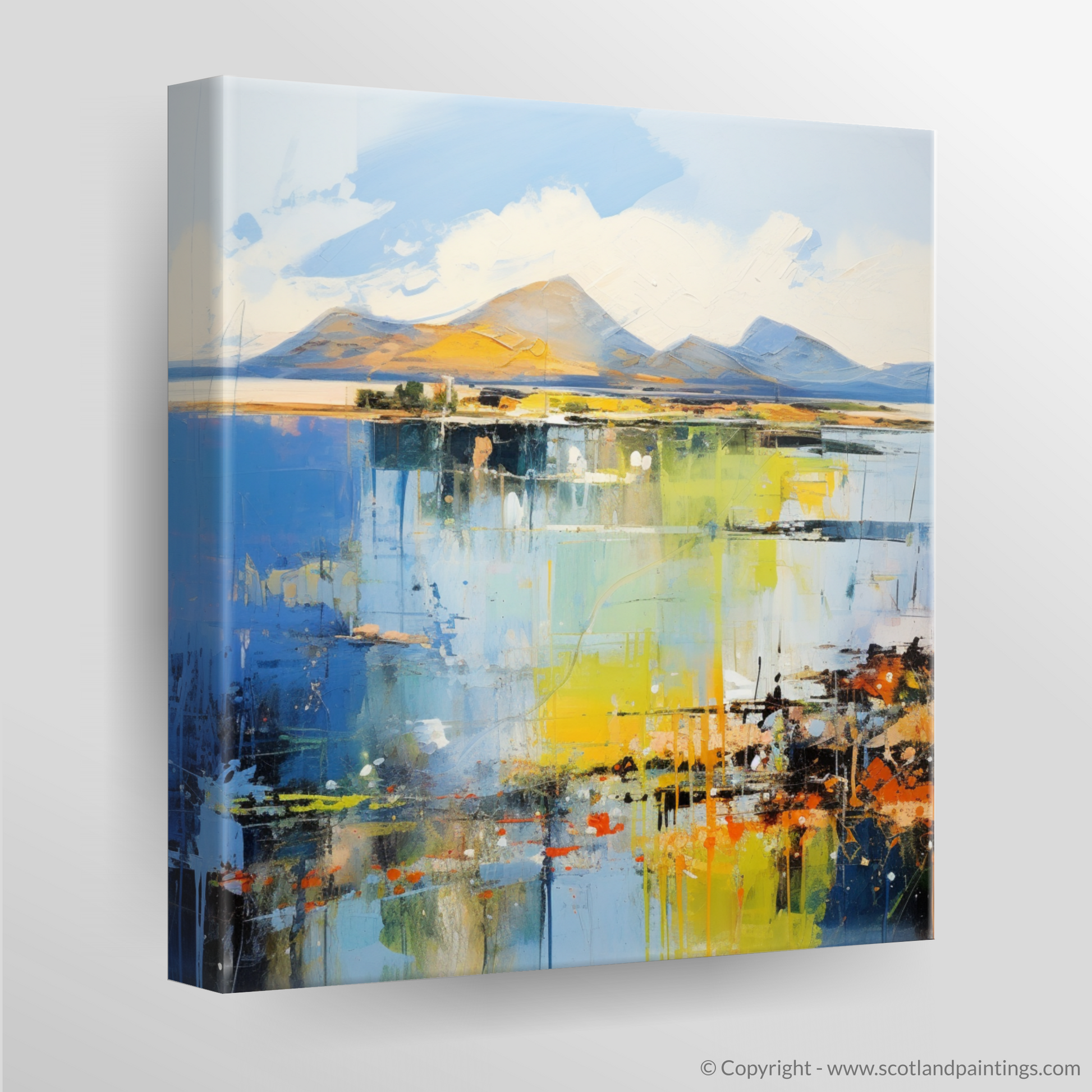Capturing the essence of the Isle of Arran as viewed from the Firth of Clyde during the vibrant summer months, this abstract piece is a symphony of colour and texture, offering a fresh perspective on traditional landscape art. At first glance, the azure and cerulean hues of the sea merge with the sky, giving a nod to the Isle's coastal charm. The foreground of the print is a kaleidoscope of citrus yellows, warm oranges, and splashes of white, an abstract representation of the sun-drenched shoreline and the island's diverse flora.
