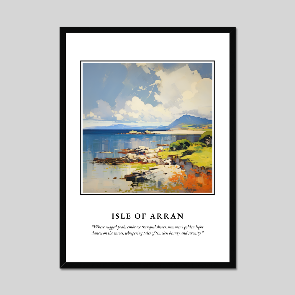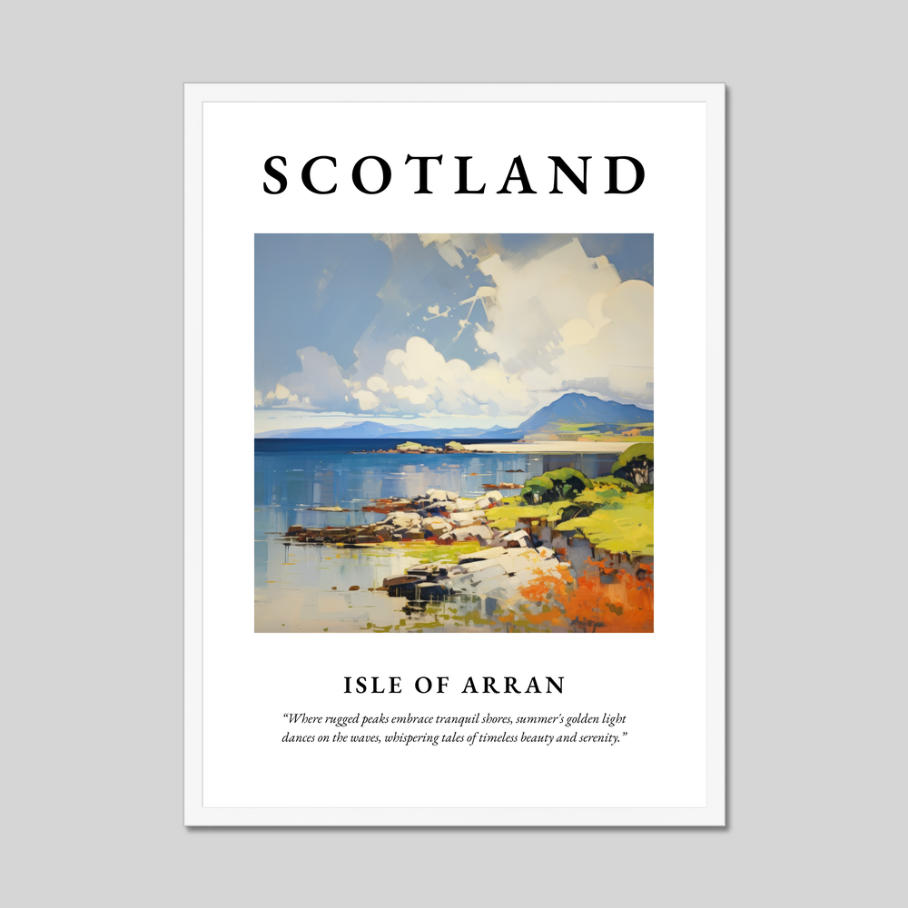 Every glance at this framed poster print may transport you to Arran's sunlit shores, where golden light dances on the waves, and ancient stories are whispered by the gentle breeze. Whether you've visited this magical place, dream of exploring its wild beauty, or simply wish to bring a piece of Scotland's summer into your home, this artwork serves as a gateway to the isle's timeless allure.
