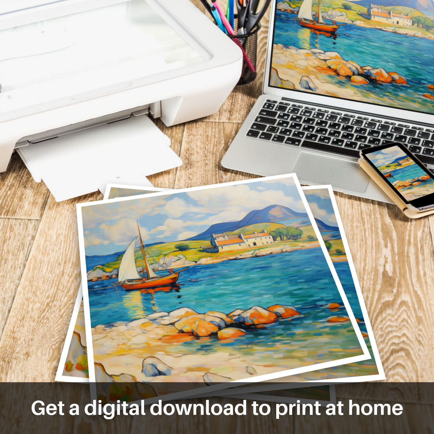This piece is a tribute to the untamed charm of Scotland's natural beauty, capturing a timeless moment of peace and vivid colour that will surely be a conversation starter. It serves as an idyllic reminder of long summer days spent by the sea, appealing to those who cherish the allure of the Scottish coast and the exuberance of Fauvist artistry. Add this print to your collection and let your space be infused with the spirit of a Scottish summer's day.