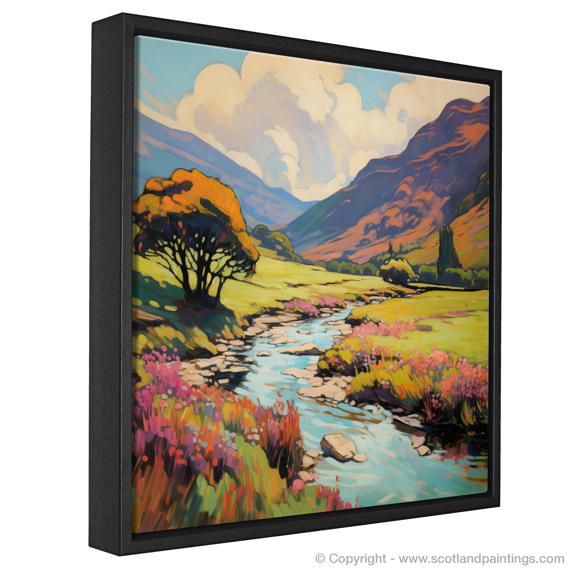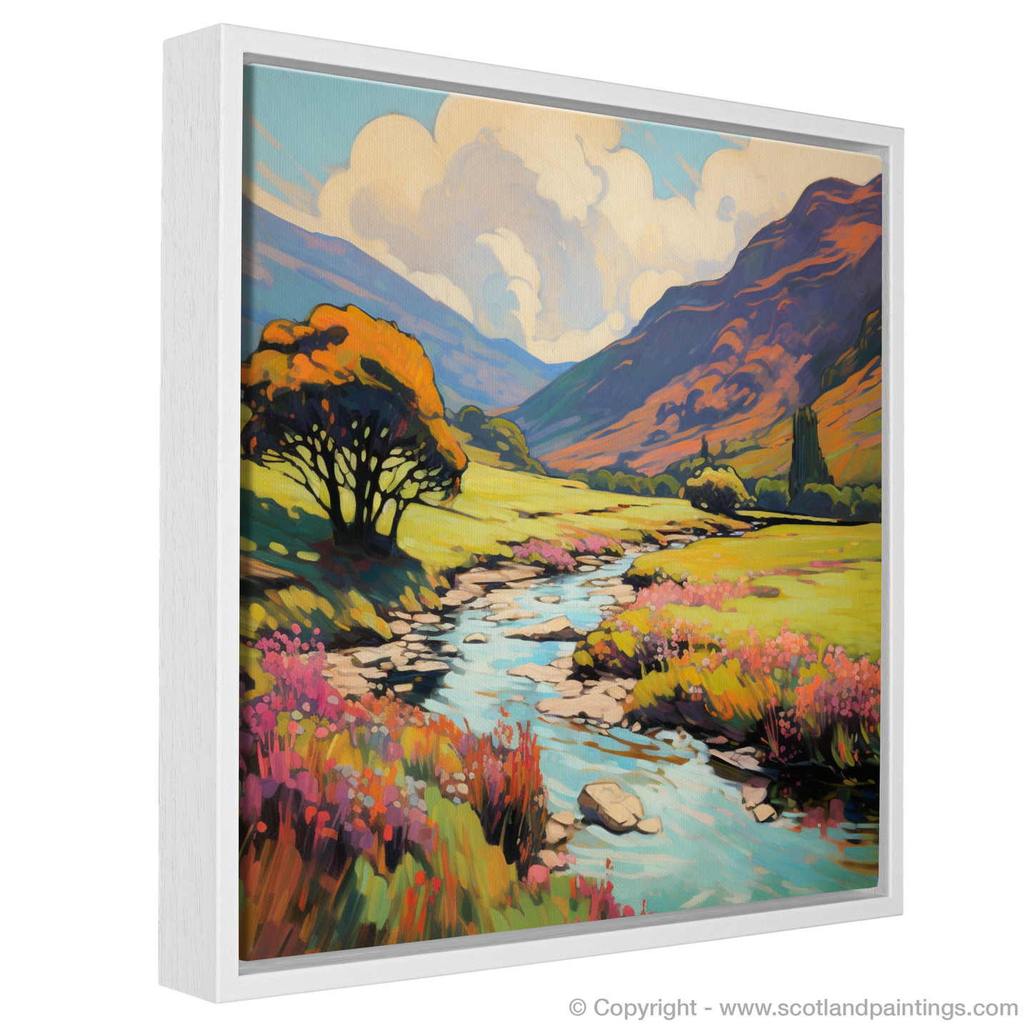 Flourishes of wildflowers edge the riverbanks, their pink and red shades adding a wild, organic contrast to the neatly arranged stones and the calming greens and yellows of the grassy meadows. This print captures a harmony of natural elements, inviting a moment of reflection and a deep appreciation for Scotland's rural beauty. It is an idyllic scene that art and nature lovers alike will treasure, offering a perpetual glimpse into an everlasting summer.