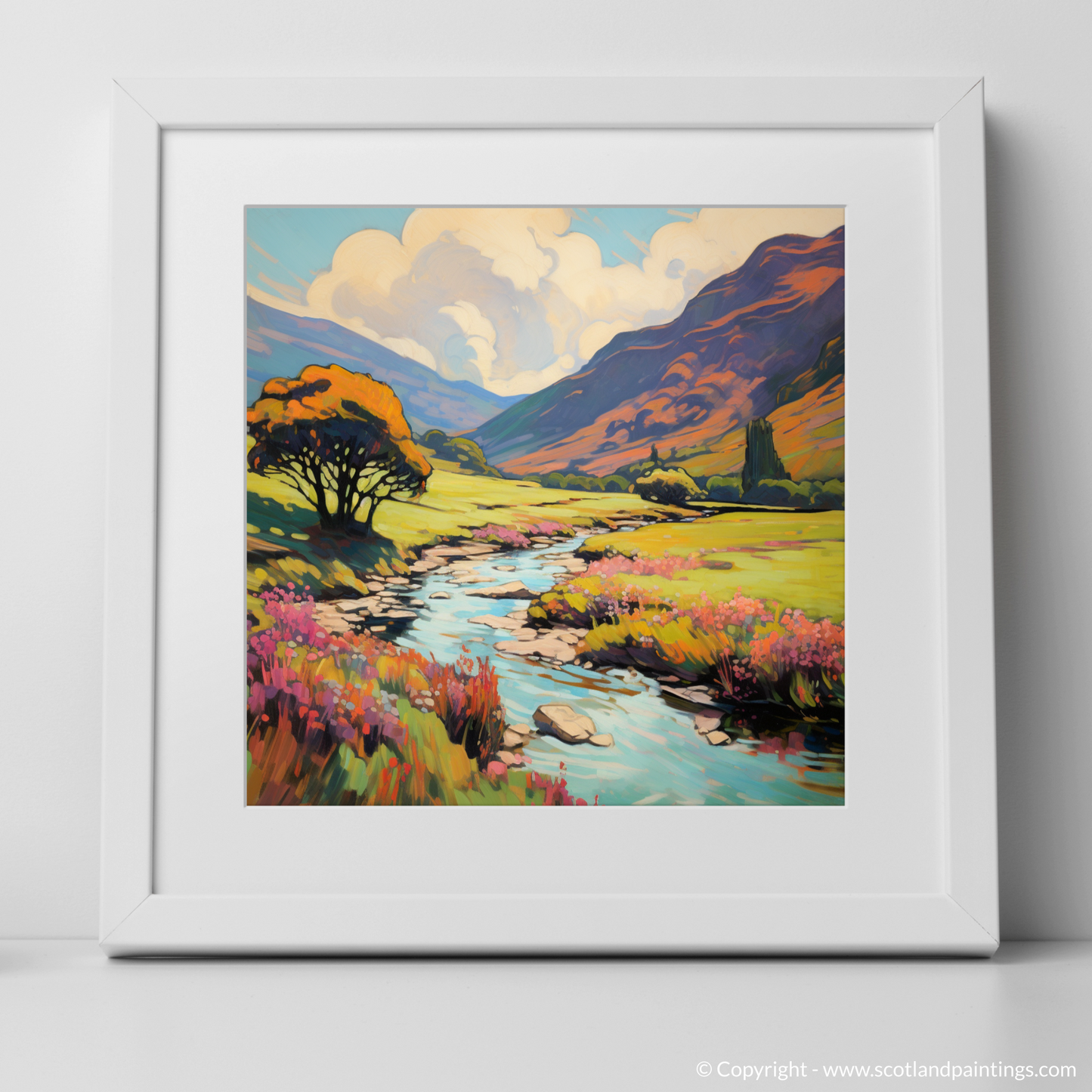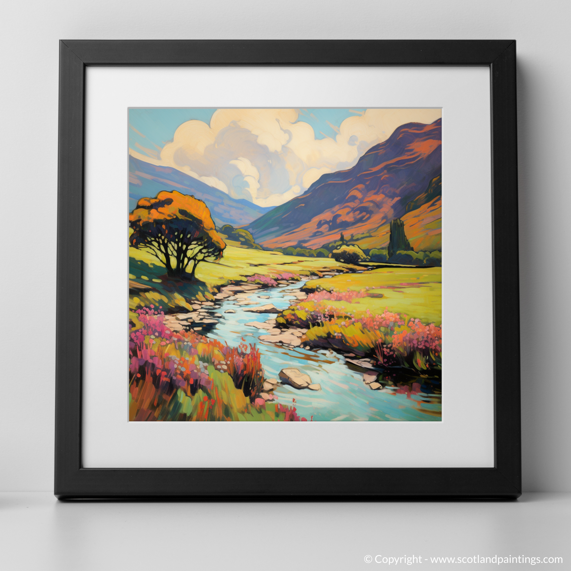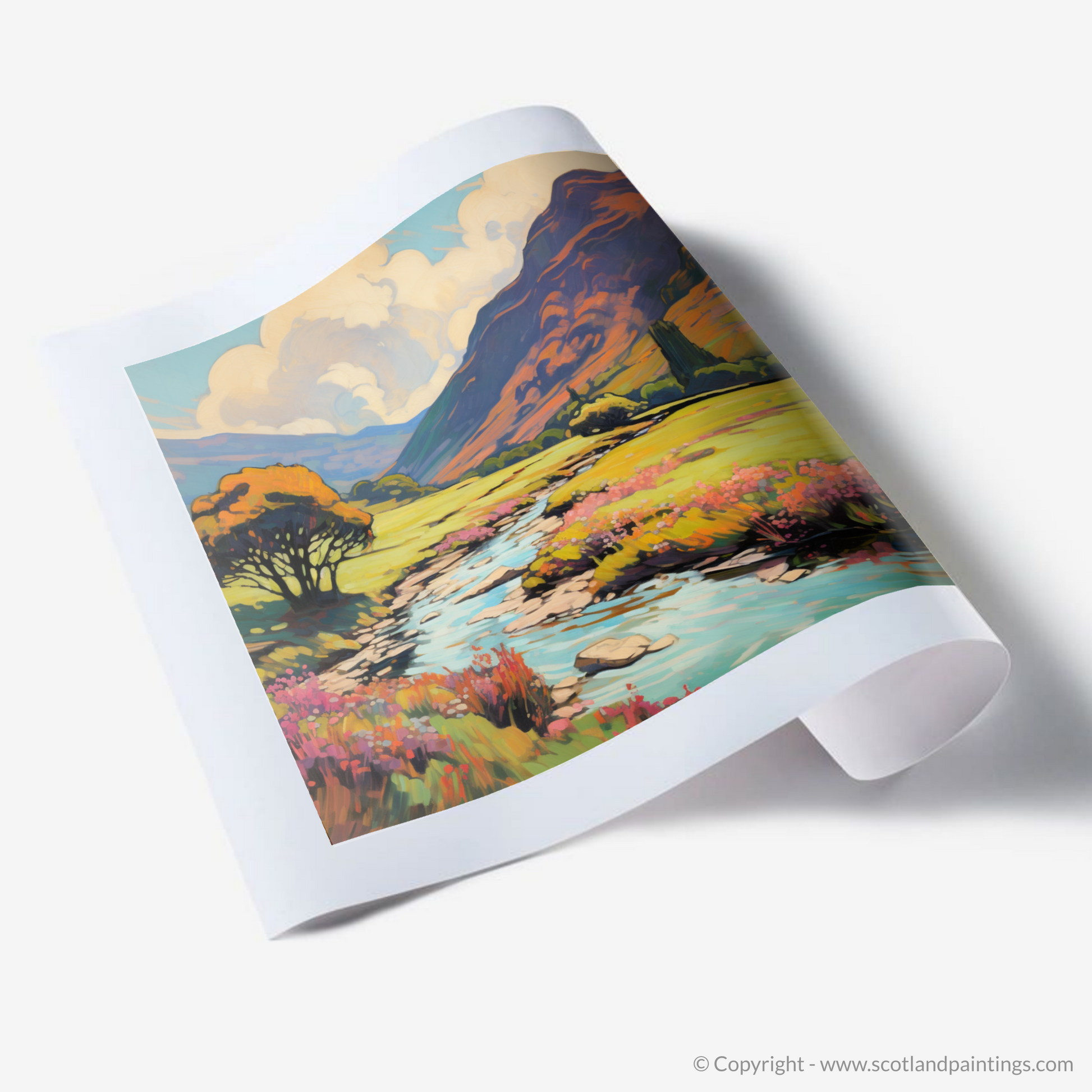 This captivating print brings to life the serene beauty of Glen Doll, Angus during the height of summer. The eye is greeted by a vibrant palette that captures the warmth of the season with hues of pink, orange, and yellow dominating the canvas, evoking the feel of a sun-drenched Scottish glen.