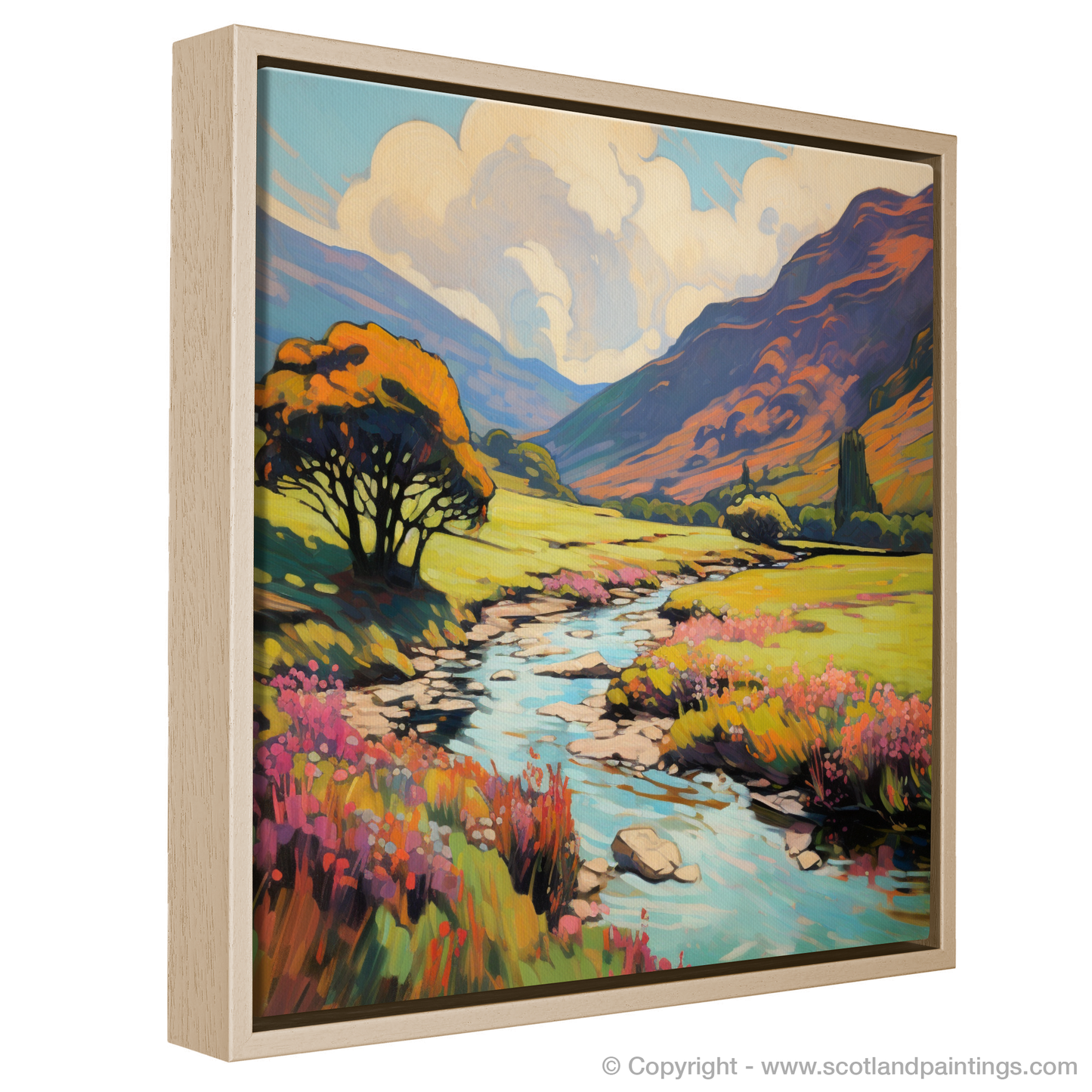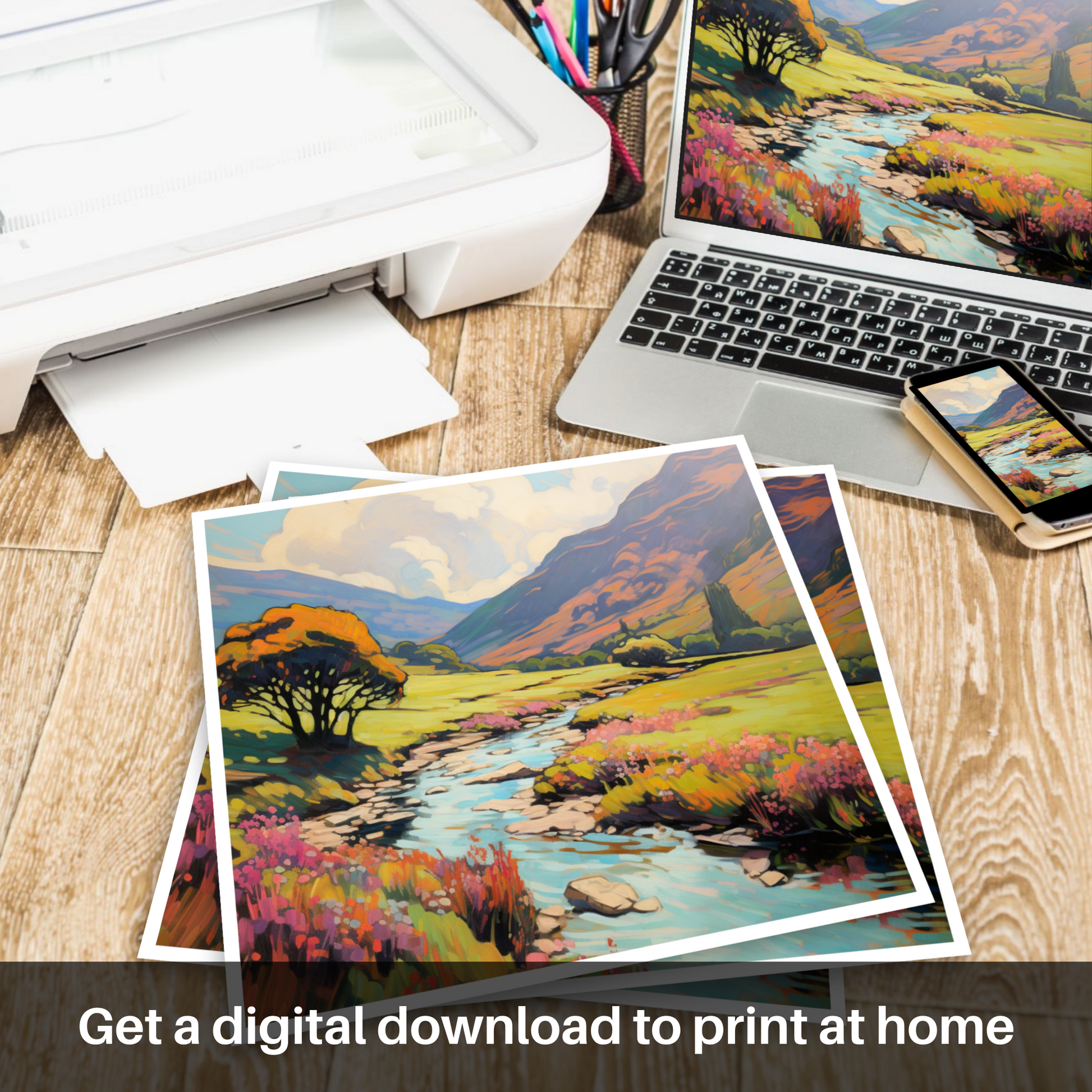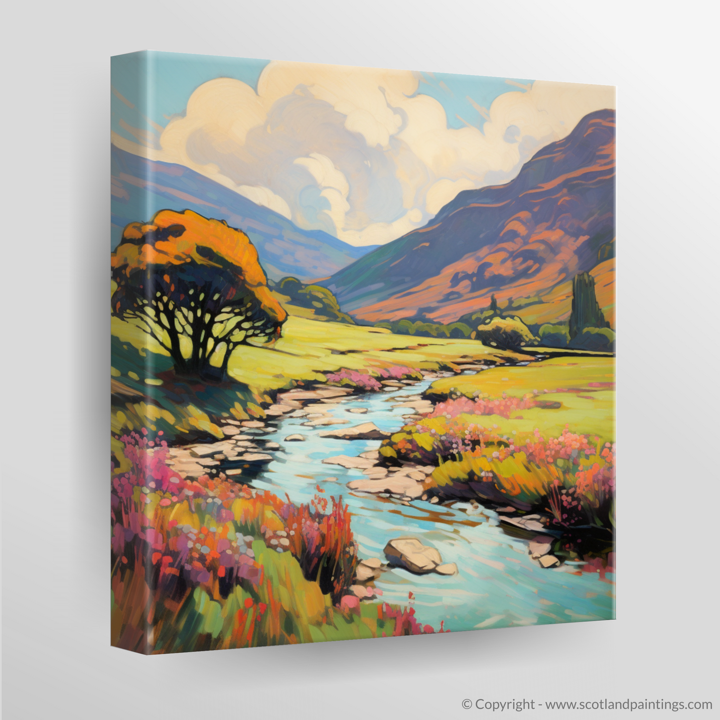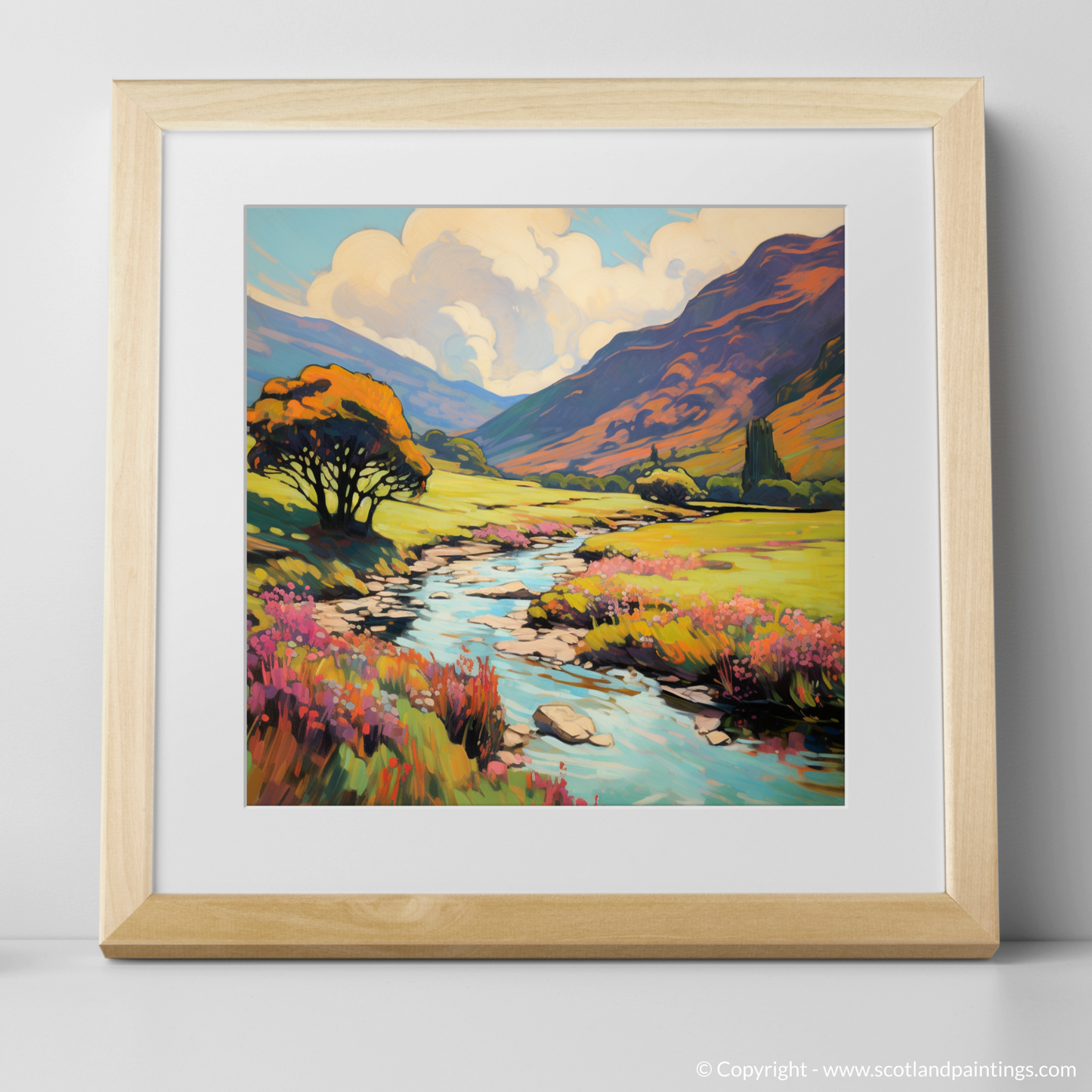 This captivating print brings to life the serene beauty of Glen Doll, Angus during the height of summer. The eye is greeted by a vibrant palette that captures the warmth of the season with hues of pink, orange, and yellow dominating the canvas, evoking the feel of a sun-drenched Scottish glen.