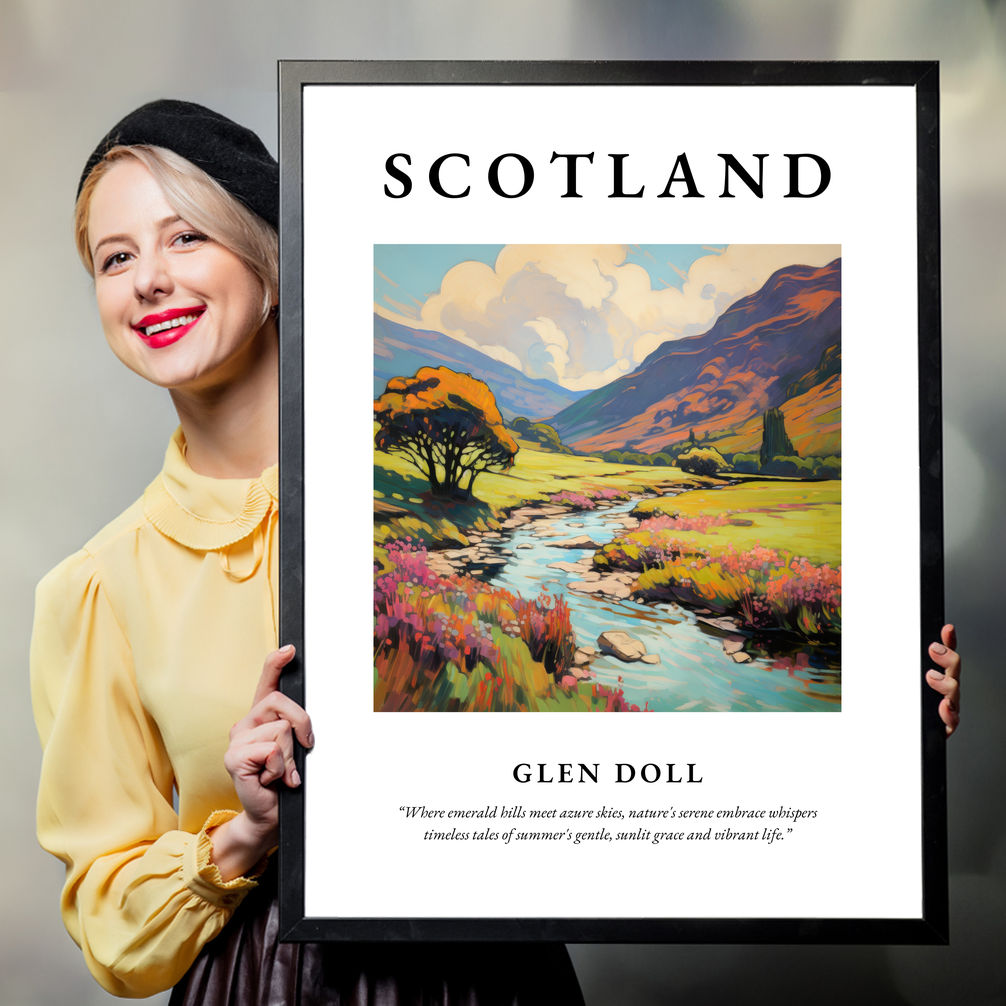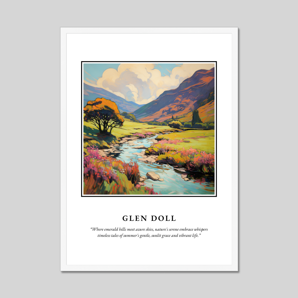 At the top, the bold lettering of "SCOTLAND" captures your attention, inviting you to delve deeper into the scene below. The focal point of this piece is a vibrant depiction of Glen Doll in summer. With sweeping emerald hills that gracefully meet azure skies, the painting evokes a sense of peace and nostalgia—a perfect keepsake for those who have visited Scotland or dream of exploring its landscapes. The vivid strokes of colour and light bring an ethereal quality, characteristic of the Impressionist style, making it an excellent addition to any art lover’s collection. Below, a poetic quote narrates the serene embrace of nature, enhancing the emotional connection to the artwork.