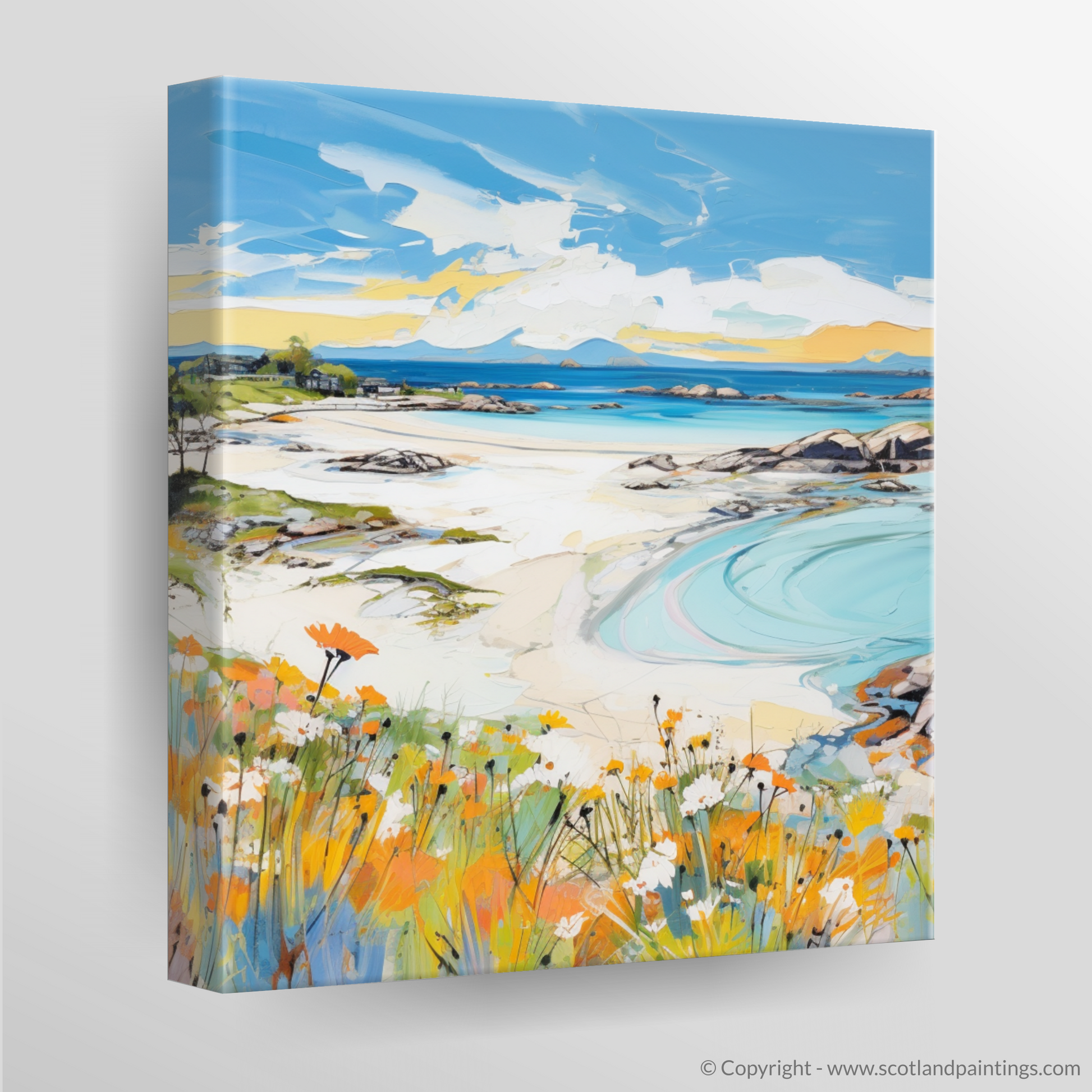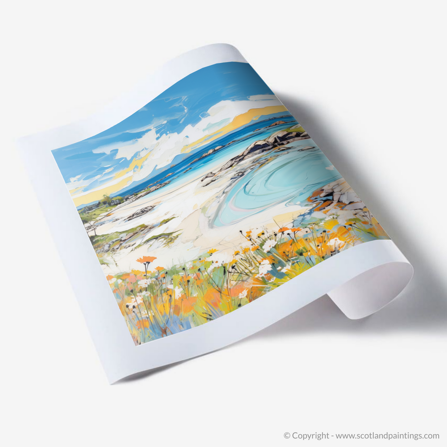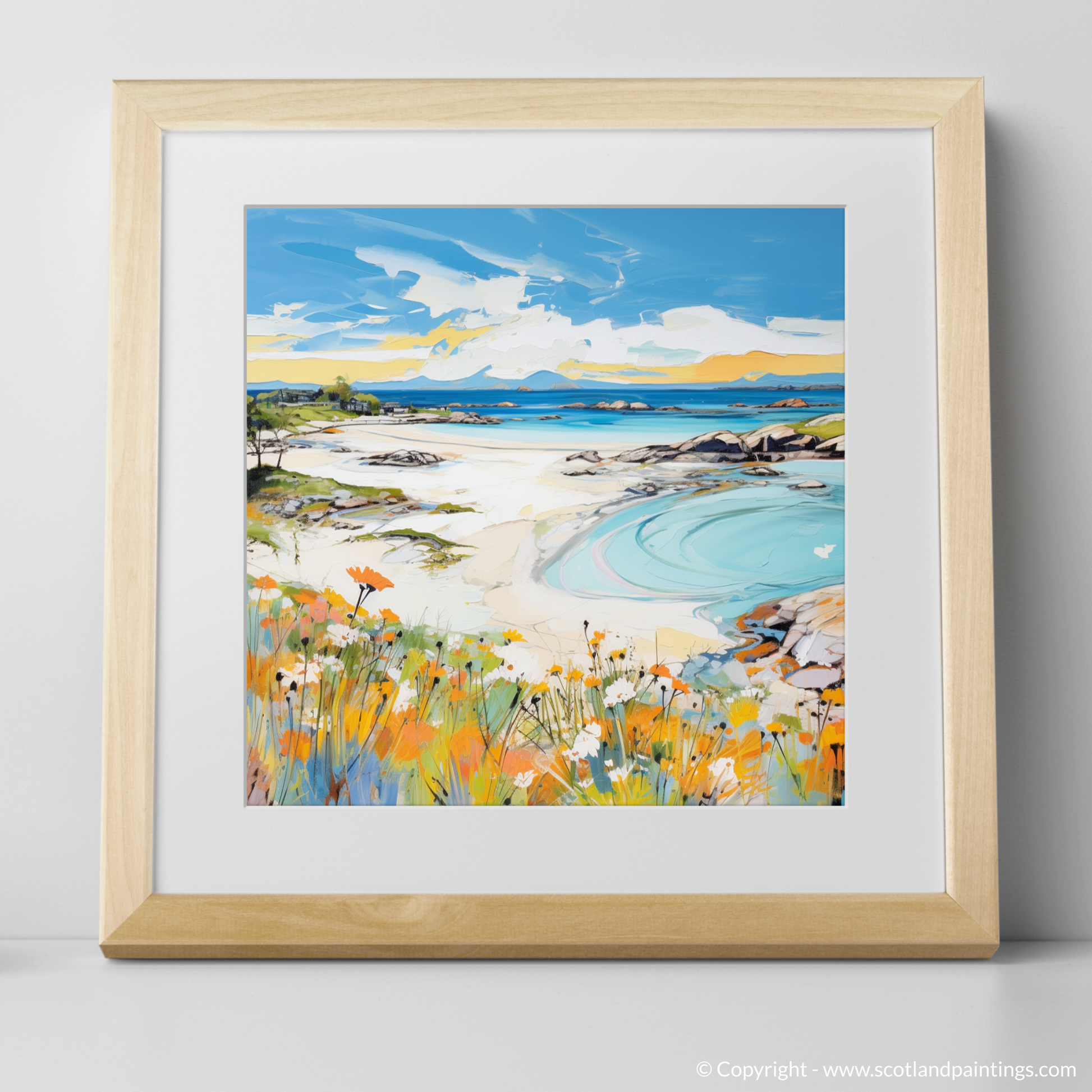 Capture the essence of a Scottish summer with this vibrant print, where the myriad hues of Arisaig Beach unfold before your eyes. The foreground is a lively celebration of wildflowers, their orange and white petals dancing amidst lush green foliage, a testament to the season's fecundity. This colourful carpet leads the eye to the sweeping sands of the beach, where the azure and turquoise waters create mesmerising patterns as they ebb against the pristine shore.