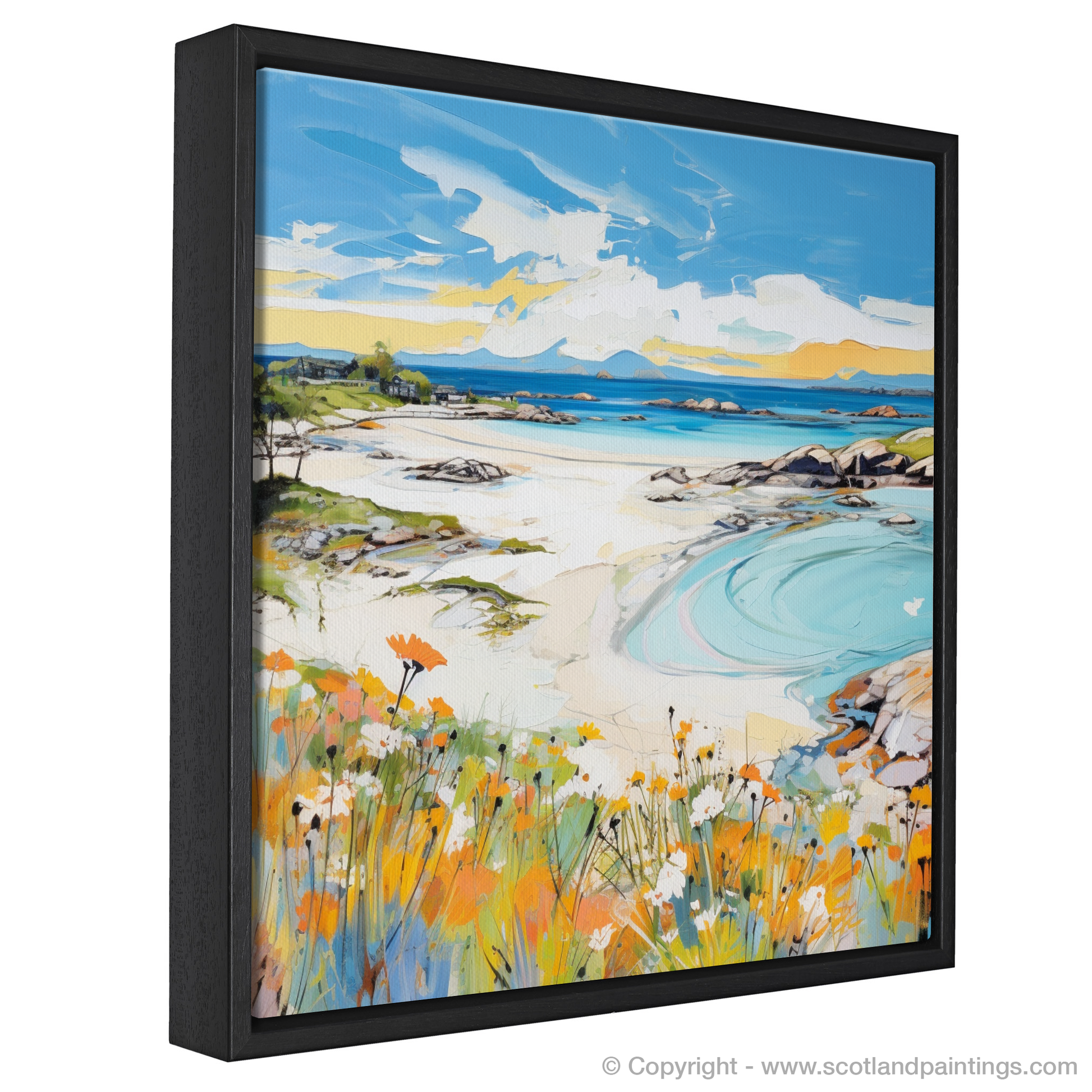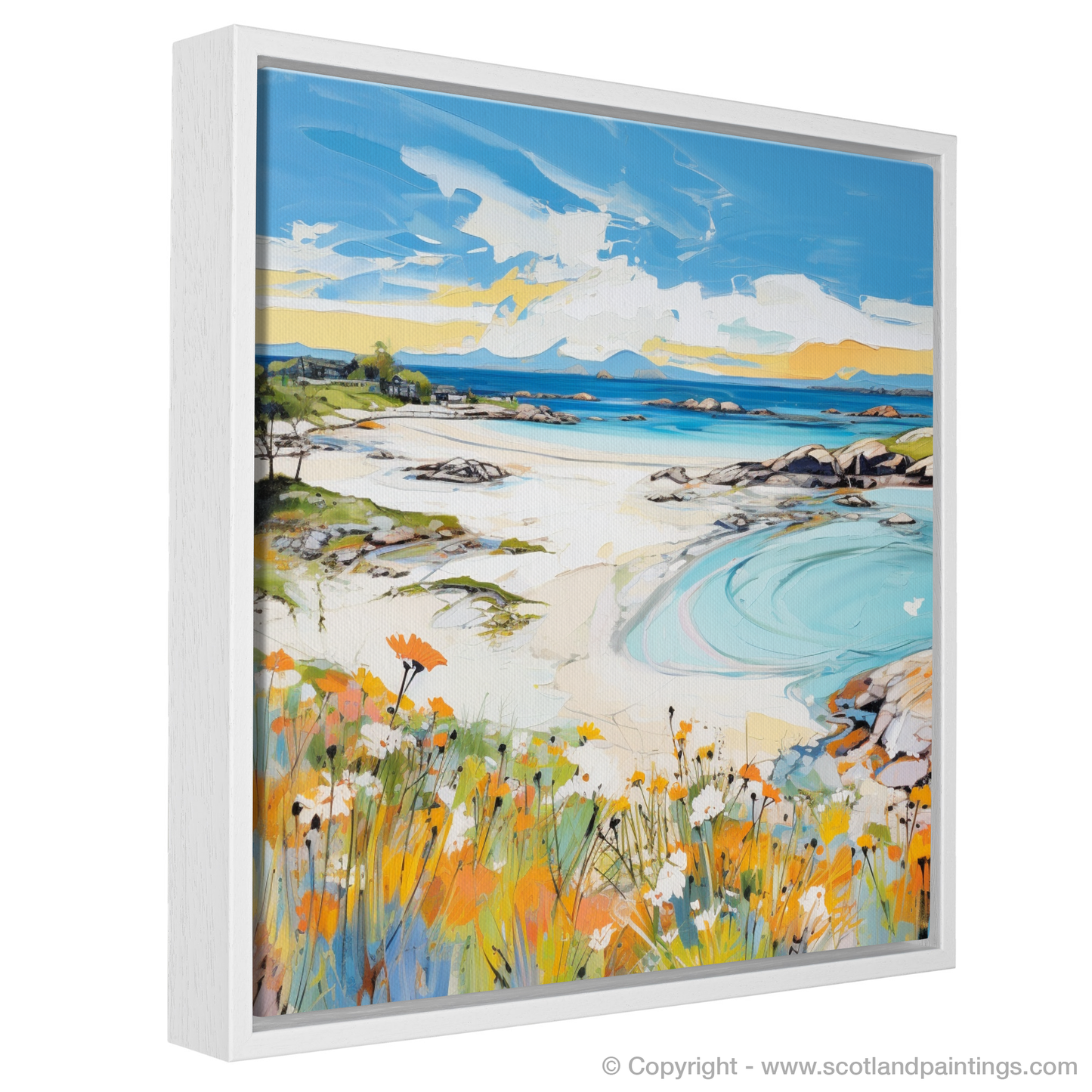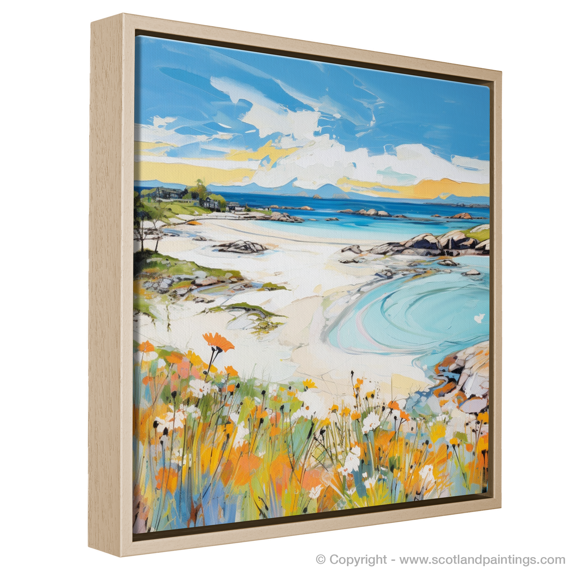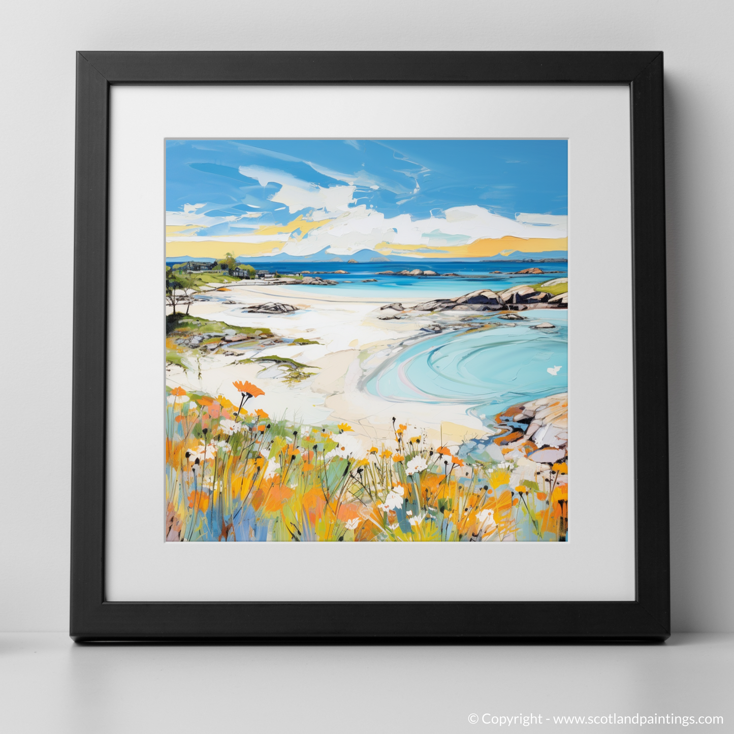 Capture the essence of a Scottish summer with this vibrant print, where the myriad hues of Arisaig Beach unfold before your eyes. The foreground is a lively celebration of wildflowers, their orange and white petals dancing amidst lush green foliage, a testament to the season's fecundity. This colourful carpet leads the eye to the sweeping sands of the beach, where the azure and turquoise waters create mesmerising patterns as they ebb against the pristine shore.