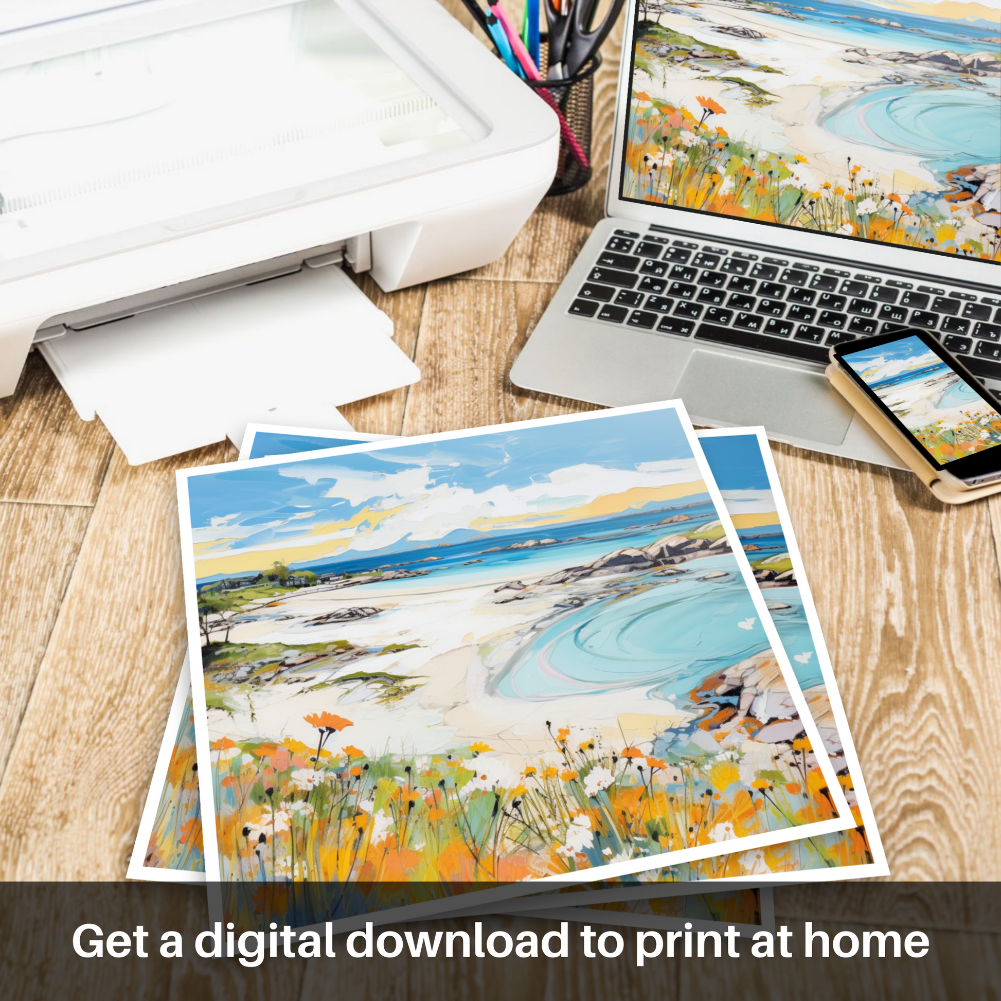 This contemporary rendition of Arisaig Beach uses bold strokes and a fresh palette, creating a dynamic interplay of colour and form that encapsulates the spirit of Scotland's summer – a perfect statement piece for your home or office, promising to infuse the space with the allure and tranquillity of this Scottish treasure.