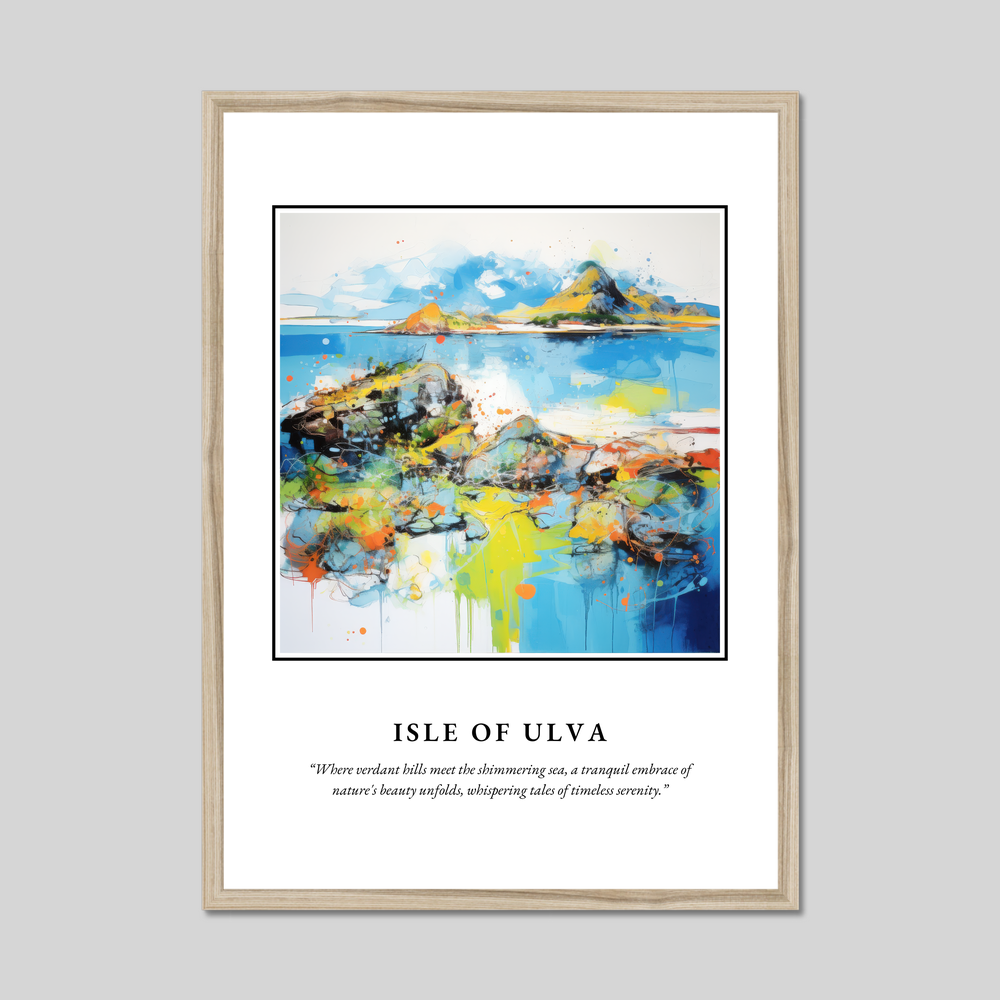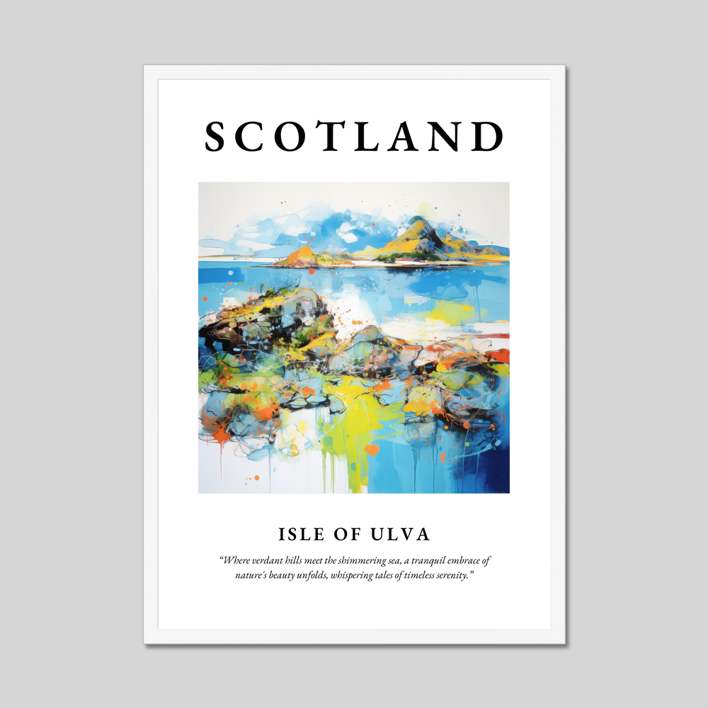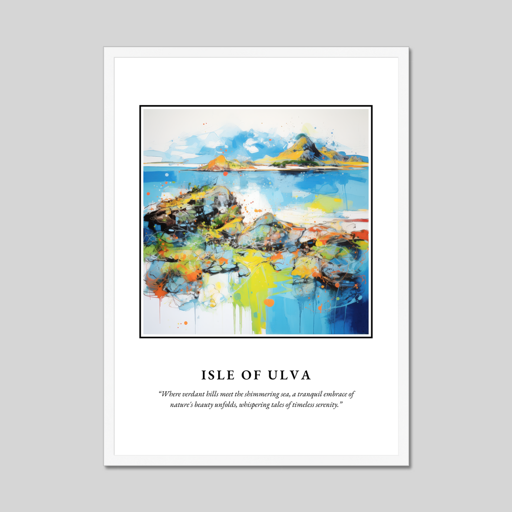 At the heart of this piece is the word “SCOTLAND,” rendered in bold lettering that captures attention and spirit. Below, the abstract painting of the Isle of Ulva bursts with dynamic colours and shapes, evocatively portraying the island’s lush landscape and tranquil seas. The vibrant splashes of blues, greens, and oranges invite viewers to lose themselves in the scene, while the accompanying quote adds poetic depth: “Where verdant hills meet the shimmering sea, a tranquil embrace of nature's beauty unfolds, whispering tales of timeless serenity.”