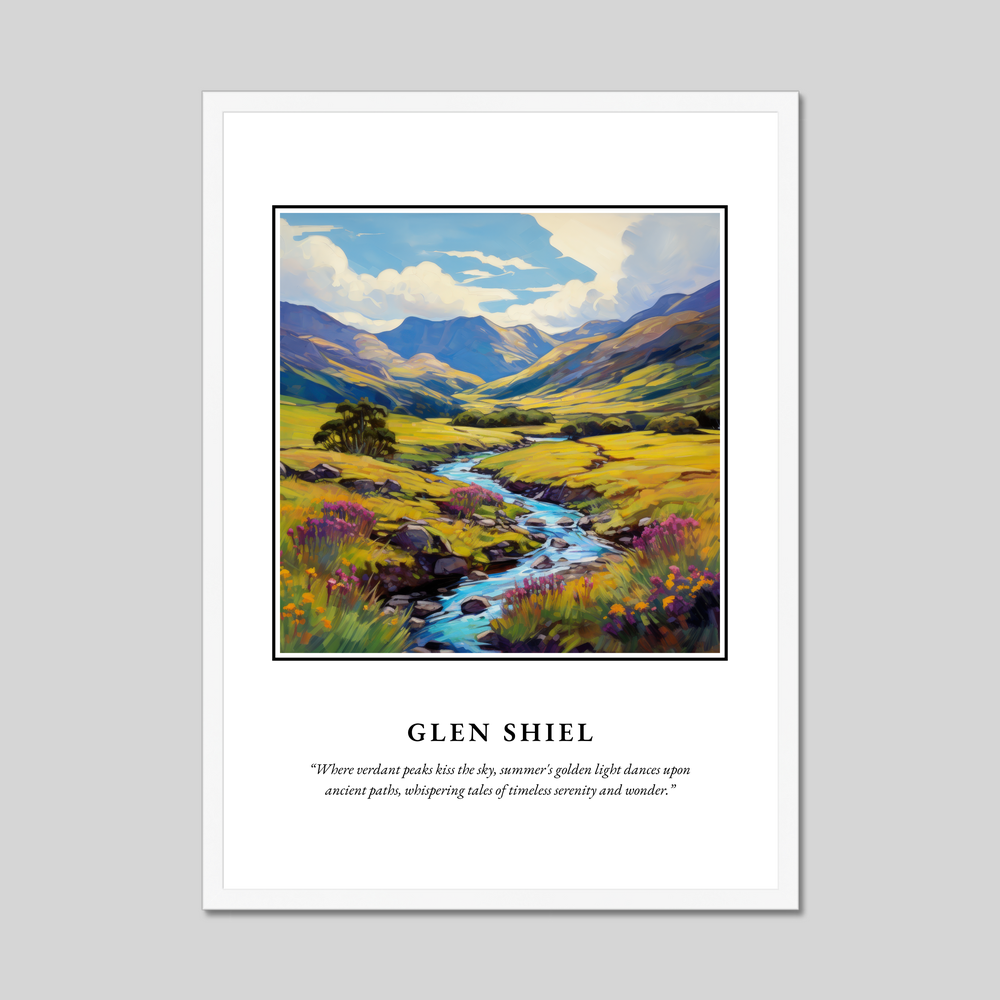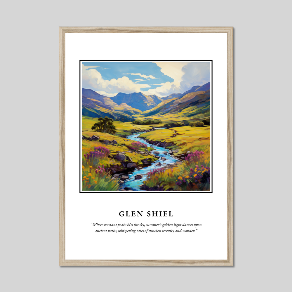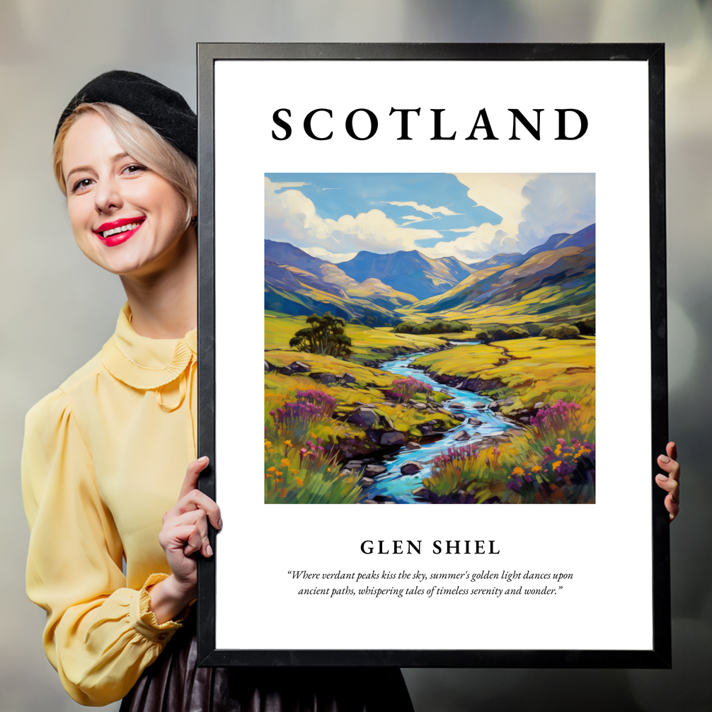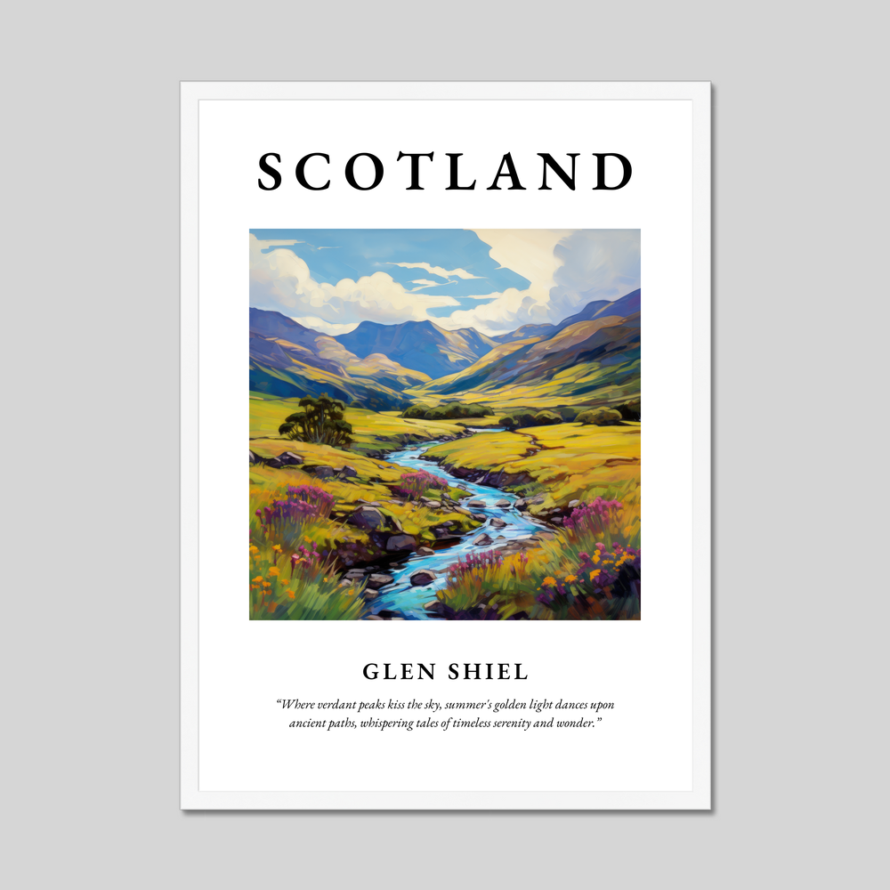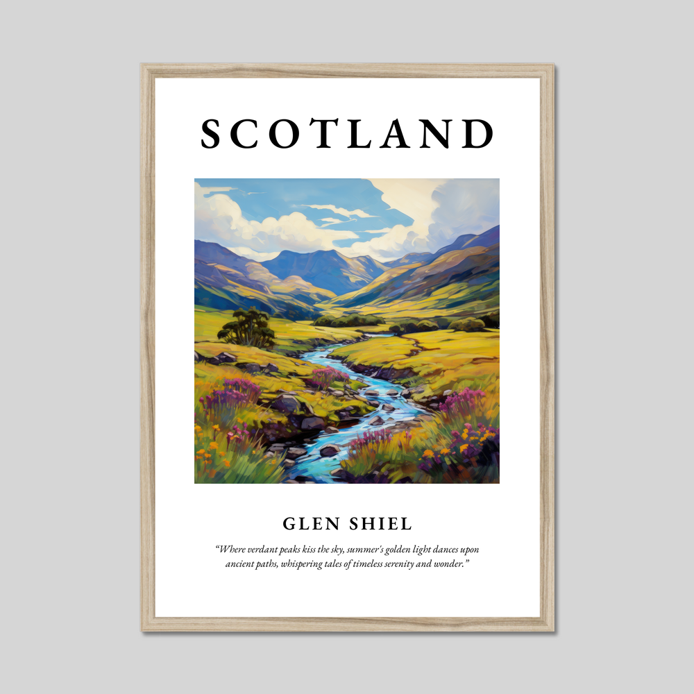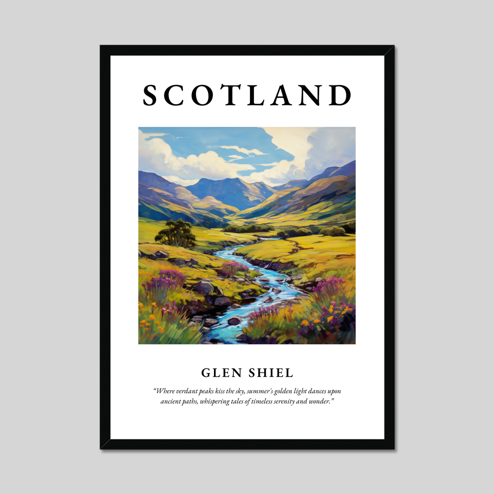 Immerse yourself in the breathtaking beauty of Scotland with our striking framed poster print, a stunning addition to any art lover's collection. Measuring a generous 50cm x 70cm, this exquisite piece captivates with its grand portrayal of Glen Shiel, effortlessly dominating your wall space and transforming your living area into a portal to the Highlands—all without breaking the bank.