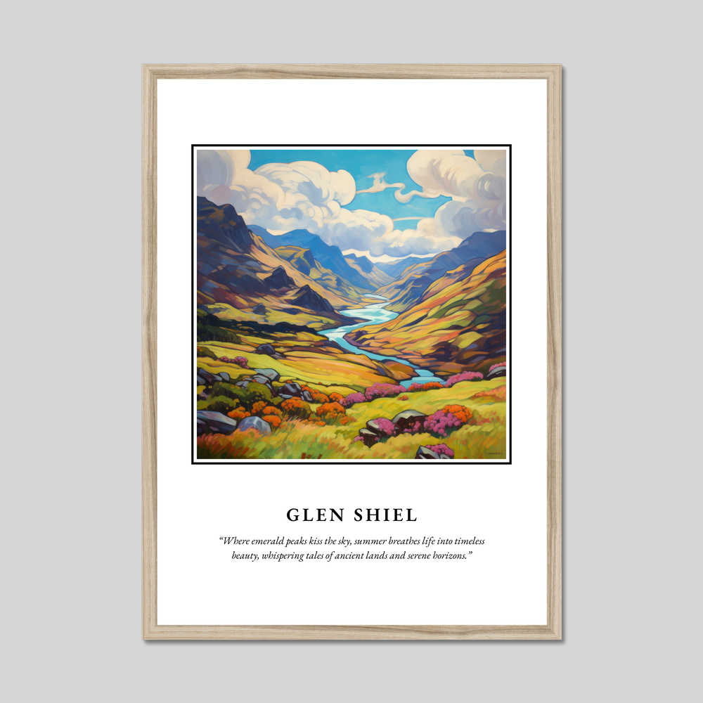 At the top of the poster, the word “SCOTLAND” stands in bold, proud lettering, setting the stage for a breathtaking journey through art. The heart of the poster is dominated by a captivating painting of Glen Shiel. Here, the emerald peaks rise against a serene sky, their lush vibrancy a testament to the untouched beauty of summer. The painting's soft brushstrokes and vibrant hues capture the essence of this beloved landscape, where nature whispers stories of old. Below the artwork, a delicate quote invites you to immerse yourself further: “Where emerald peaks kiss the sky, summer breathes life into timeless beauty, whispering tales of ancient lands and serene horizons.”
