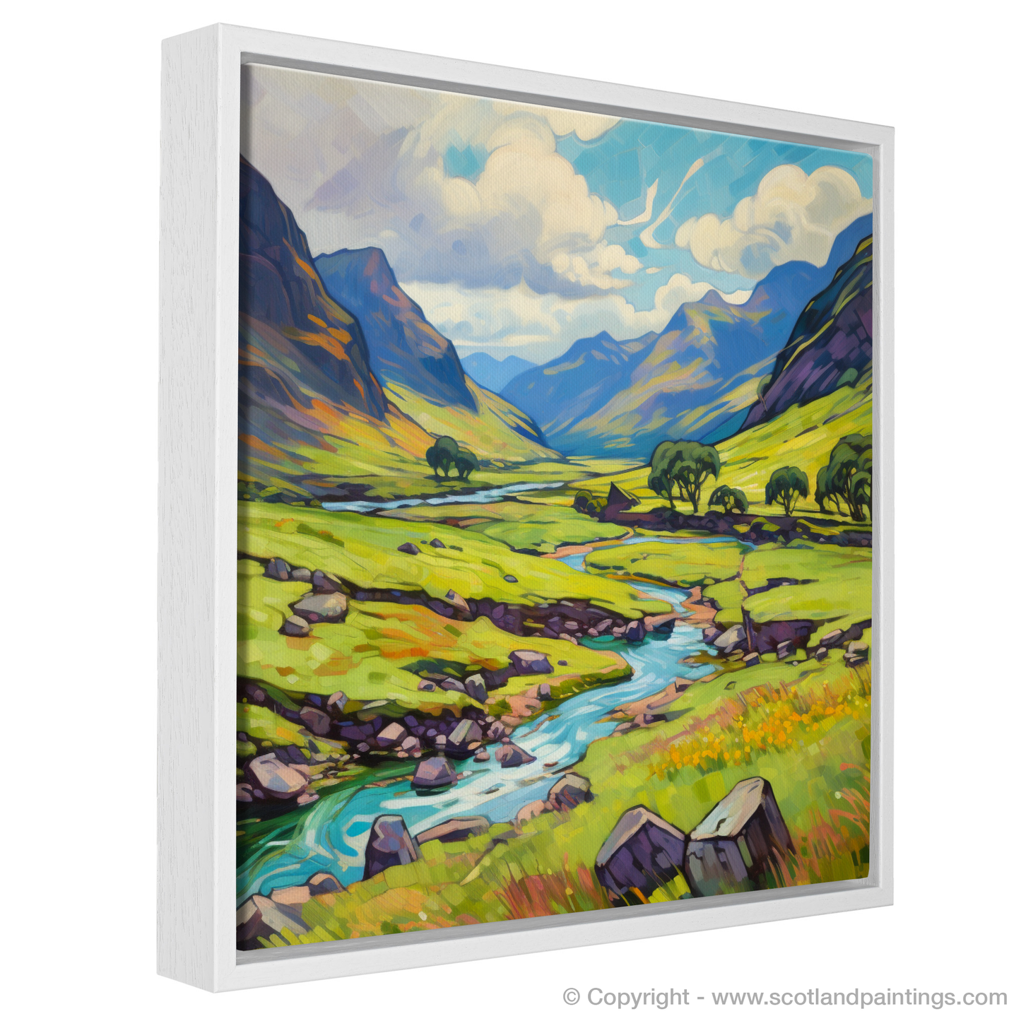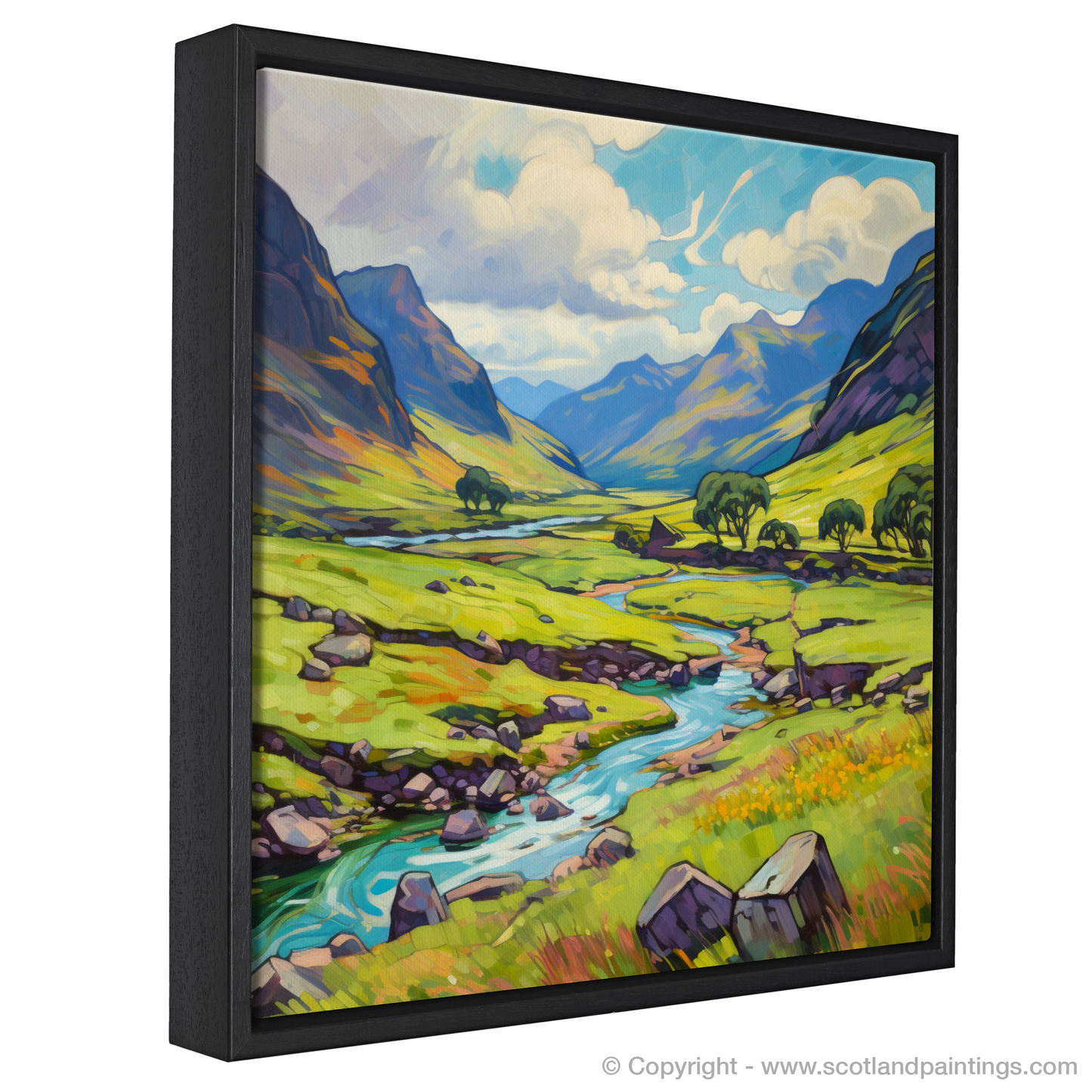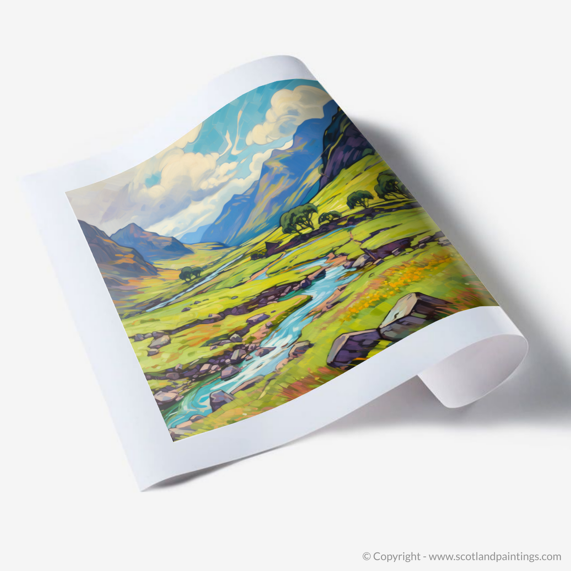 This enchanting print captures the verdant beauty of Glen Shiel, nestled in the heart of the Scottish Highlands during the lush summer months. The work is resplendent with broad strokes and vibrant hues that typify the Impressionist style, invoking a sense of the warm, fleeting nature of a highland summer day.