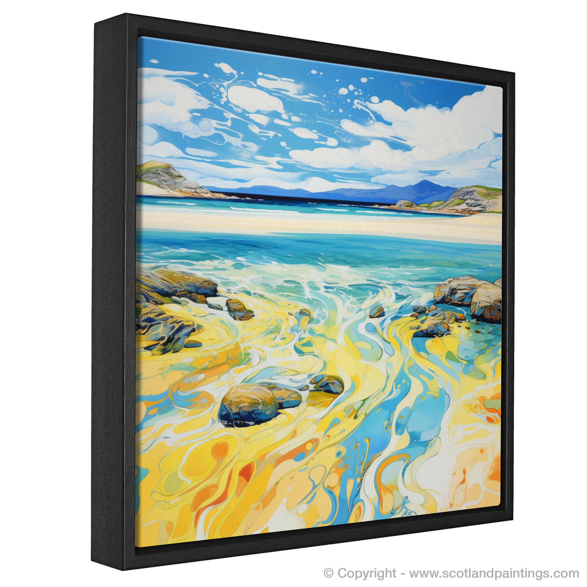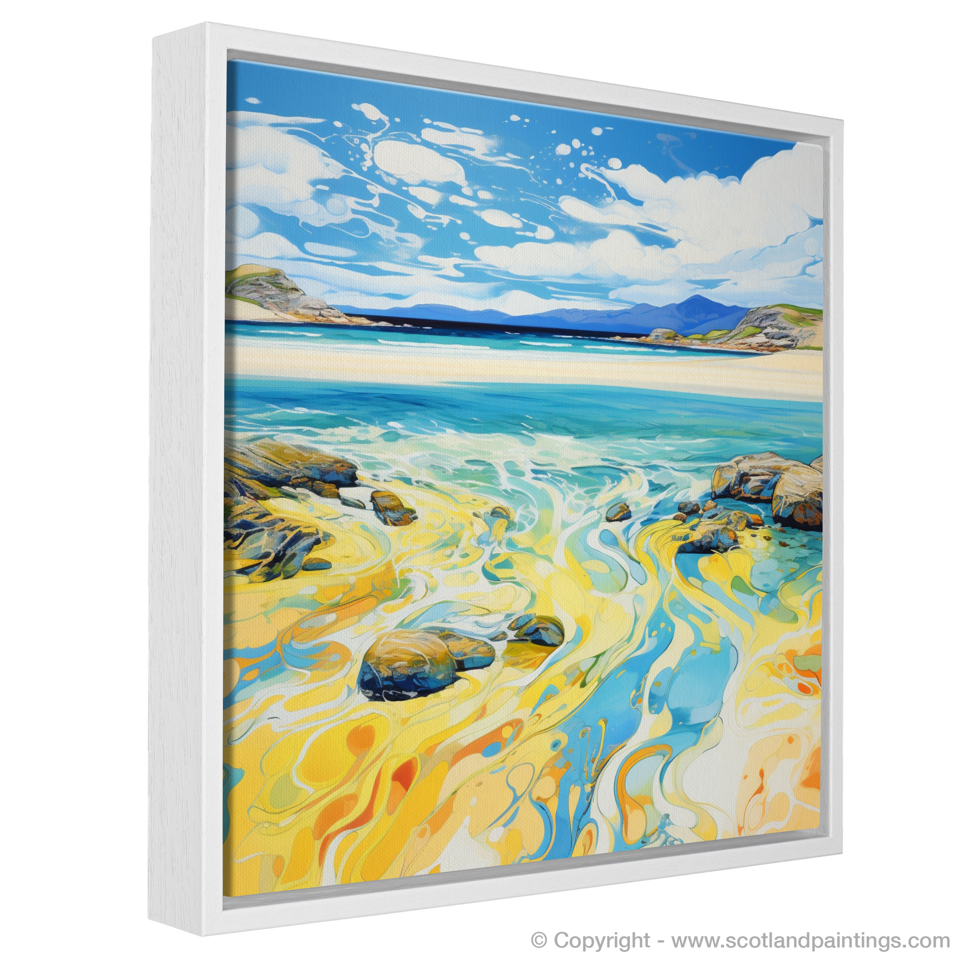 Capturing the vibrant essence of the Hebridean shoreline, this abstract depiction of Luskentyre Sands evokes the warmth and radiance of a summer day on the Isle of Lewis. The piece draws the viewer into a dynamic seascape where swirls of sunlit yellows and golds dance with the cool hues of the sea, illustrating the meeting of sand and surf. The fluidity of the abstract patterns suggests the gentle lapping of waves and the soft shift of the tide, imparting a sense of peaceful motion.