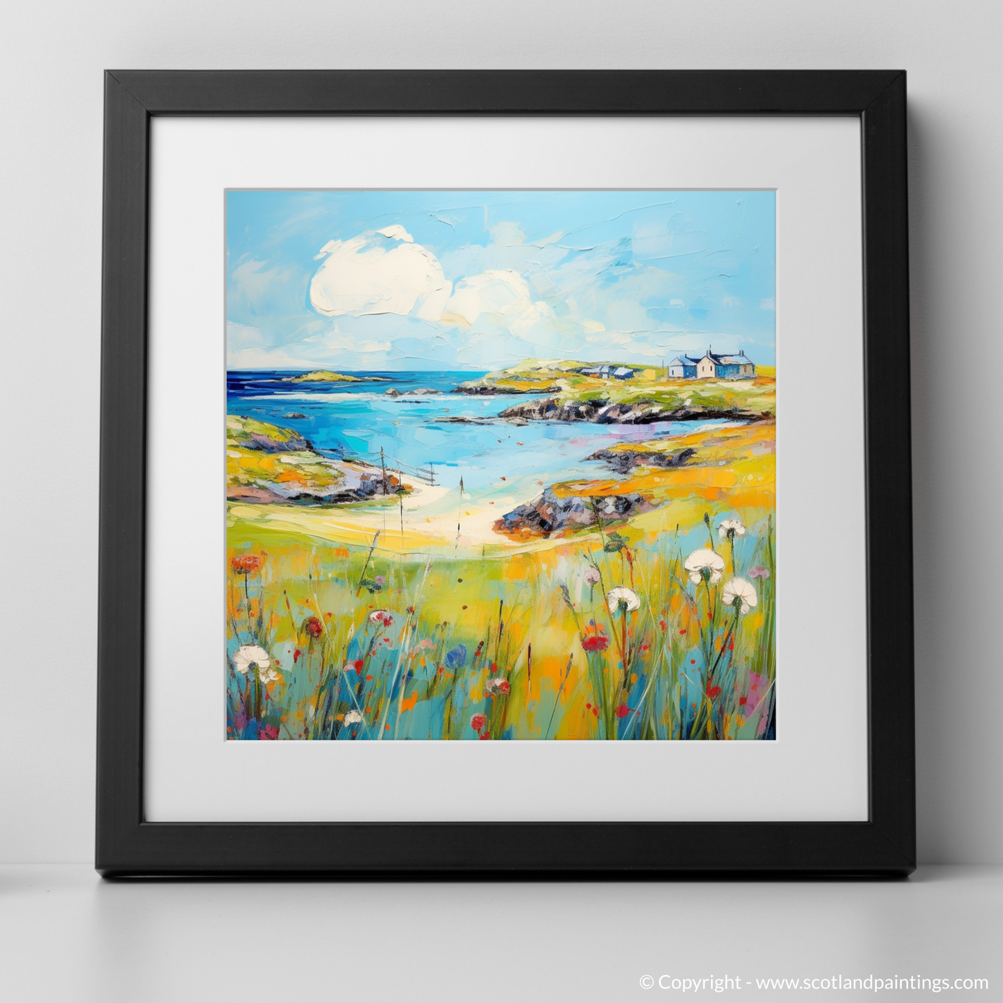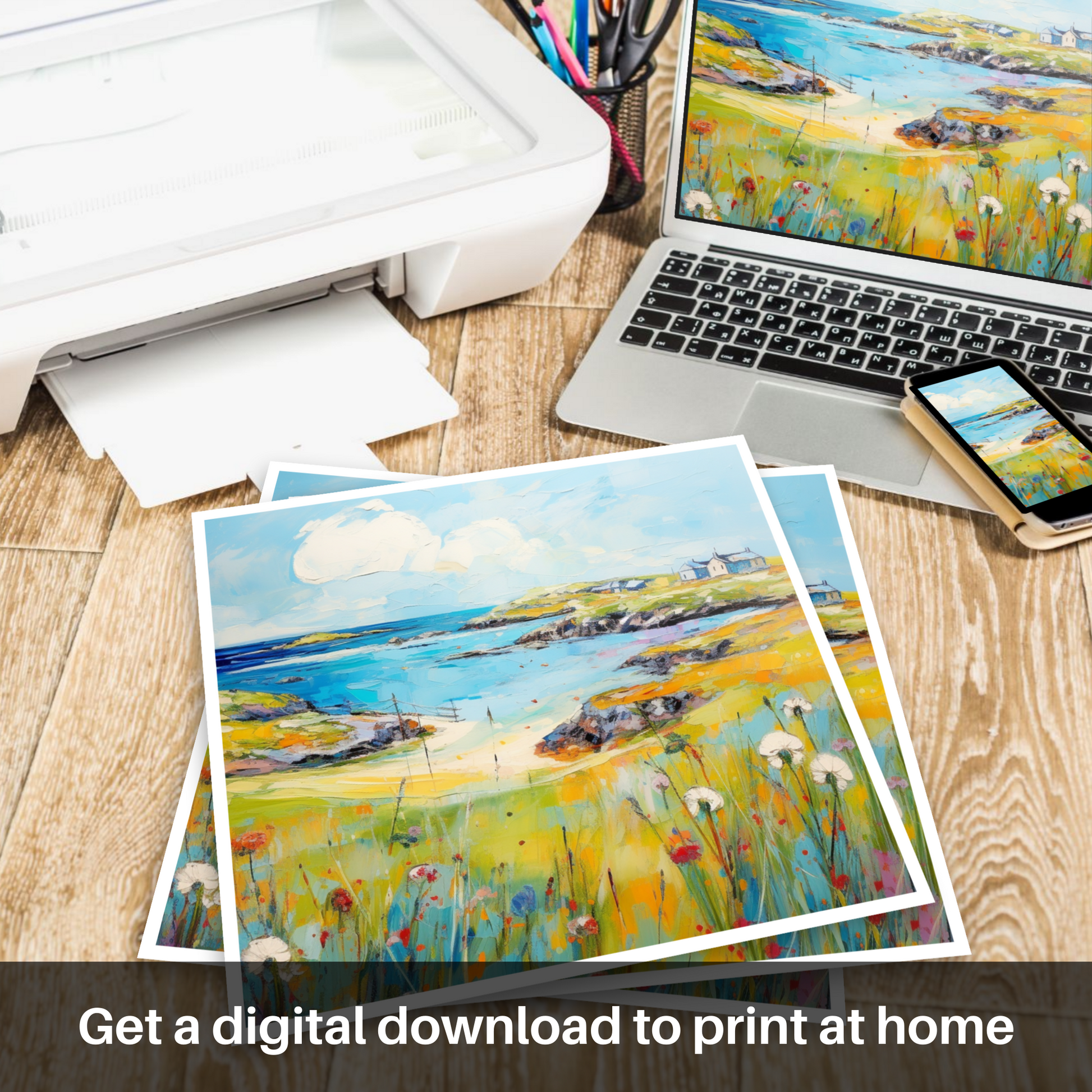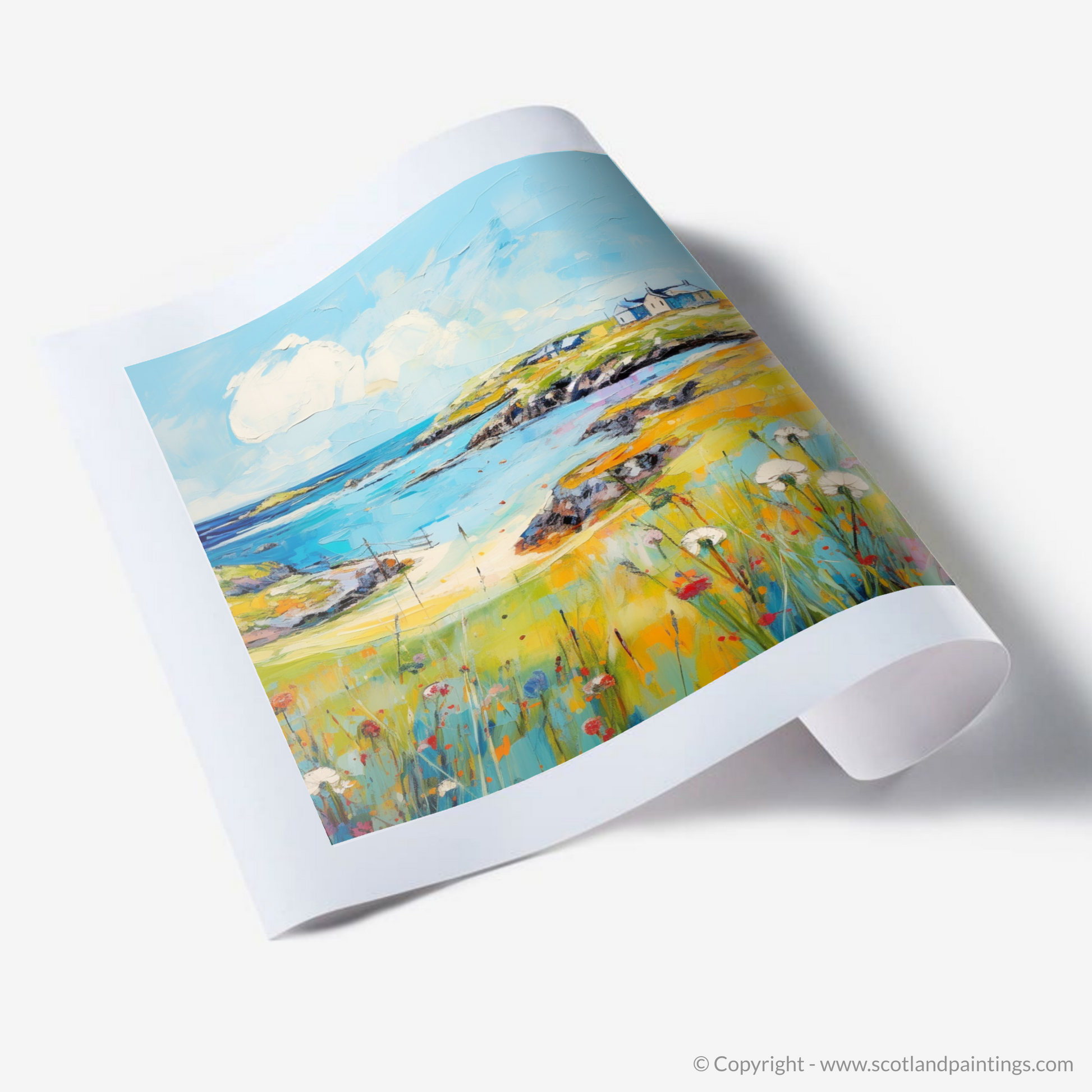 Capturing the ethereal beauty of the Isle of Lewis in the Outer Hebrides, this enchanting print brings the vibrancy of a summer in Scotland to your living space. Exquisite hues of azure and cobalt mirror the clear skies and tranquil waters, creating a serene coastal scene that is both uplifting and calming.