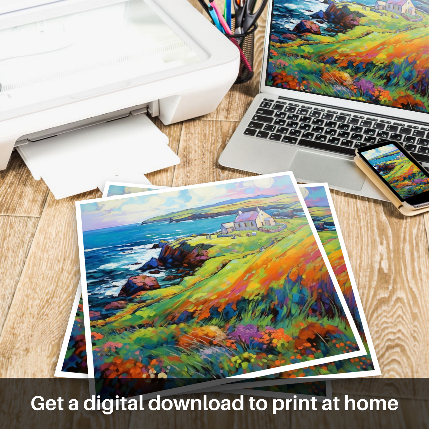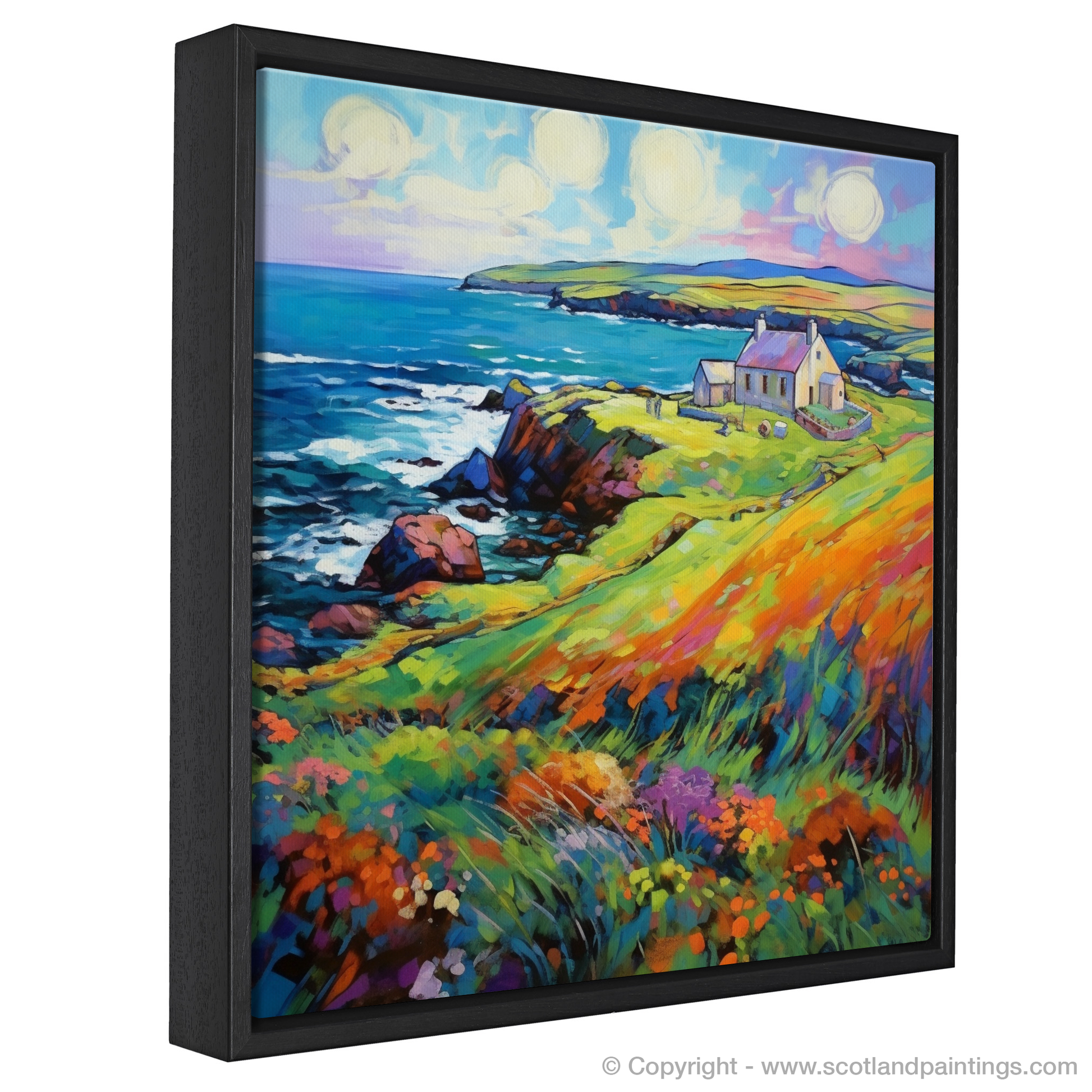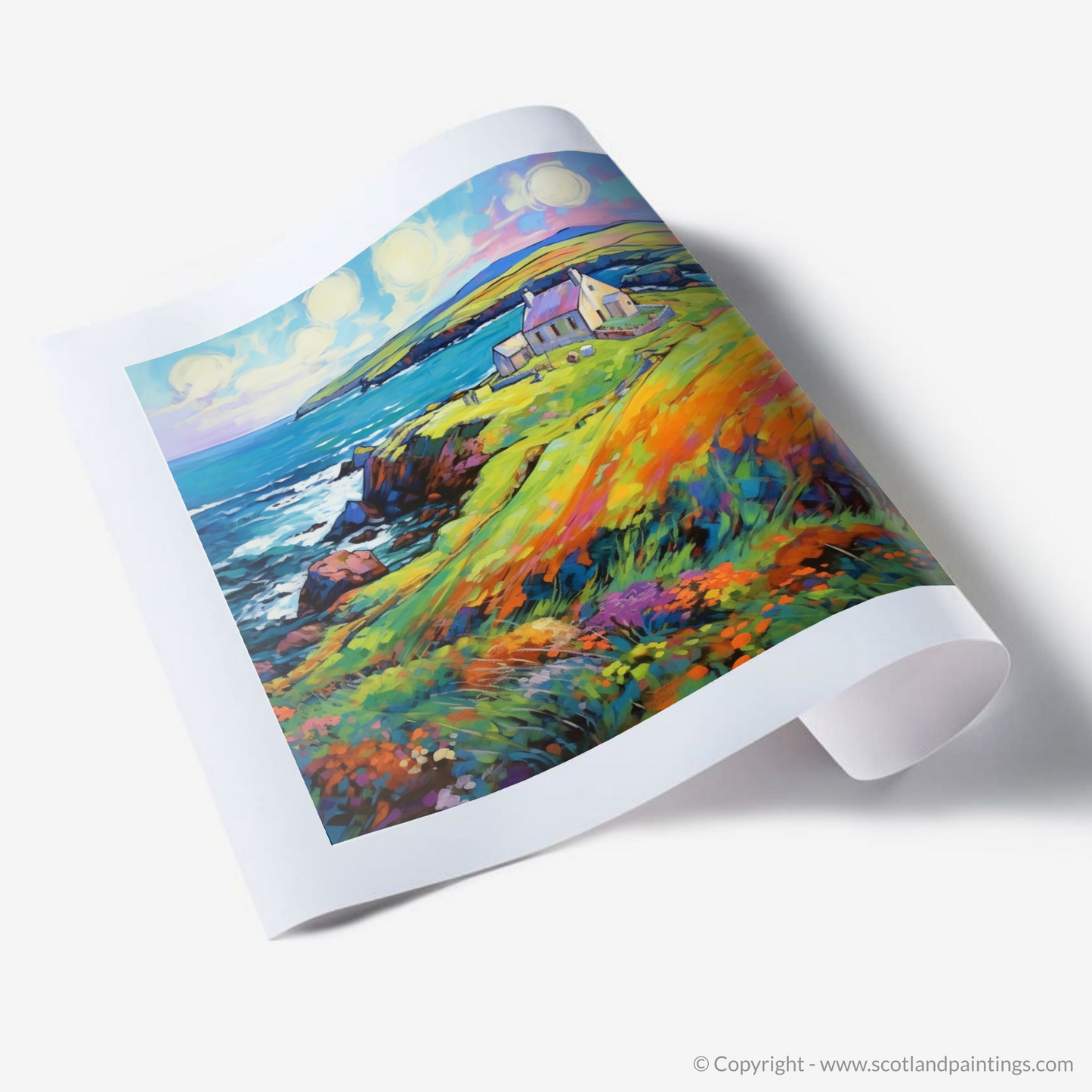 Capturing the vibrant essence of Shetland in the summertime, this expressive print is a celebration of colour and life. Bold, undisciplined brushstrokes and an exuberant palette characteristic of Fauvism bring to life a picturesque coastal scene that is both wild and inviting.