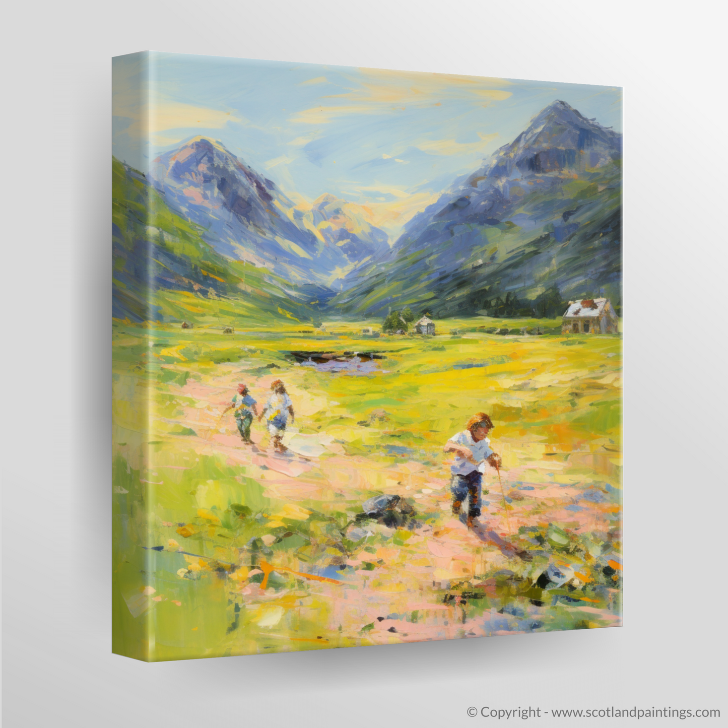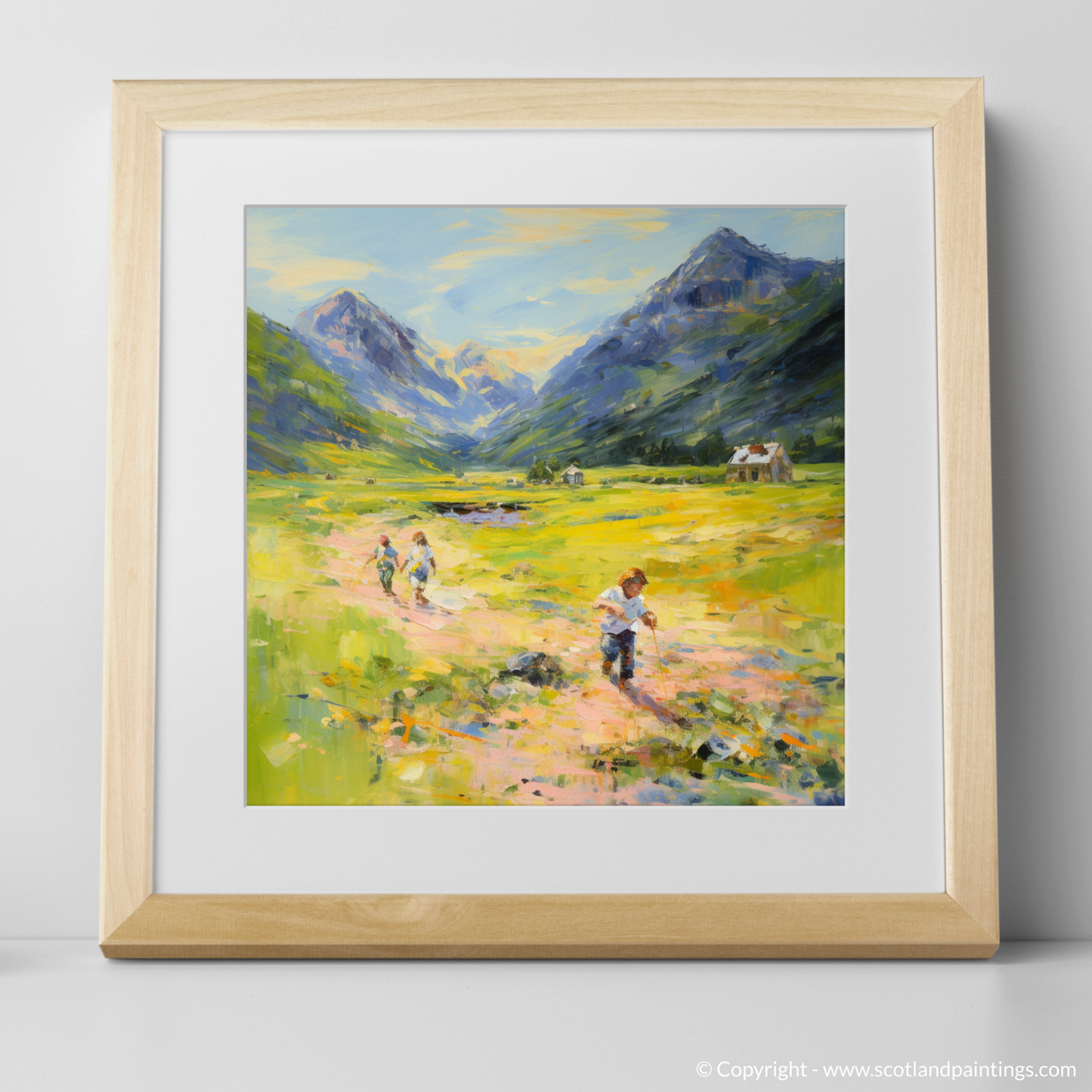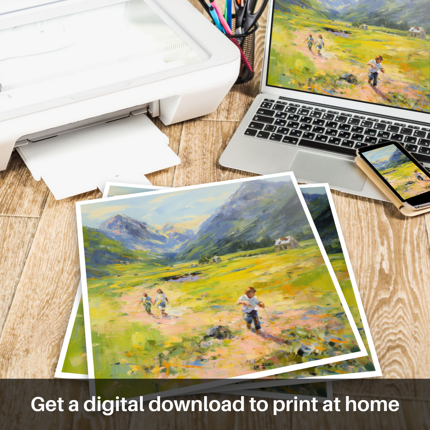 This enchanting print captures the essence of childhood and the sublime Scottish landscape in a harmonious blend, reminiscent of the Impressionist masters. Vivid, dappled sunlight bathes a verdant Glencoe valley, casting a warm glow over the meadows that stretch out towards craggy mountain peaks piercing the azure sky. The brushstrokes convey a sense of movement and lightness, with the play of shadows and sun accentuating the undulating terrain.