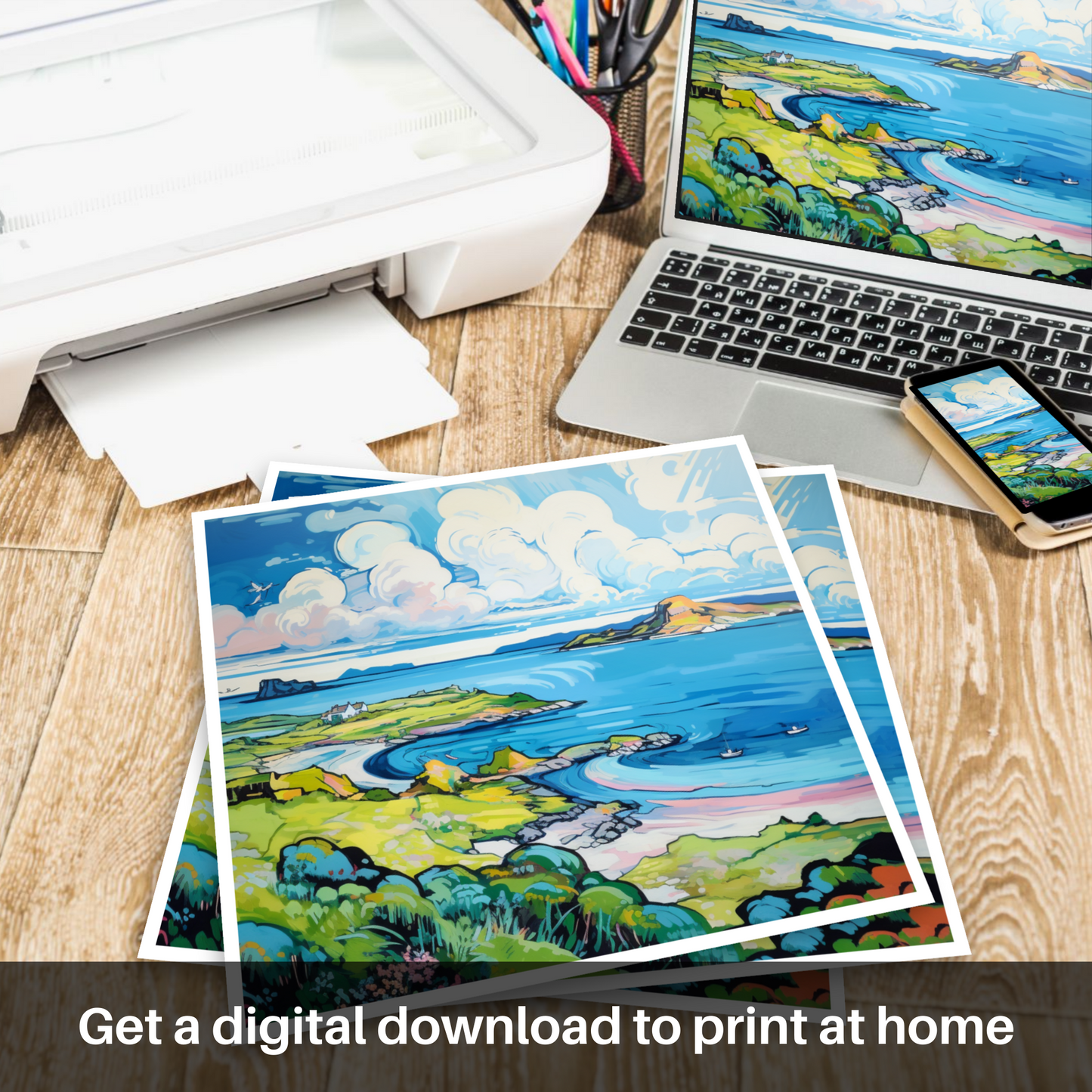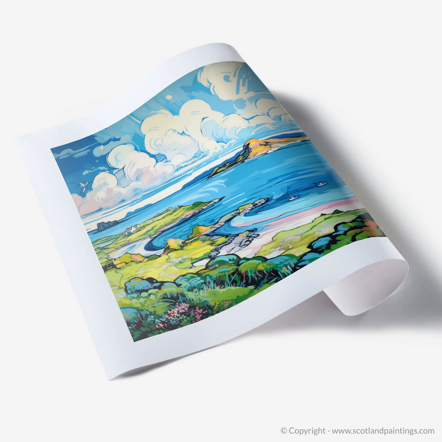 This print is a tribute to the wild, untamed spirit of Scotland's natural wonders, and will undoubtedly serve as a vibrant focal point in any space it graces, inviting viewers to lose themselves in its rich, joyful palette and the serene atmosphere of a Scottish summer by the sea.